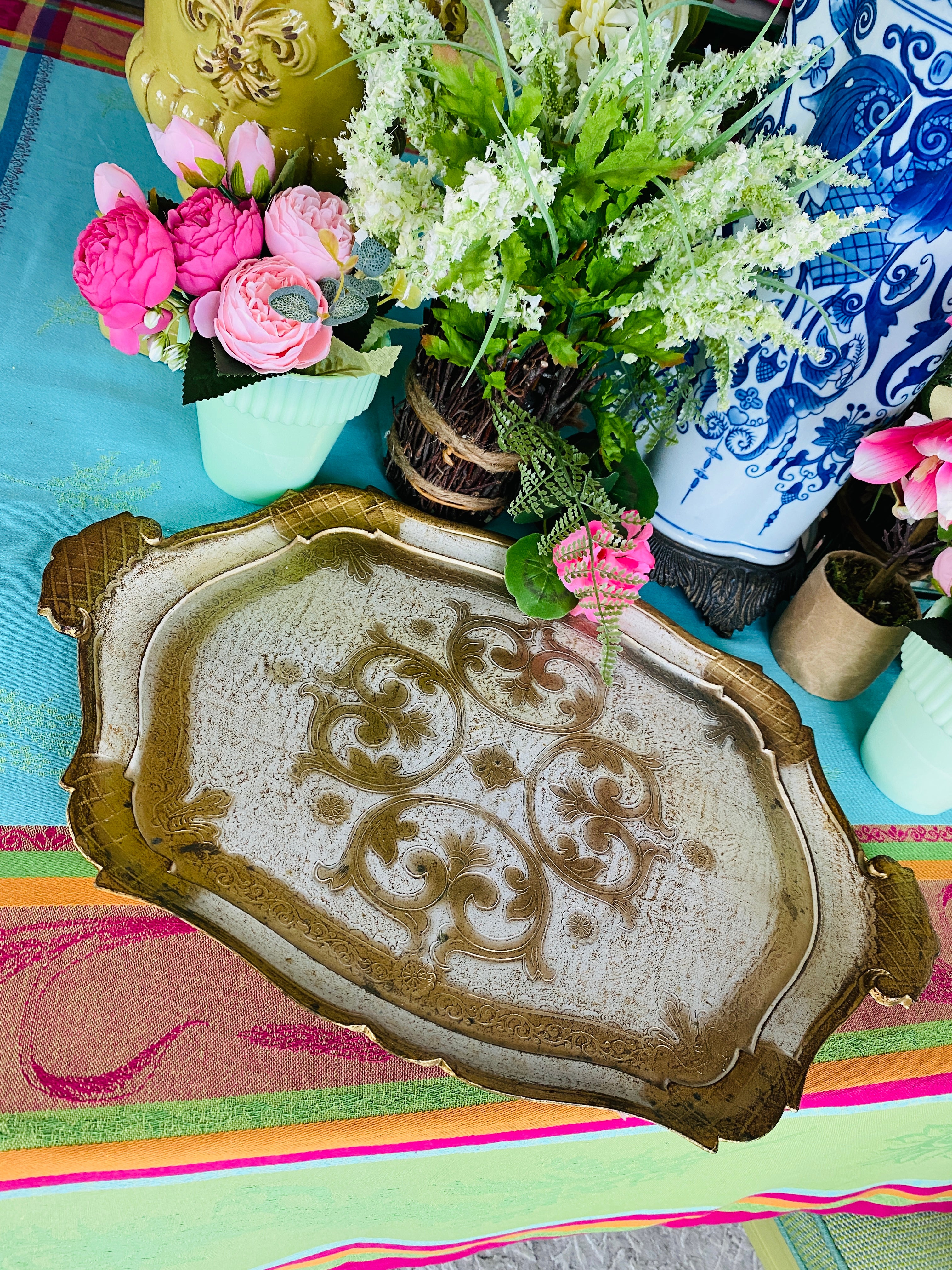 Vintage Florentine Tray, Italian, Pink, Yellow, Gold, Handled