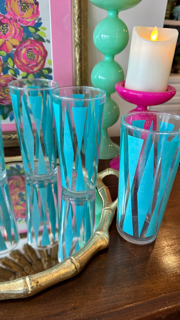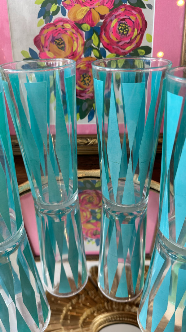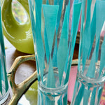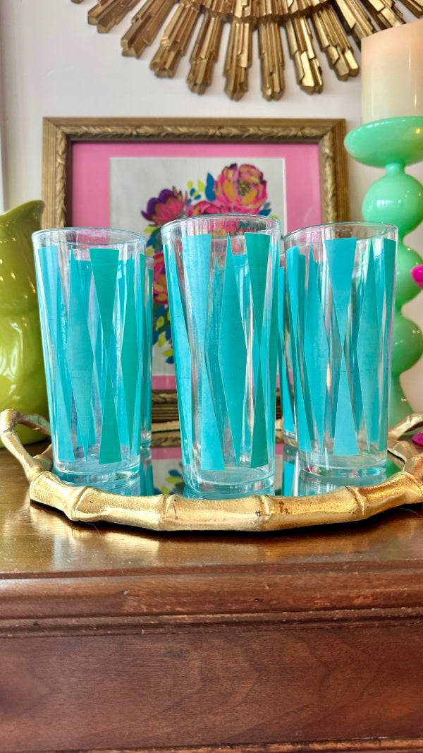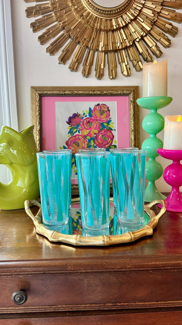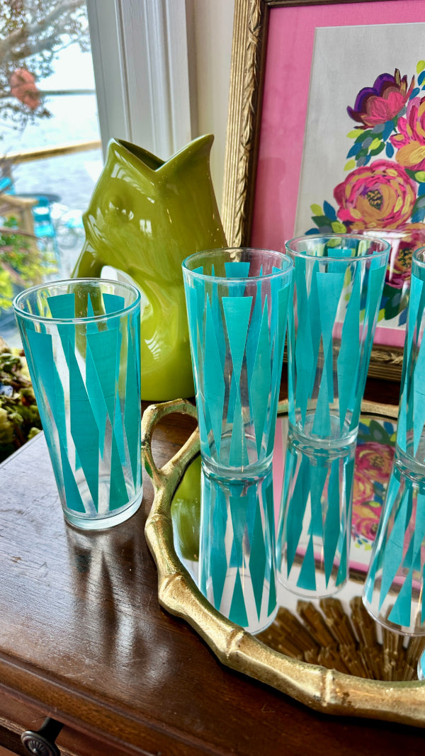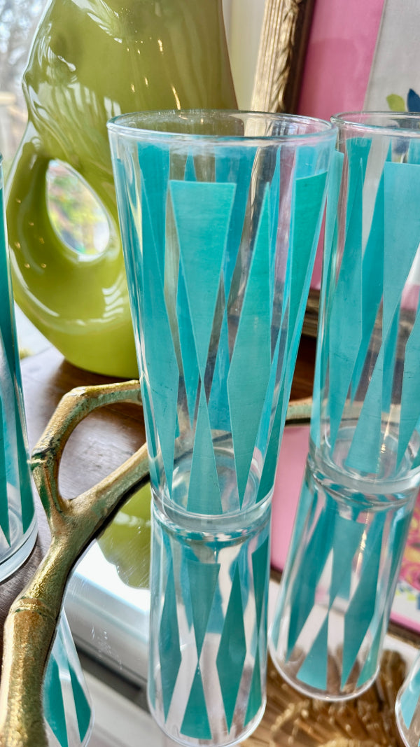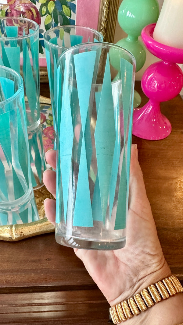Bring a pop of retro charm to your table with this set of 1960s Mid-Century Hazel Atlas highball glasses in striking turquoise with a bold diamond pattern. These stylish vintage drinking glasses capture the clean lines and vibrant color palette that defined mid-century design. Perfect for entertaining or everyday use, they add a splash of personality to any bar or kitchen. Crafted with the quality and durability Hazel Atlas is known for, these glasses are as functional as they are collectible.