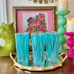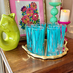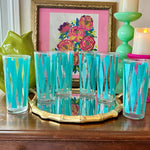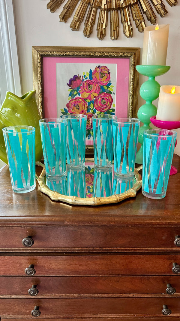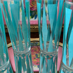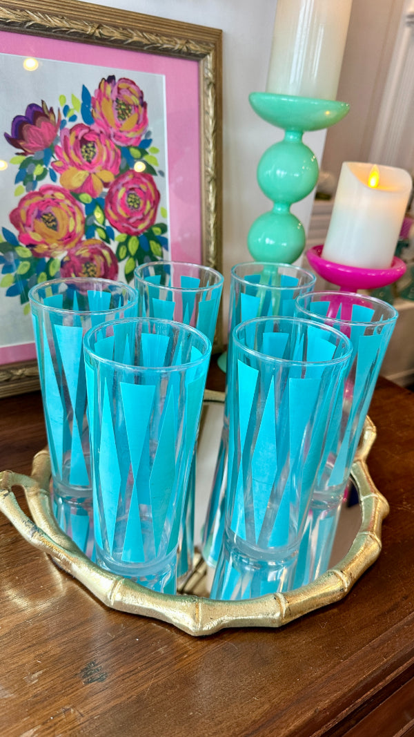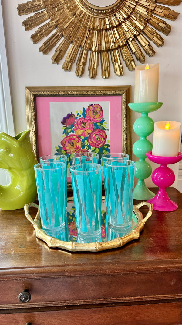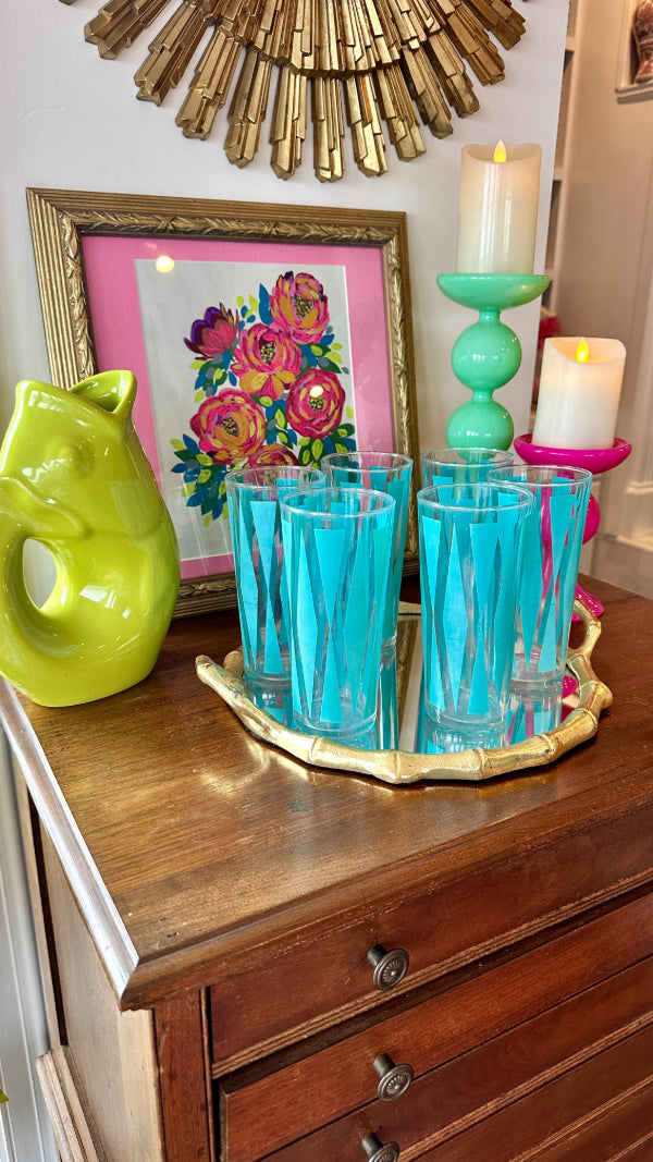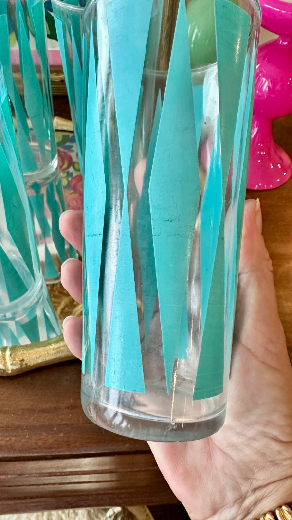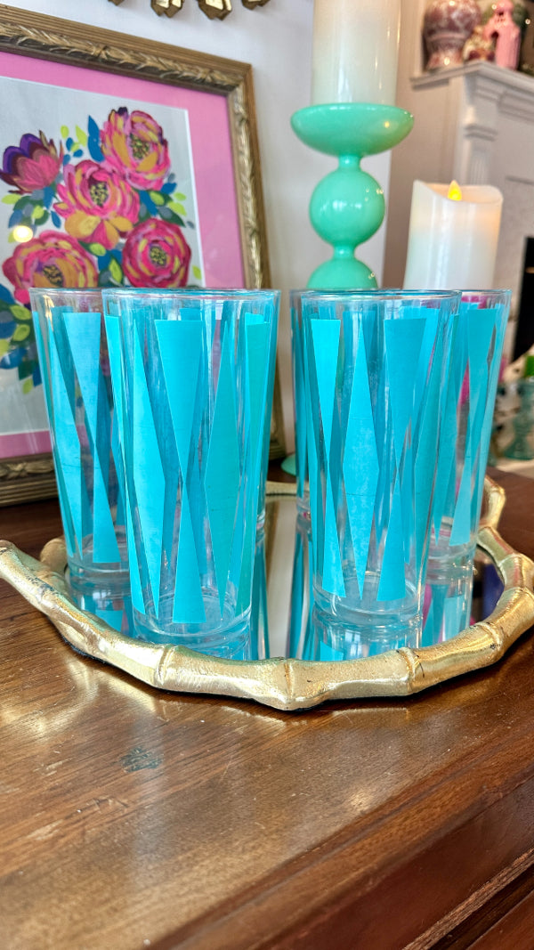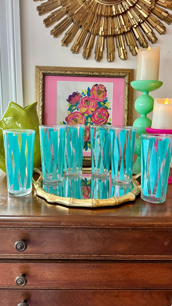 Bring a pop of retro charm to your table with this set of 1960s Mid-Century Hazel Atlas highball glasses in striking turquoise with a bold diamond pattern. These stylish vintage drinking glasses capture the clean lines and vibrant color palette that defined mid-century design. Perfect for entertaining or everyday use, they add a splash of personality to any bar or kitchen. Crafted with the quality and durability Hazel Atlas is known for, these glasses are as functional as they are collectible.