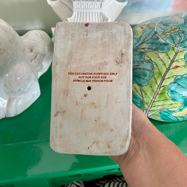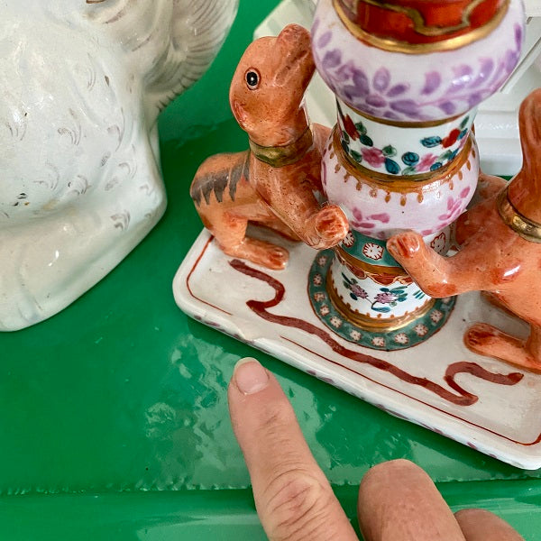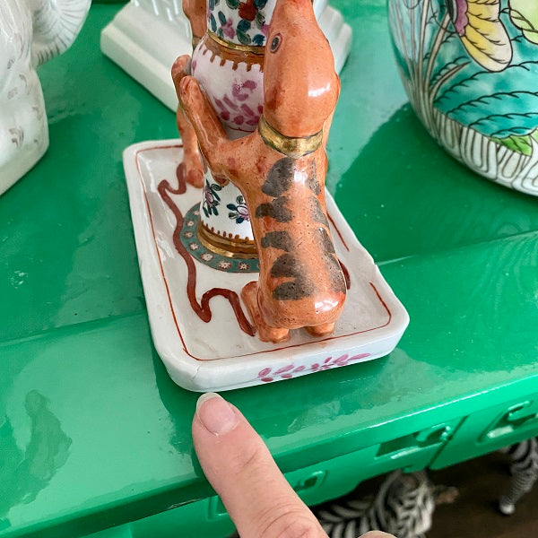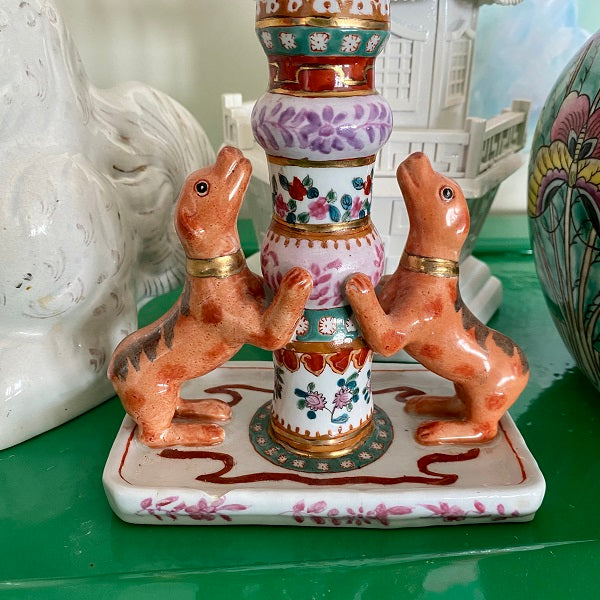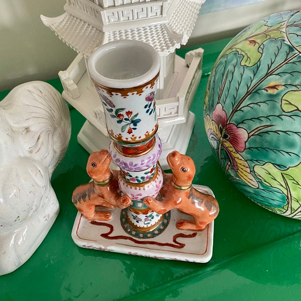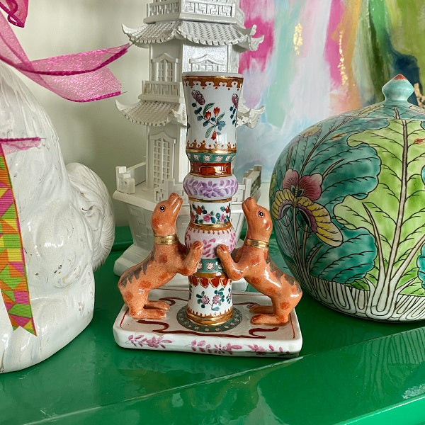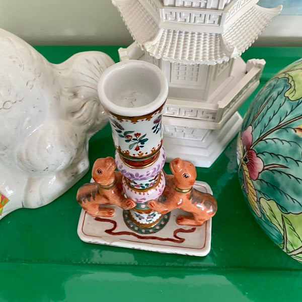 A gorgeous, colorful and unique porcelain candle holder with bright flowers and 2 dogs "jumping up" at the bottom. This is a whimsical piece perfect to add to a shelf, bookcase or tabletop. Hand painted and ready to display. Remember that vintage is well loved and there are often imperfections. These do not distract from the beauty of this piece.