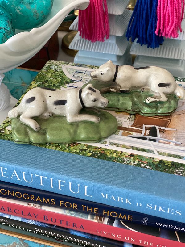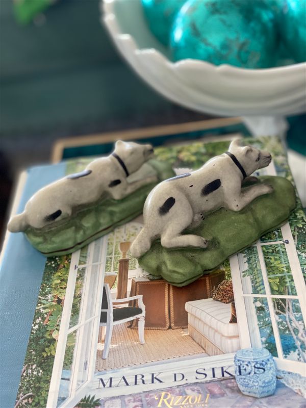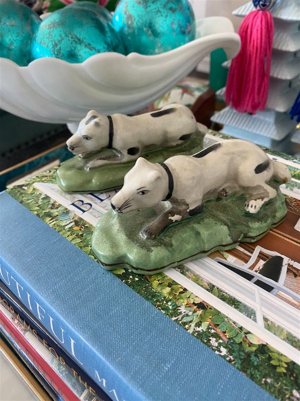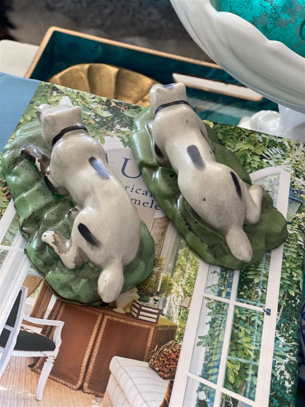 Pair of reproduction staffordshire style dog figurines . Black and white dogs lying down on green grass. Perfect vintage condition. Great to use on a bookshelf, china cabinet, curio cabinet.
