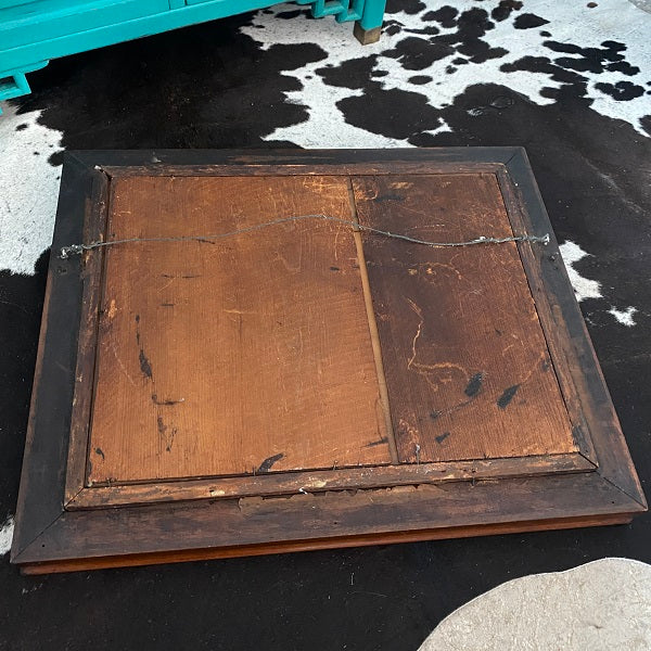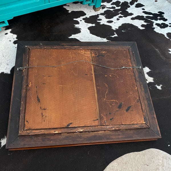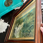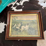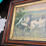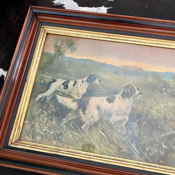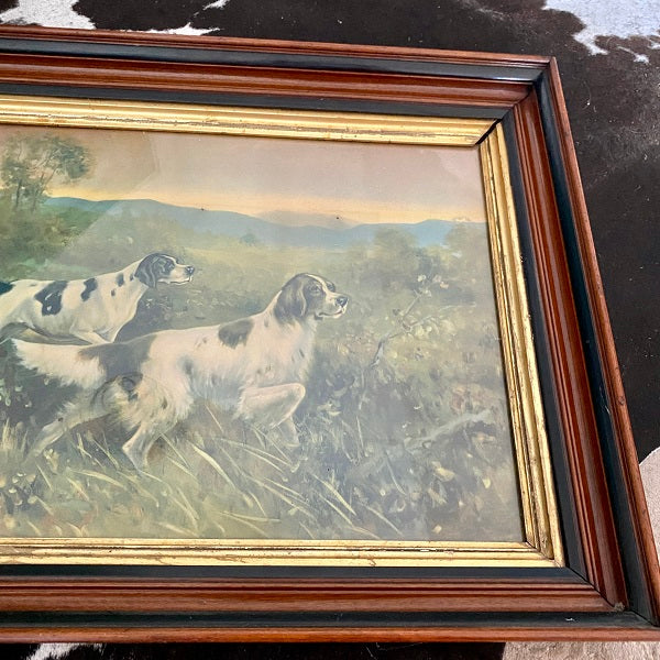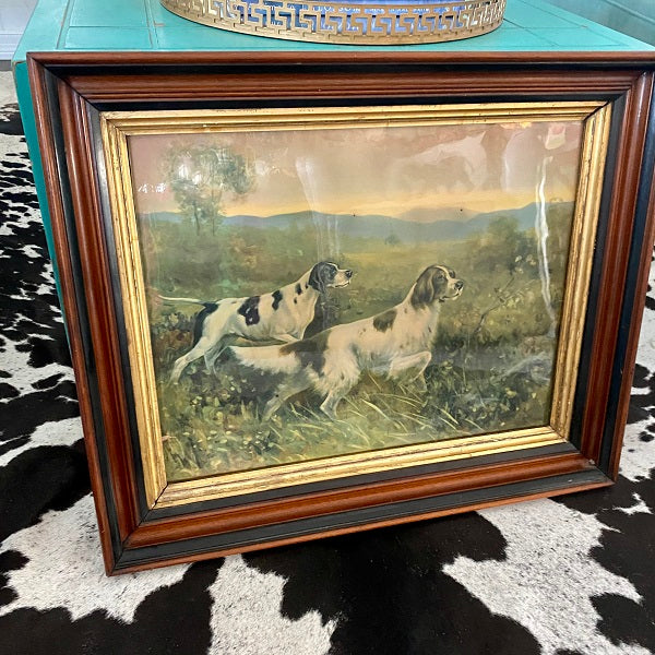This pretty pair of Spaniels are leaping through the mountainous landscape and pointing as they hunt down dinner. They are lovingly framed in a wood with a gold wooden inset. The glass is original and has a wavy look. The back definitely shows the age of this print. Great to hang in a living room, office, den or study. The perfect gift for the hunter or dog lover.