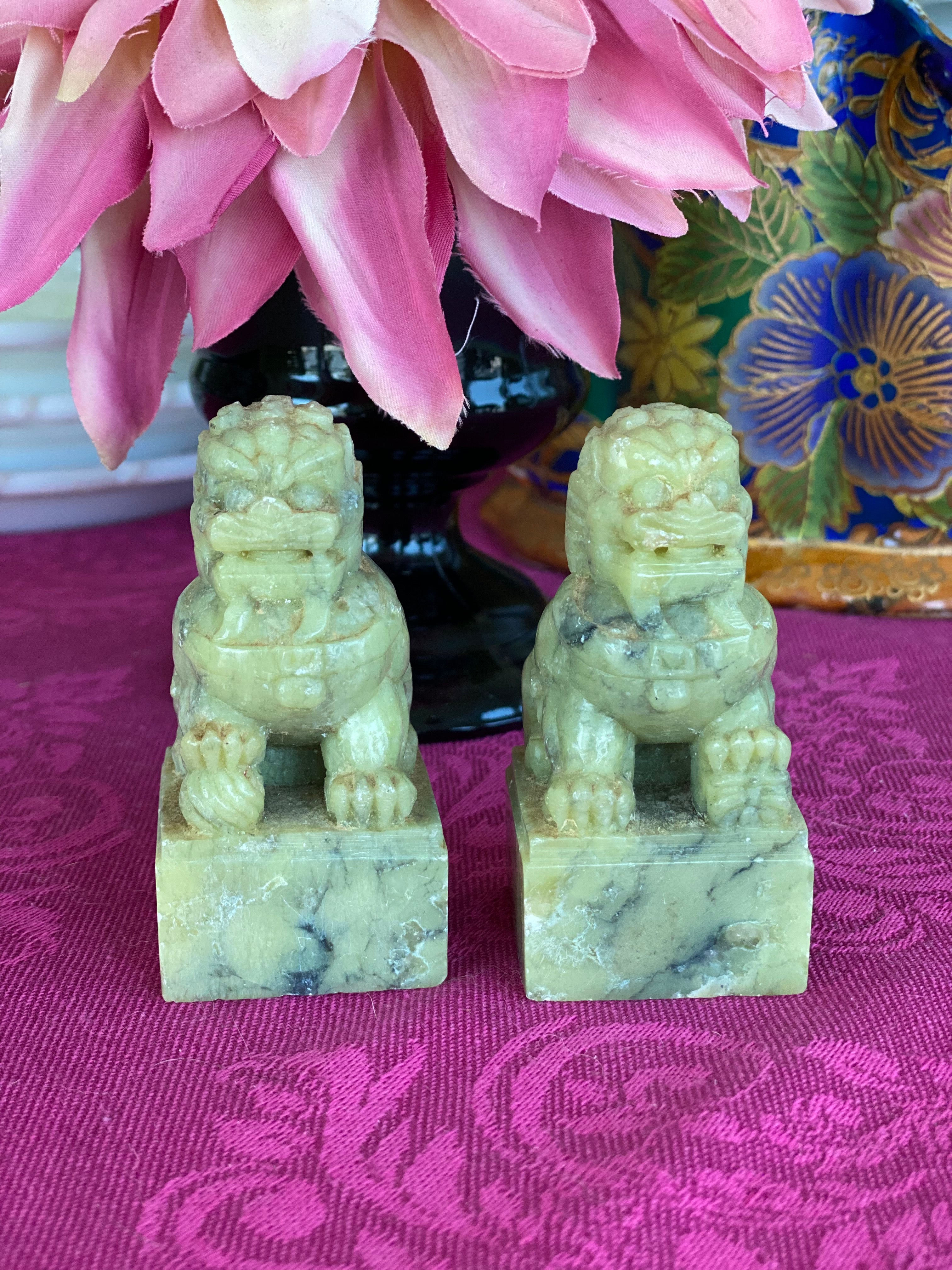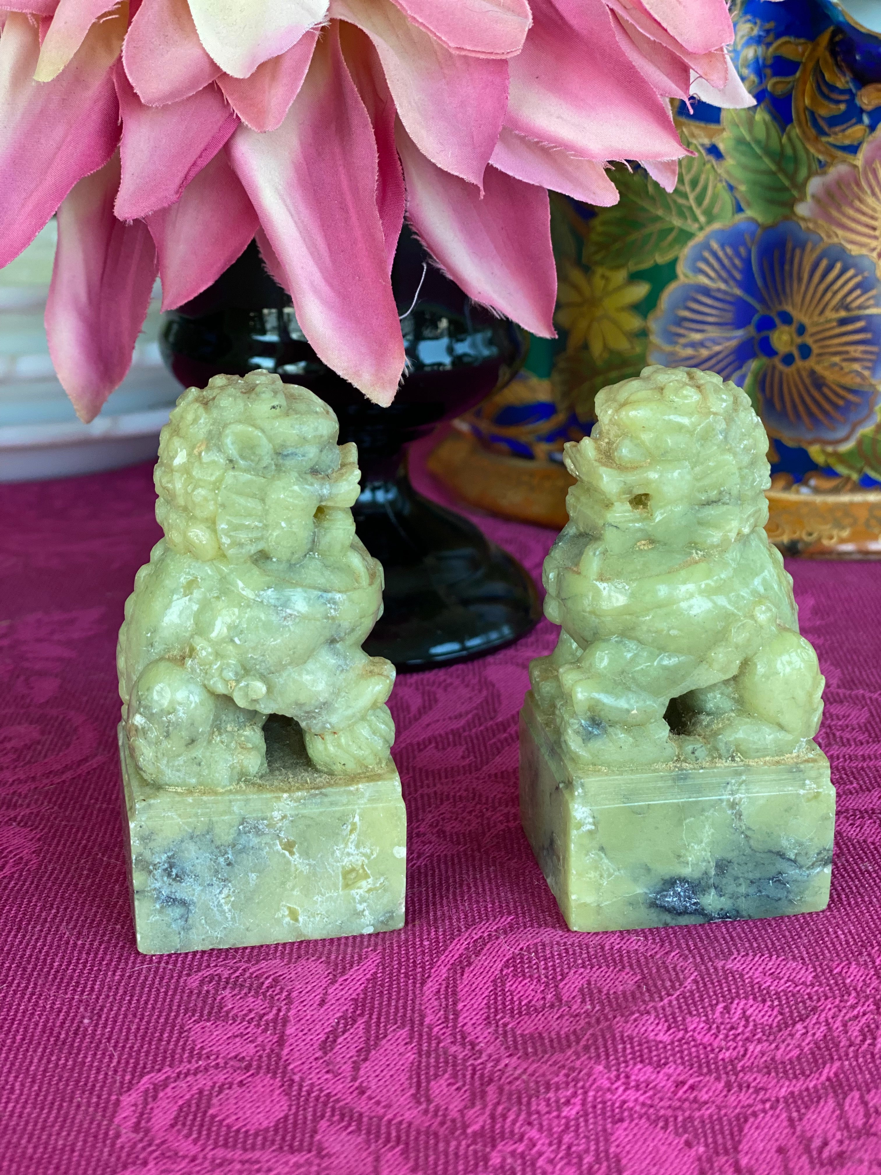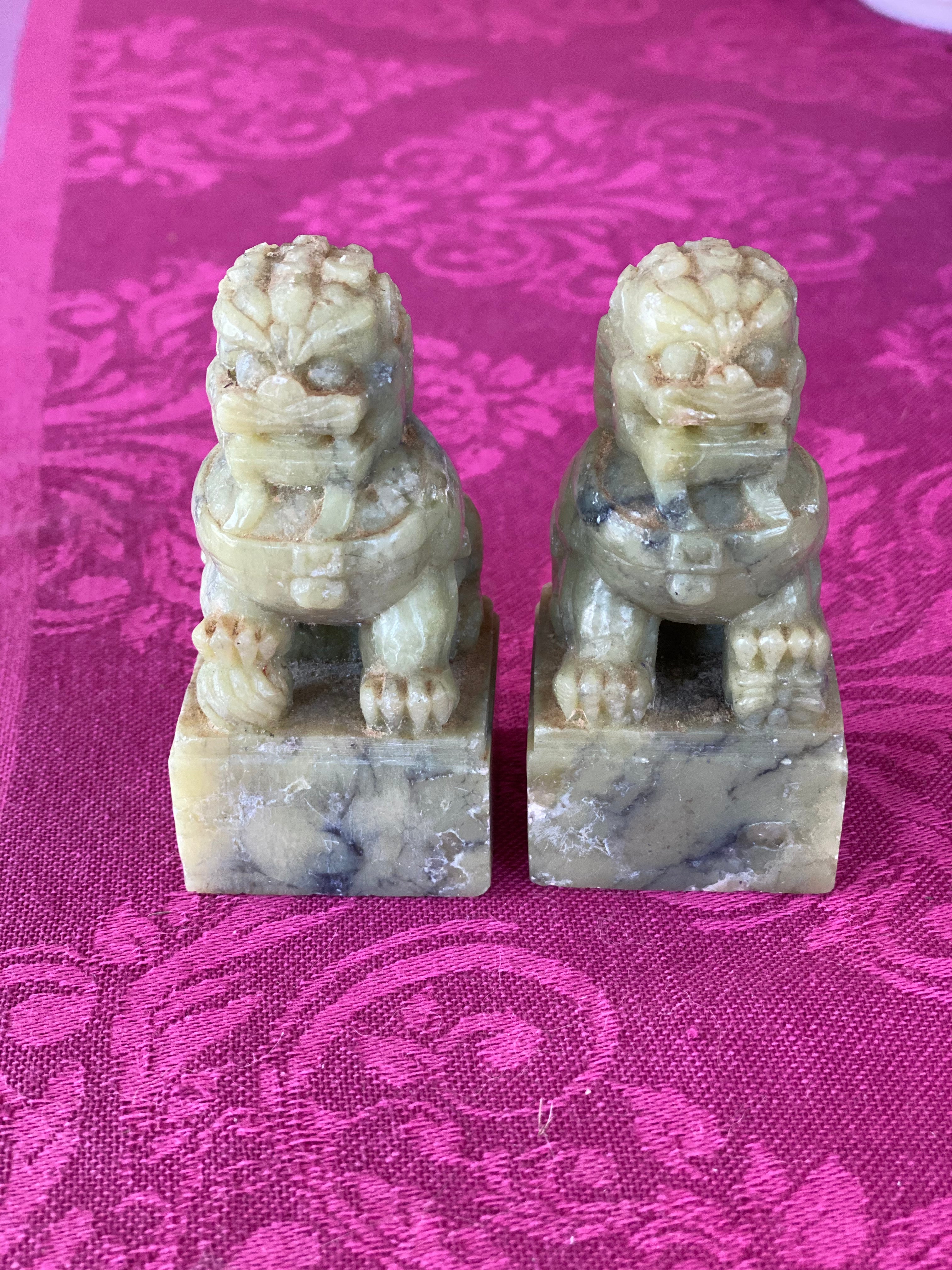 Lovely Vintage/Antique pair stone, possibly marble foo dogs, A lovely ivory and slight green hue. Displays well on a stack of books, a small space or shelf. Protection is the main symbol of the foo dog. They are used to ward off evil spirits and problems; and bring prosperity and success, as well as balance. The male and female pairs denote the yin and yang, which in Chinese philosophy indicates the balance of all things.
