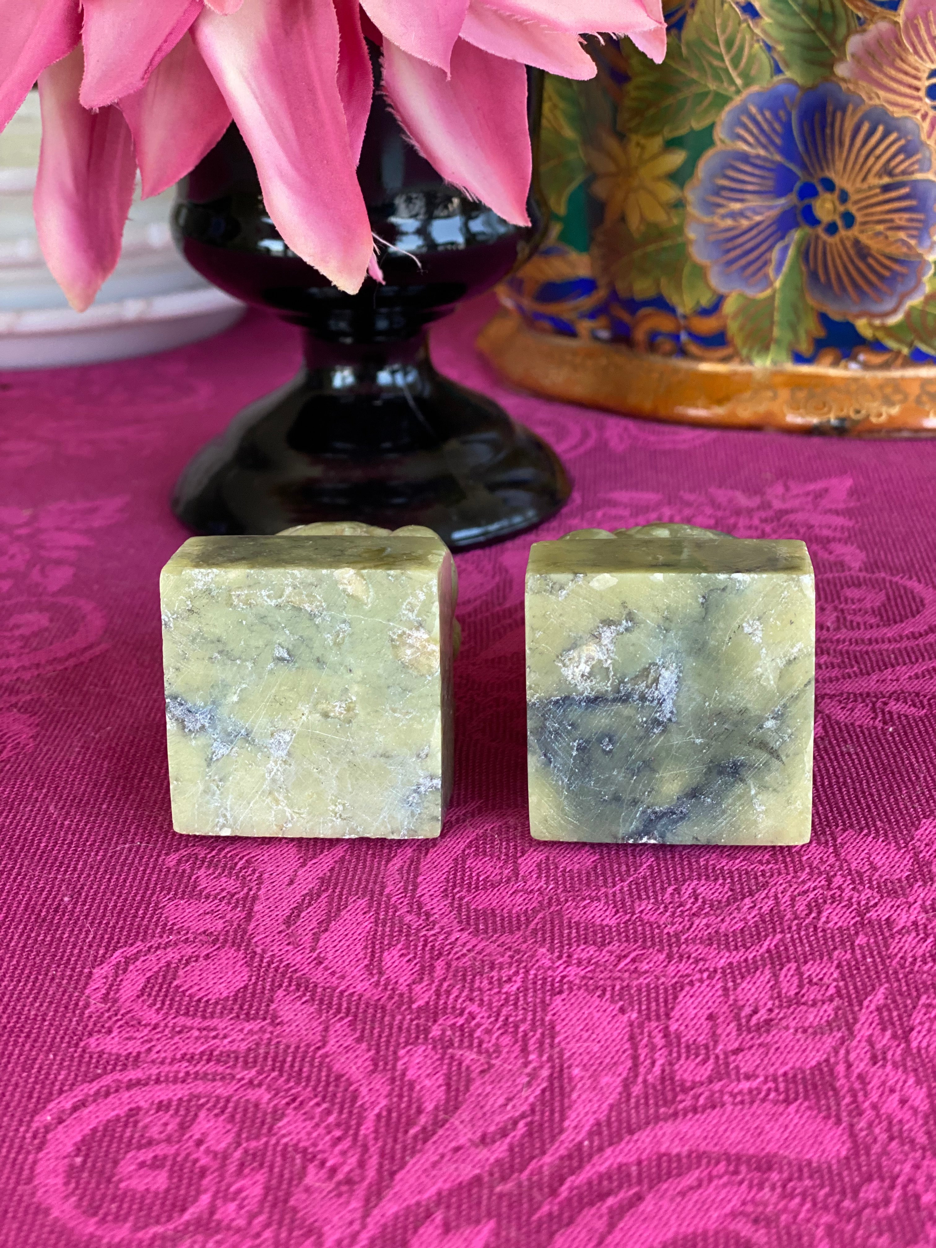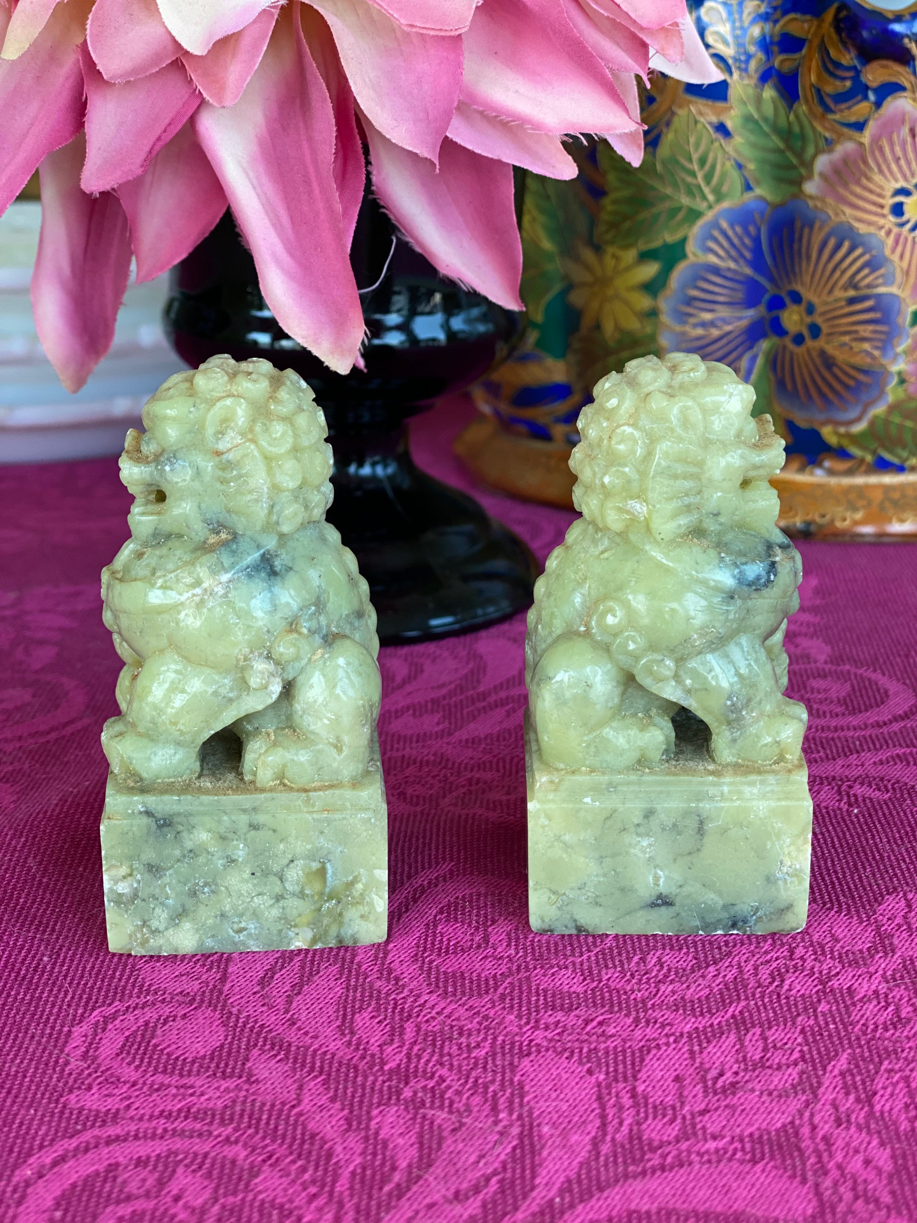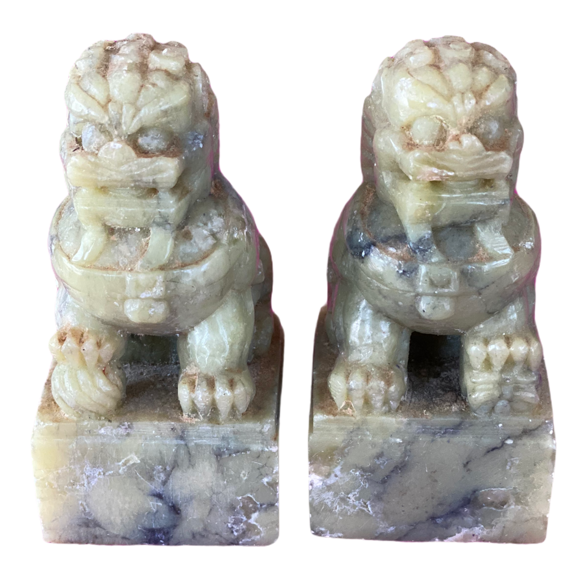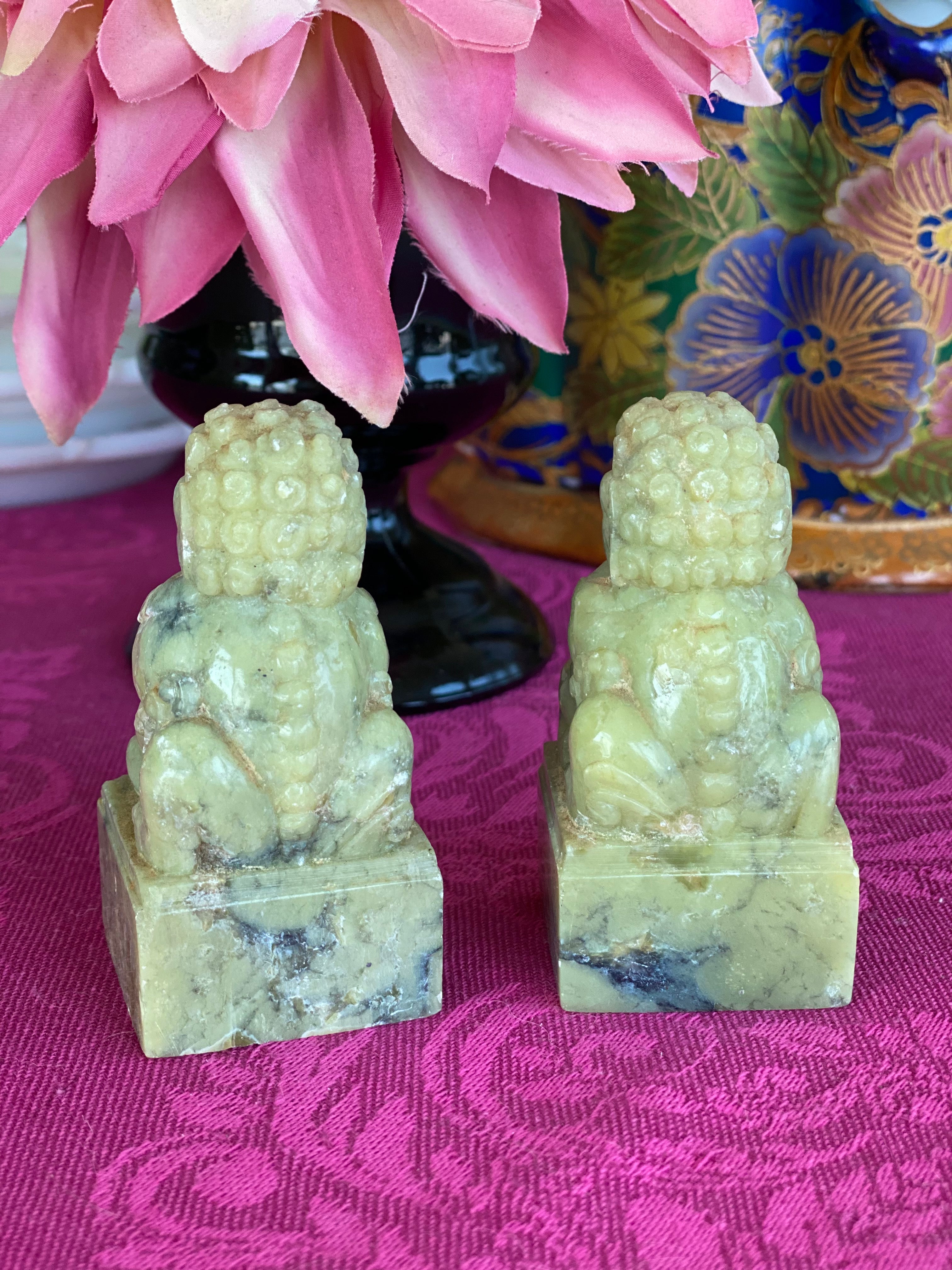Lovely Vintage/Antique pair stone, possibly marble foo dogs, A lovely ivory and slight green hue. Displays well on a stack of books, a small space or shelf. Protection is the main symbol of the foo dog. They are used to ward off evil spirits and problems; and bring prosperity and success, as well as balance. The male and female pairs denote the yin and yang, which in Chinese philosophy indicates the balance of all things.