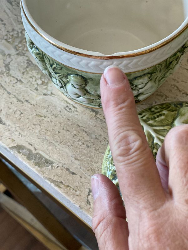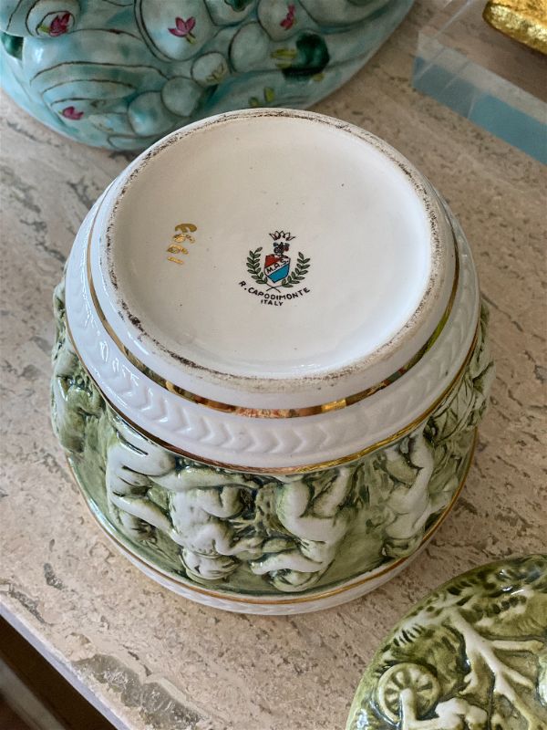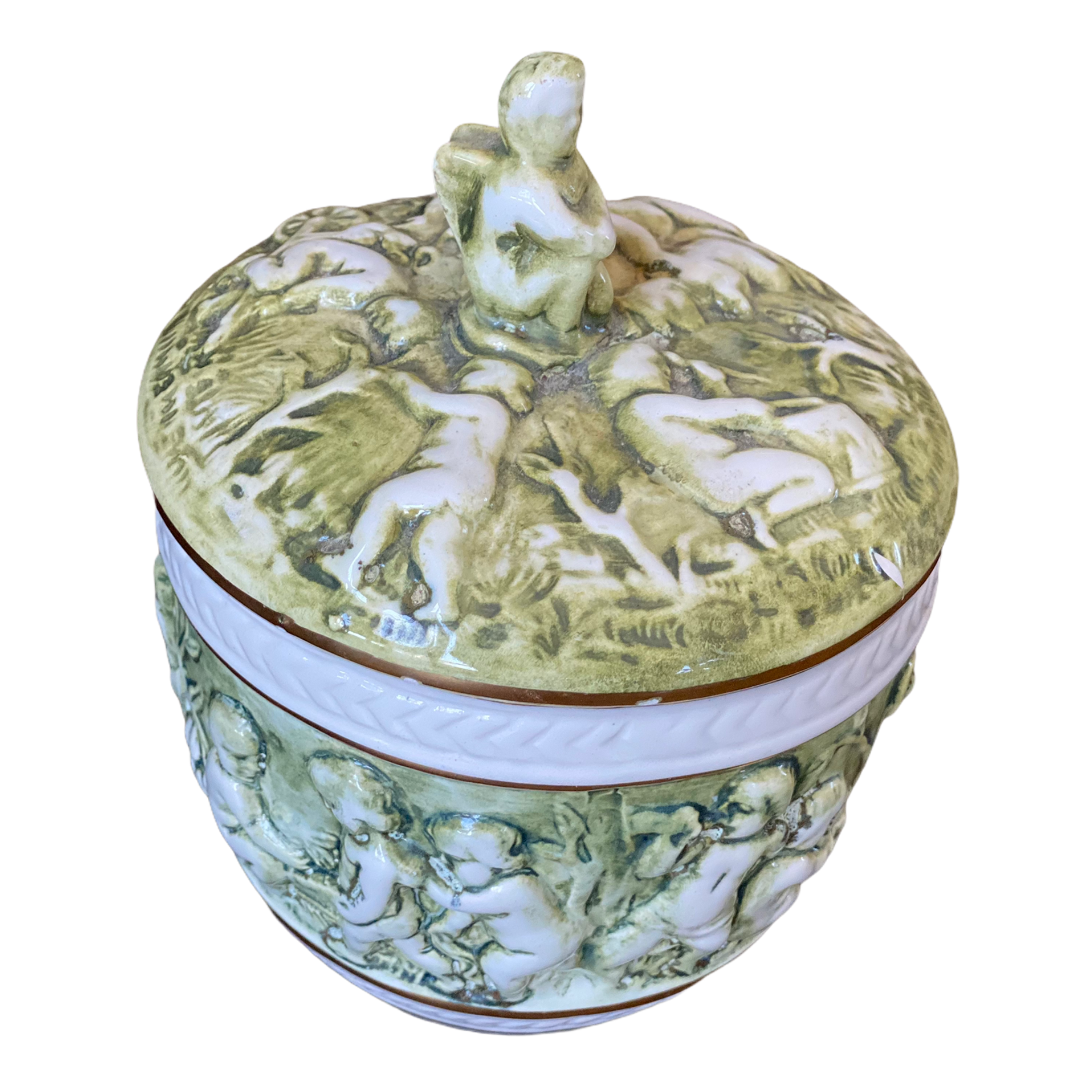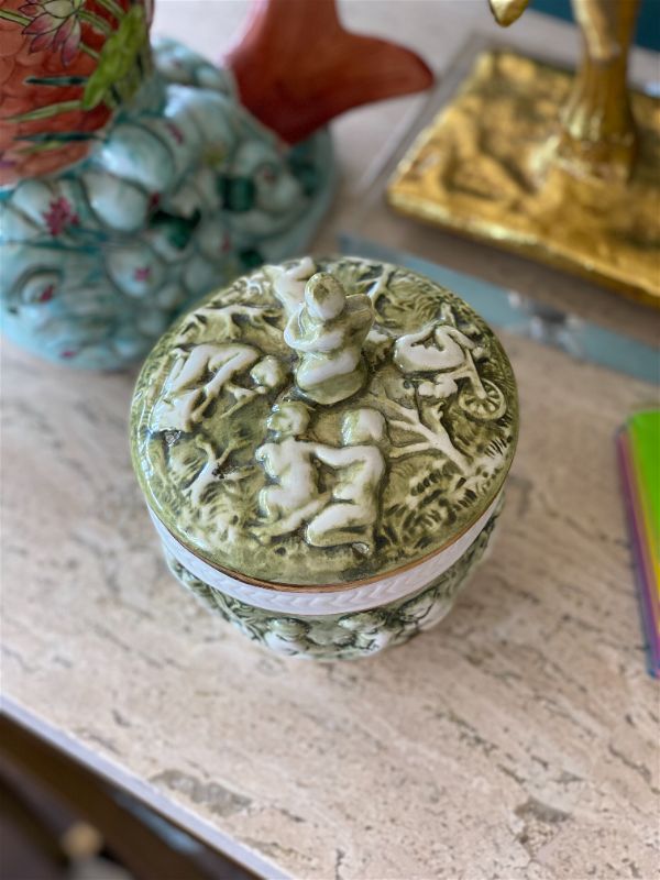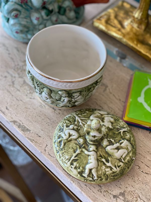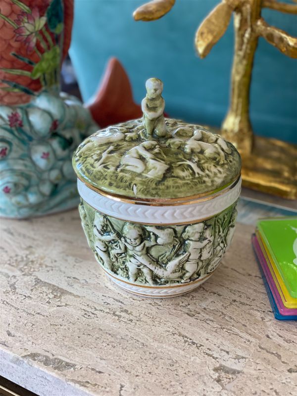 Vintage Green and white Italian Capodimonte lidded jar with angel scene and gold trim. Great for a vanity or dresser to store bath salts, cosmetic sponges, q-tips, cotton balls. Add to a table or nightstand vignette. Small storage box, porcelain, textured, detailed artistic motif. Stamped ands labeled bottom. Tiny chip on rim. Doesn't detract from function or beauty. See picture details as they are part of the description.