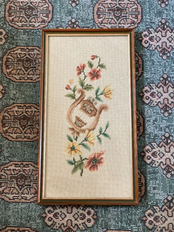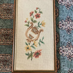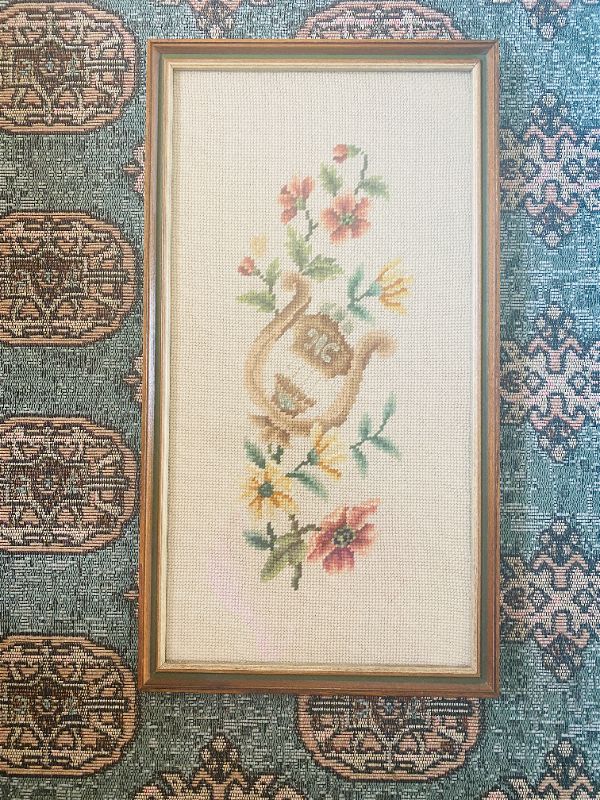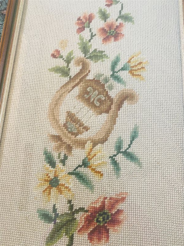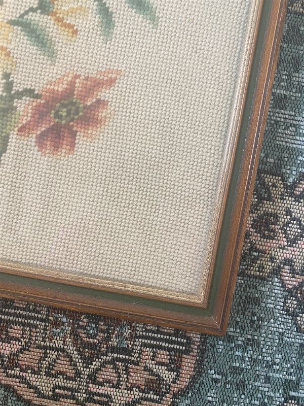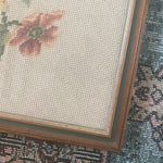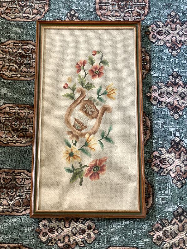 Vintage needlepoint artwork is highly collectible and part of the Grandmillennial decor trend. This has beautifully stitched yellow and pink flowers with a harp intertwined in the leaves. Perfect to display in a bedroom, hallway or nursery. Placed in a wooden frame behind glass.