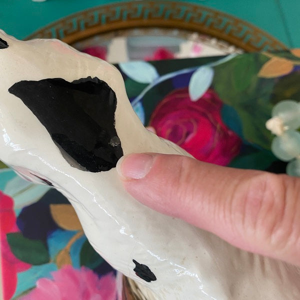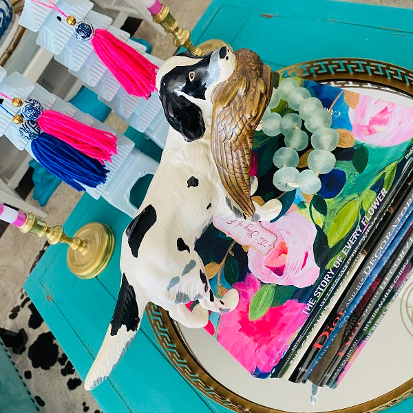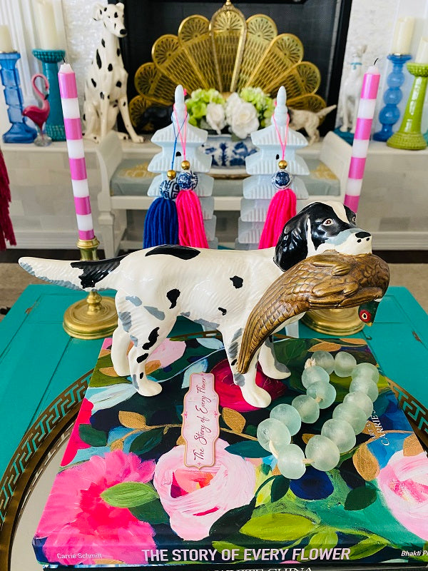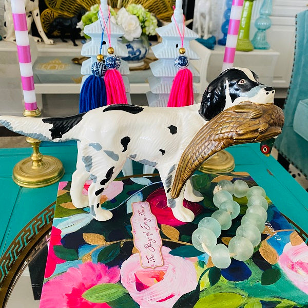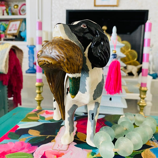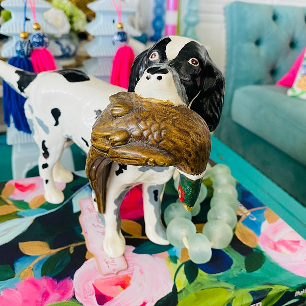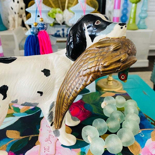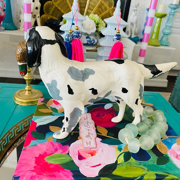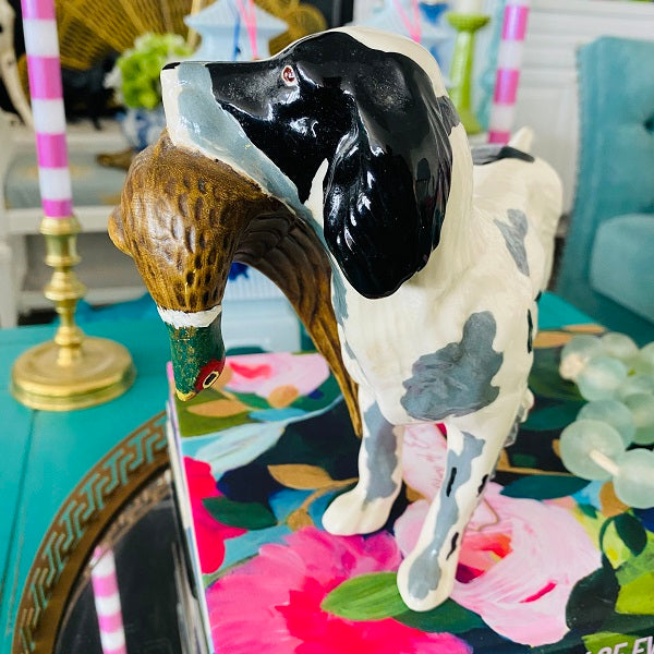 How cute is this spotted black and white dog? It's proud to show its catch, a large pheasant. Hand Painted and great to display on a shelf, bookcase or desk. Great vintage condition.The perfect gift for the hunter or dog lover in your life. (It has a little rattle inside most likely from a piece of porcelain that came loose.)