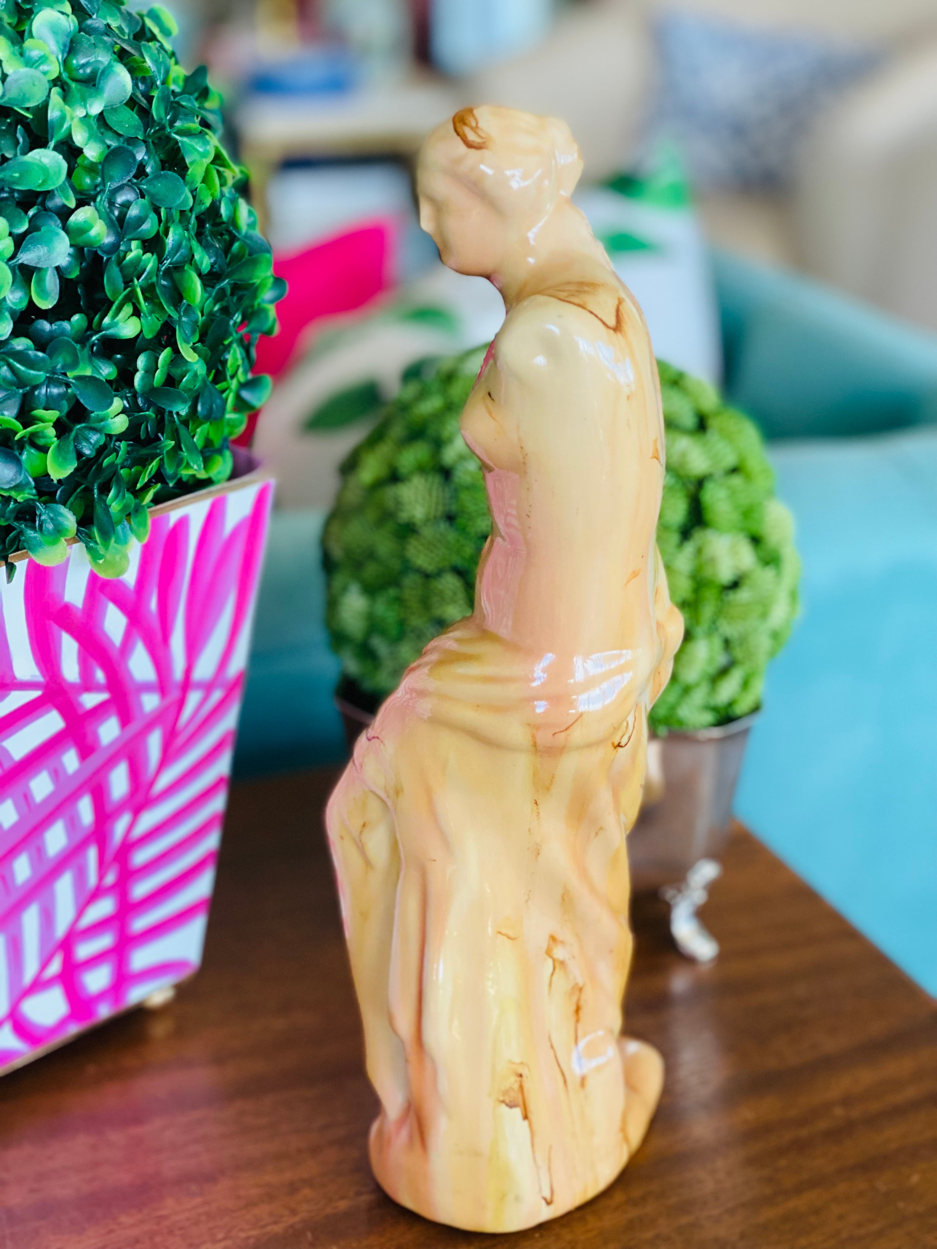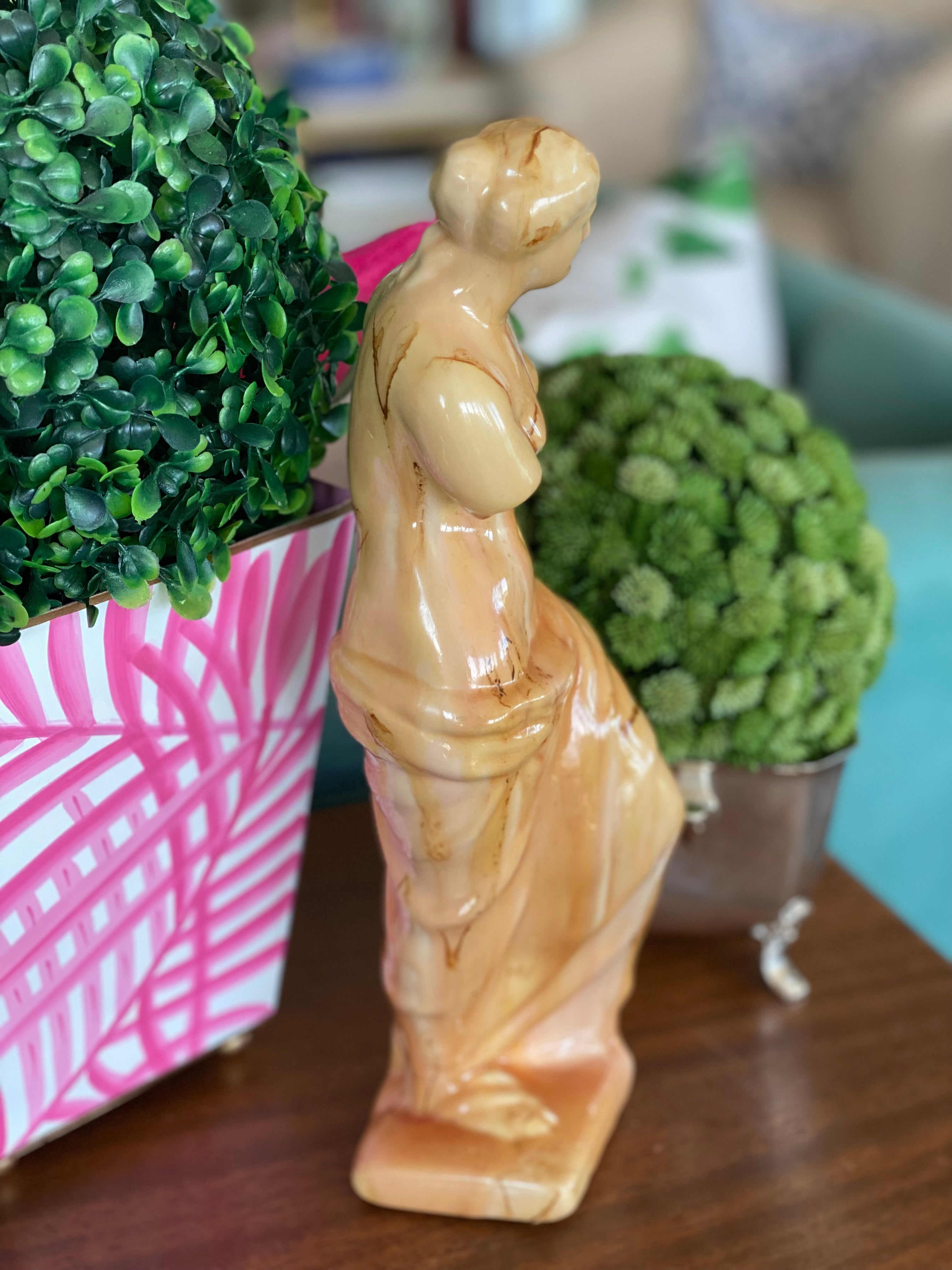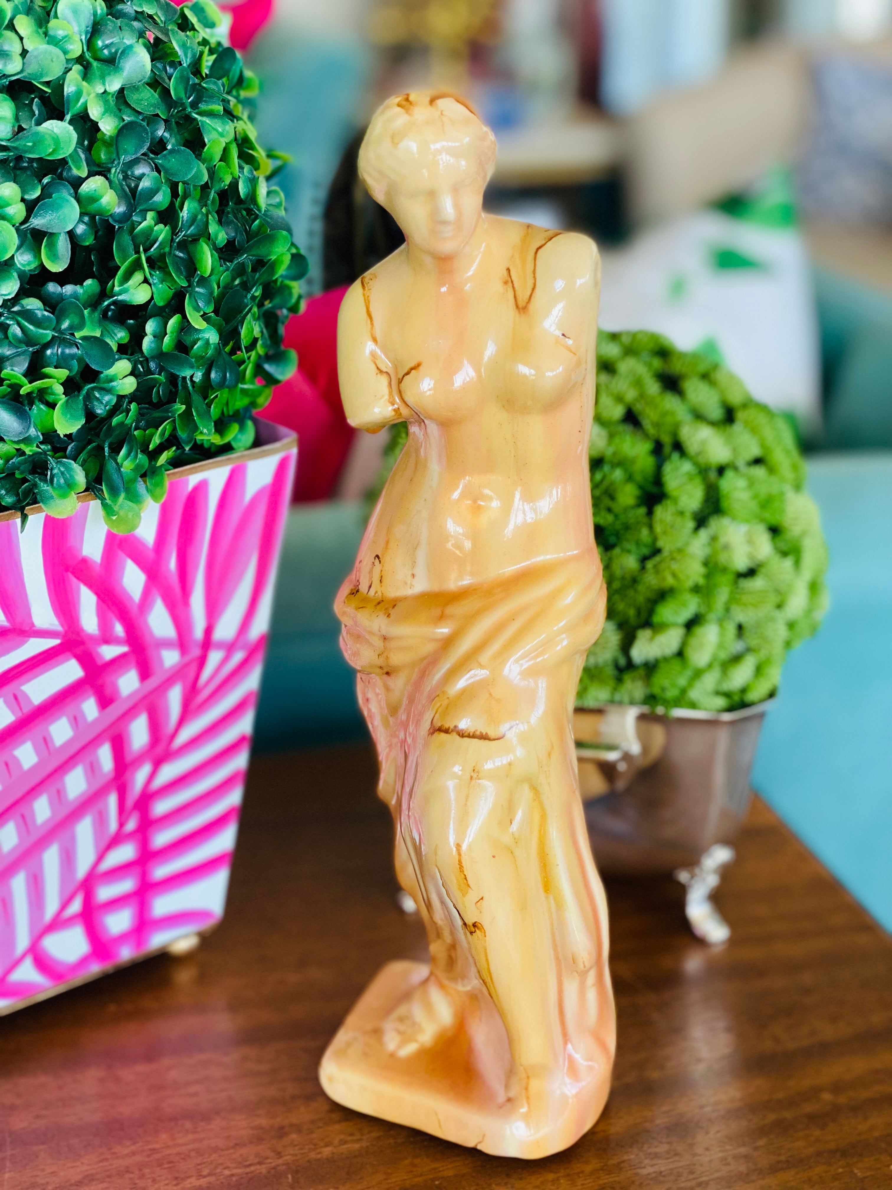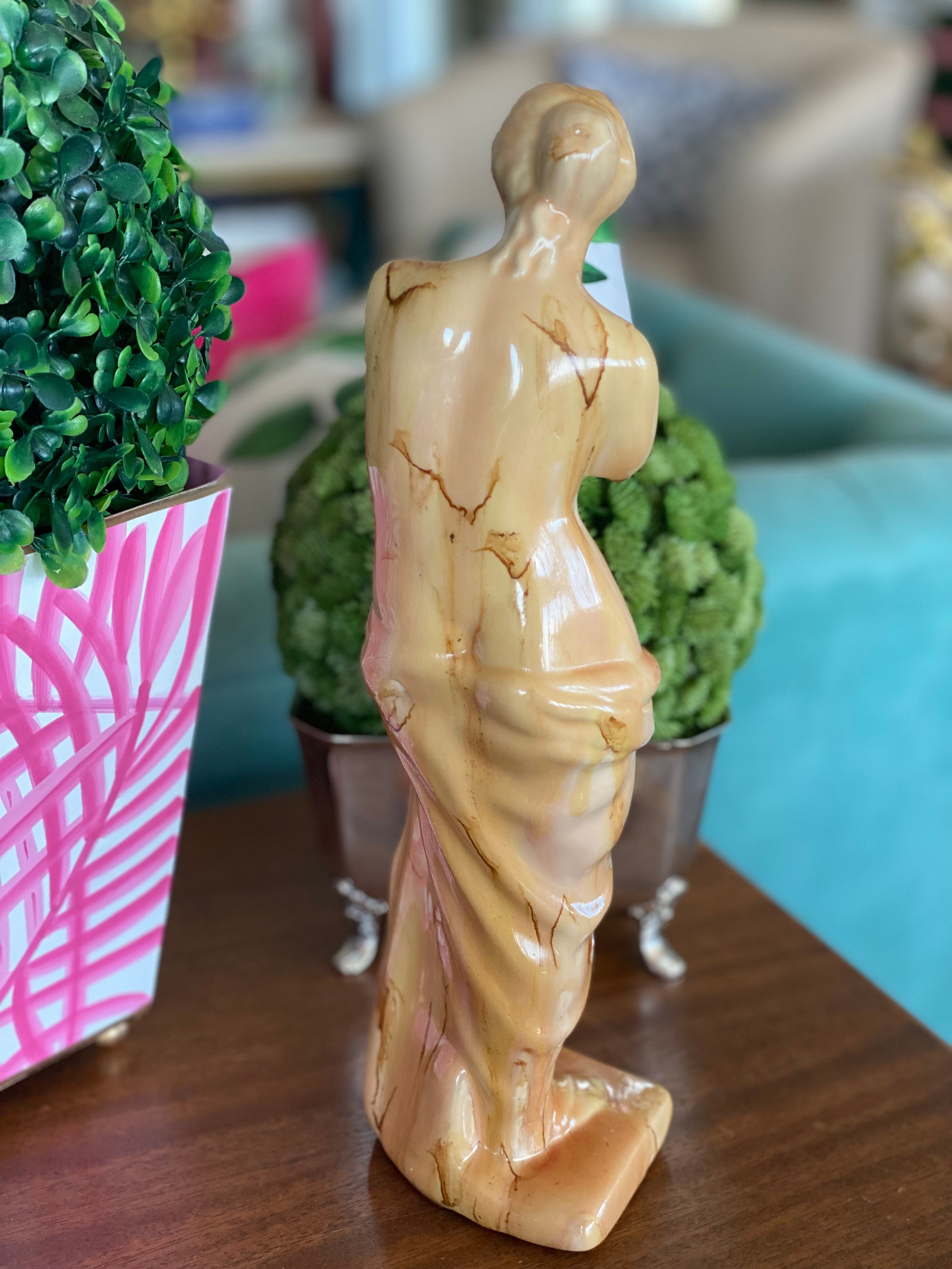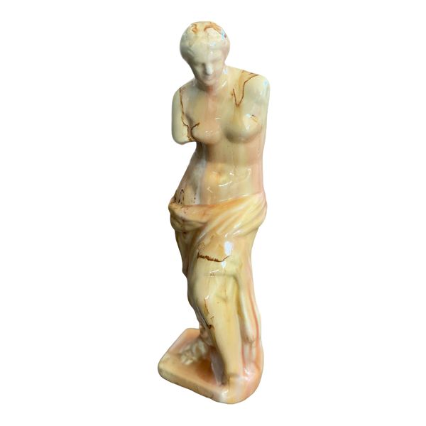 Ceramic with resin coating Venus De Milo Small statue, figurine. A lovely cream and caramel color resembling marble. Great for a shelf or table display. Venus de Milo is an Ancient Greek sculpture from the Hellenistic period, depicting a Greek goddess. It is one of the most famous works of ancient Greek Sculpture. The Venus de Milo has been prominently displayed at the Louvre Museum in Paris since shortly after the statue was rediscovered on the island of Milos, Greece in 1820.