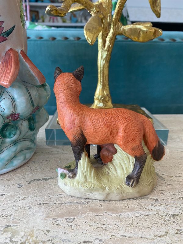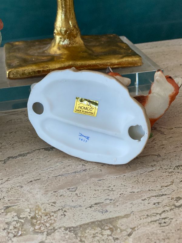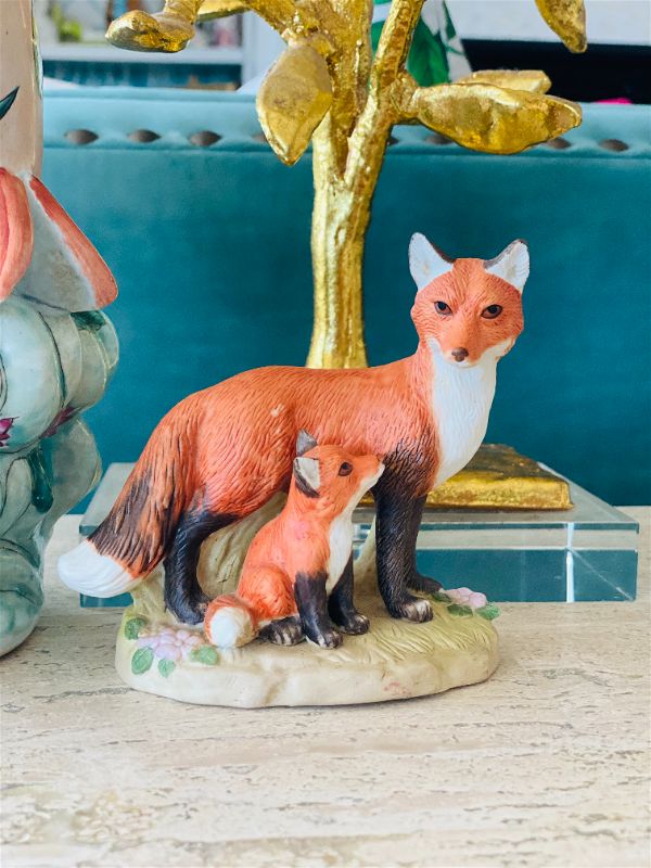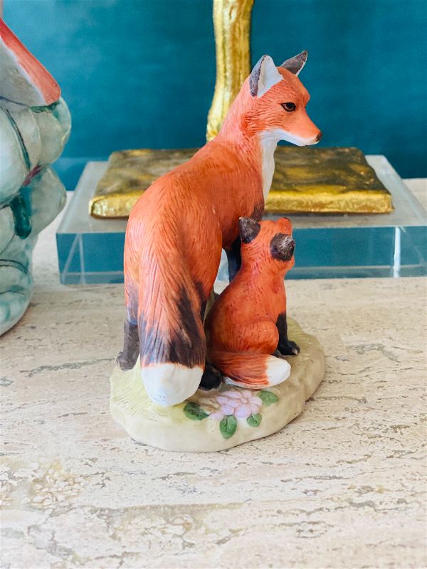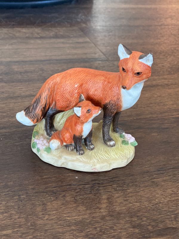 A Vintage Homco Mother and baby fox figurine,made in Malaysa. Colorful porcelain, hand painted and ready for display. Sticker on bottom. Homco has always been a leader in top quality figurines. See picture details as they are part of the description.