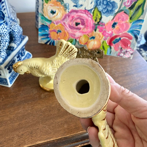 This pair of rooster are perfect for a Fall or Thanksgiving table. They are a fun yellow color with gold accents. The corks are missing from the bottom but are easily replaced on Amazon. They make a great addition to a shelf or table vignette. Perfect for farmhouse decor. Great vintage condition.