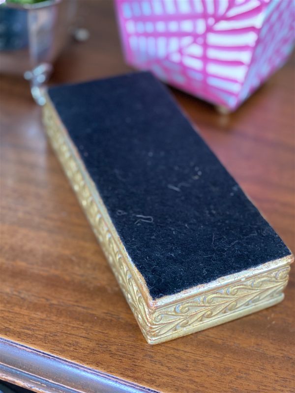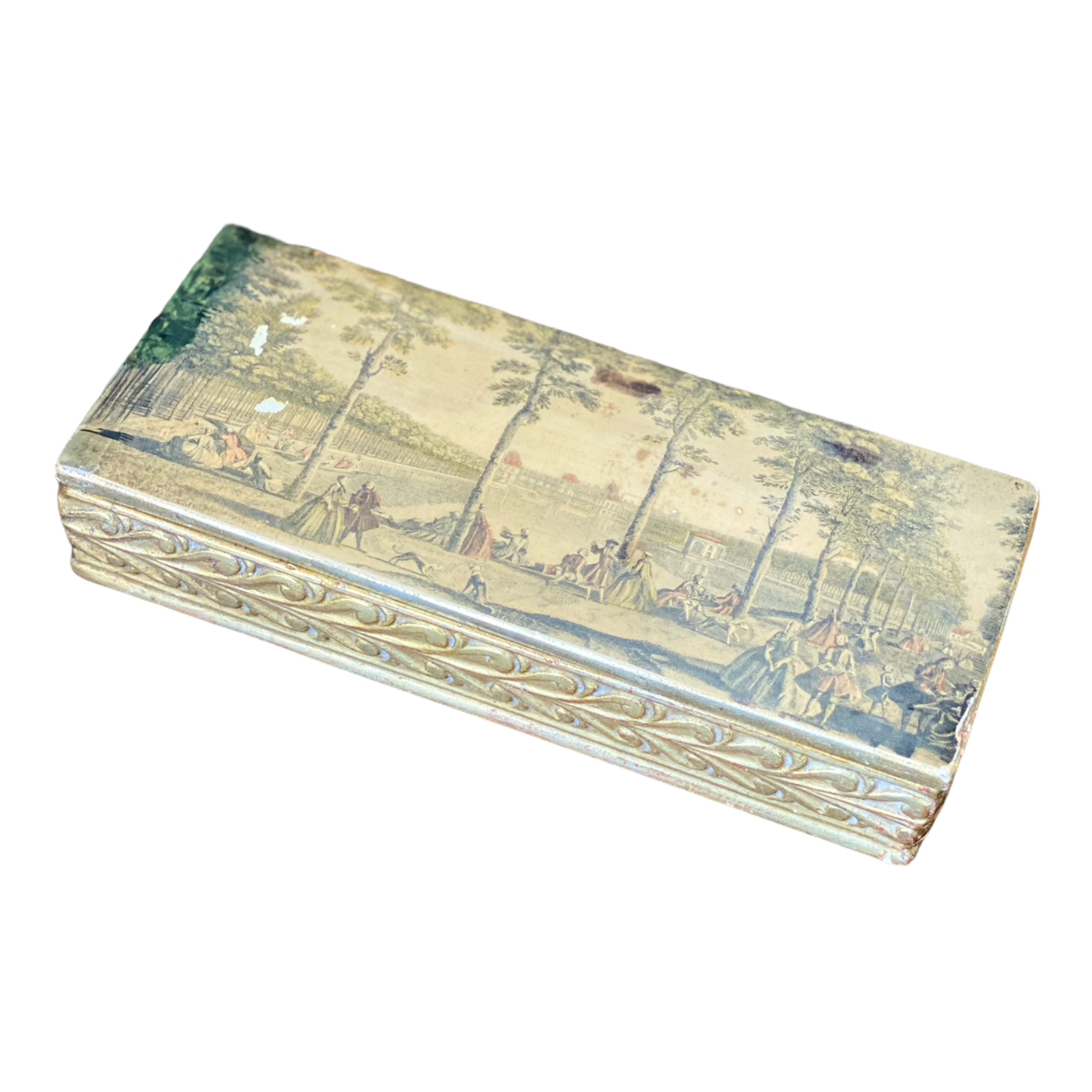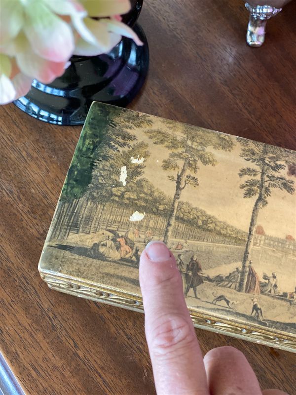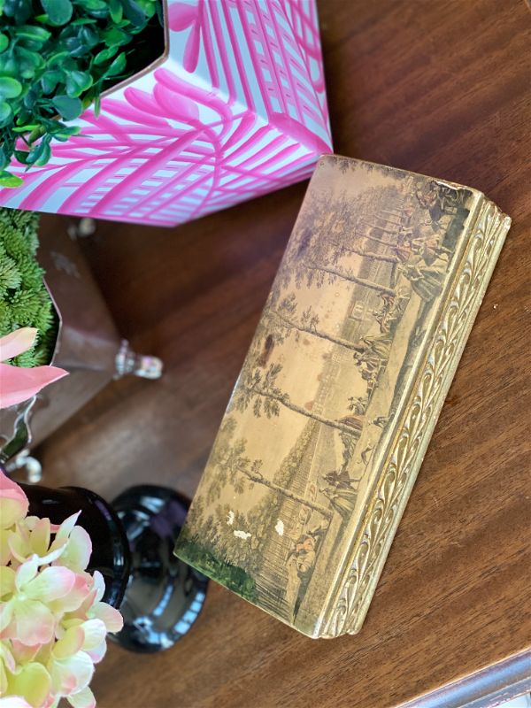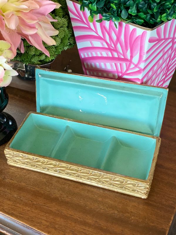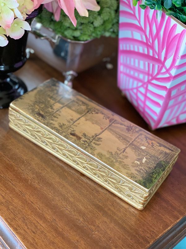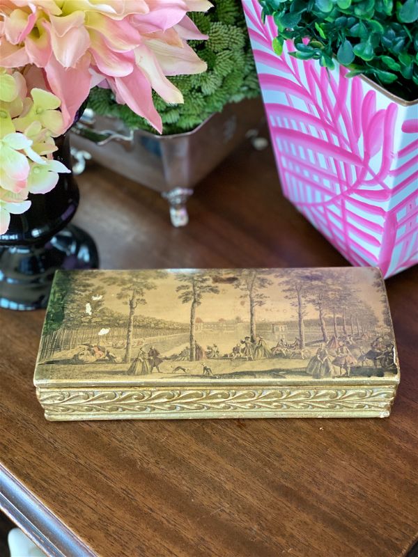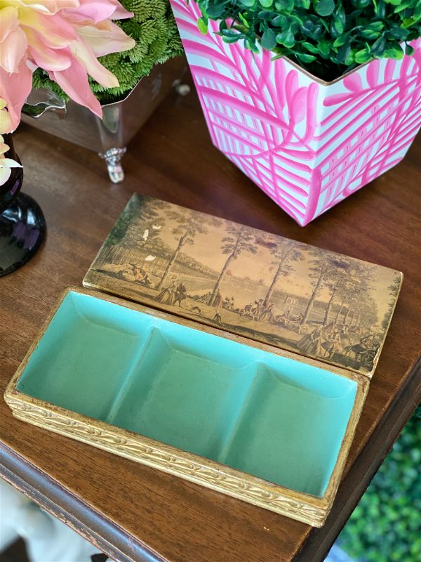 A beautiful pastoral victorian scene sits on top of this detailed box. Gold swirl edge, compartments inside, with aqua interior. Nice weight to it. Perfect for a bedside table, vanity, coffee table vignette or desk. A rare and unique find.