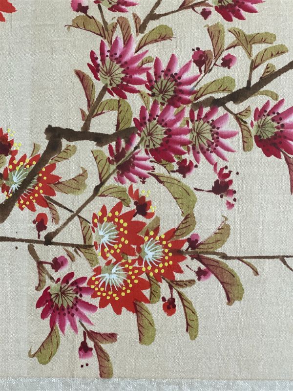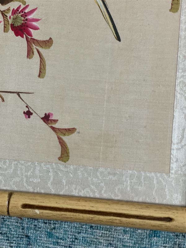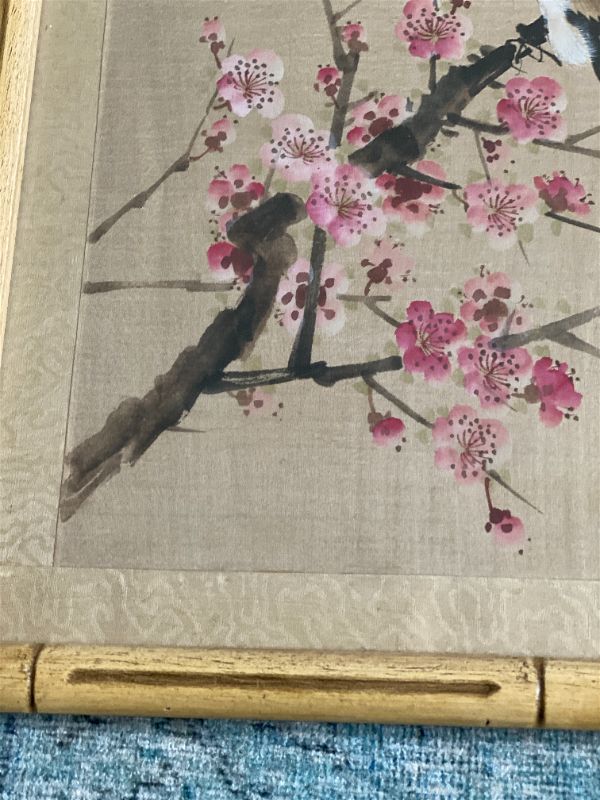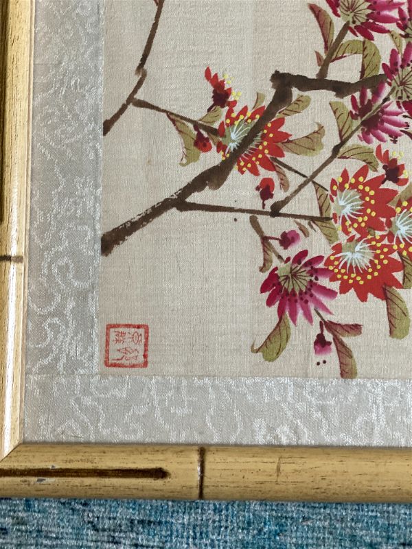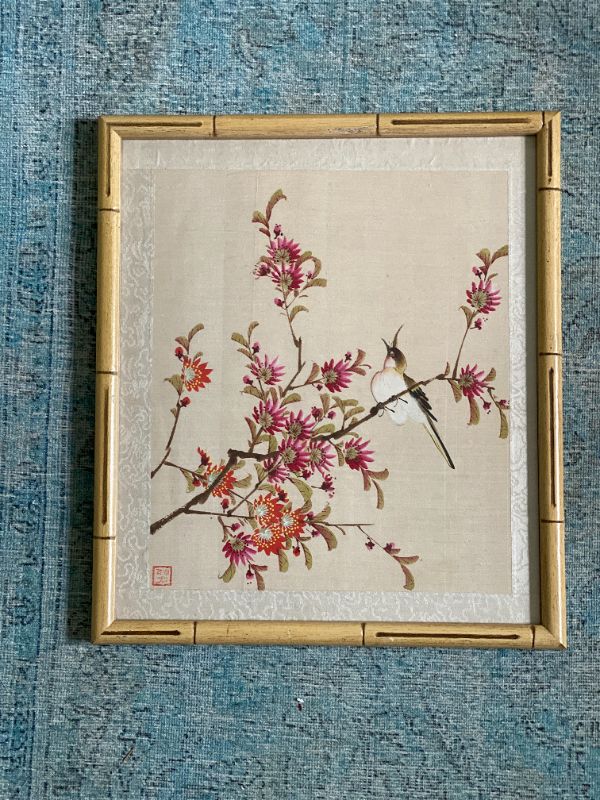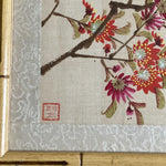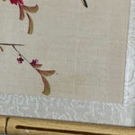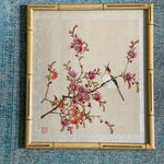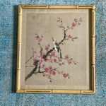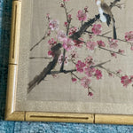 Weber Silk Hand Painted Bamboo Framed Bird and Floral Art, Signed
