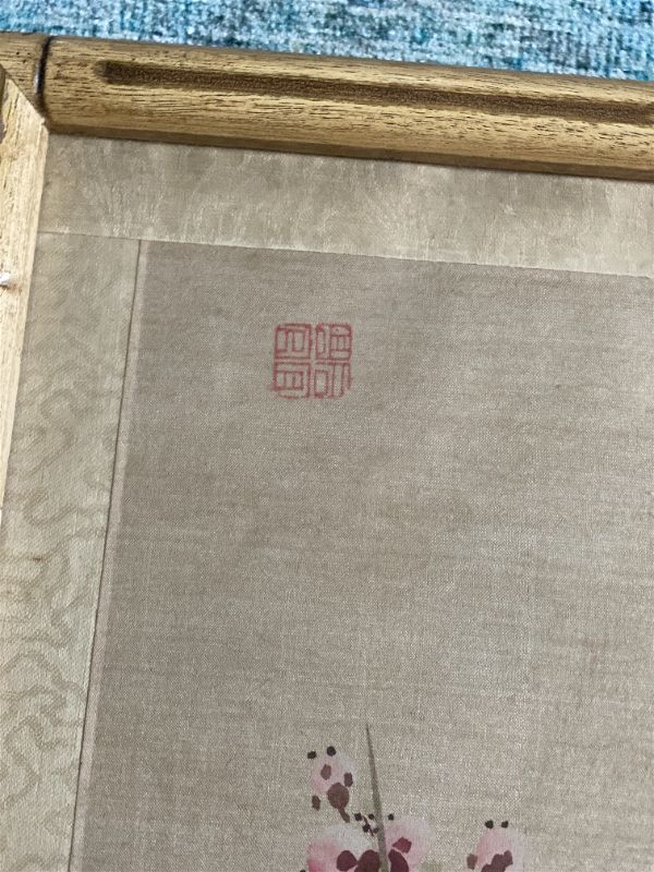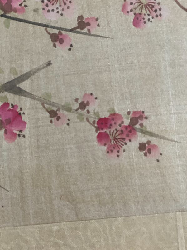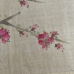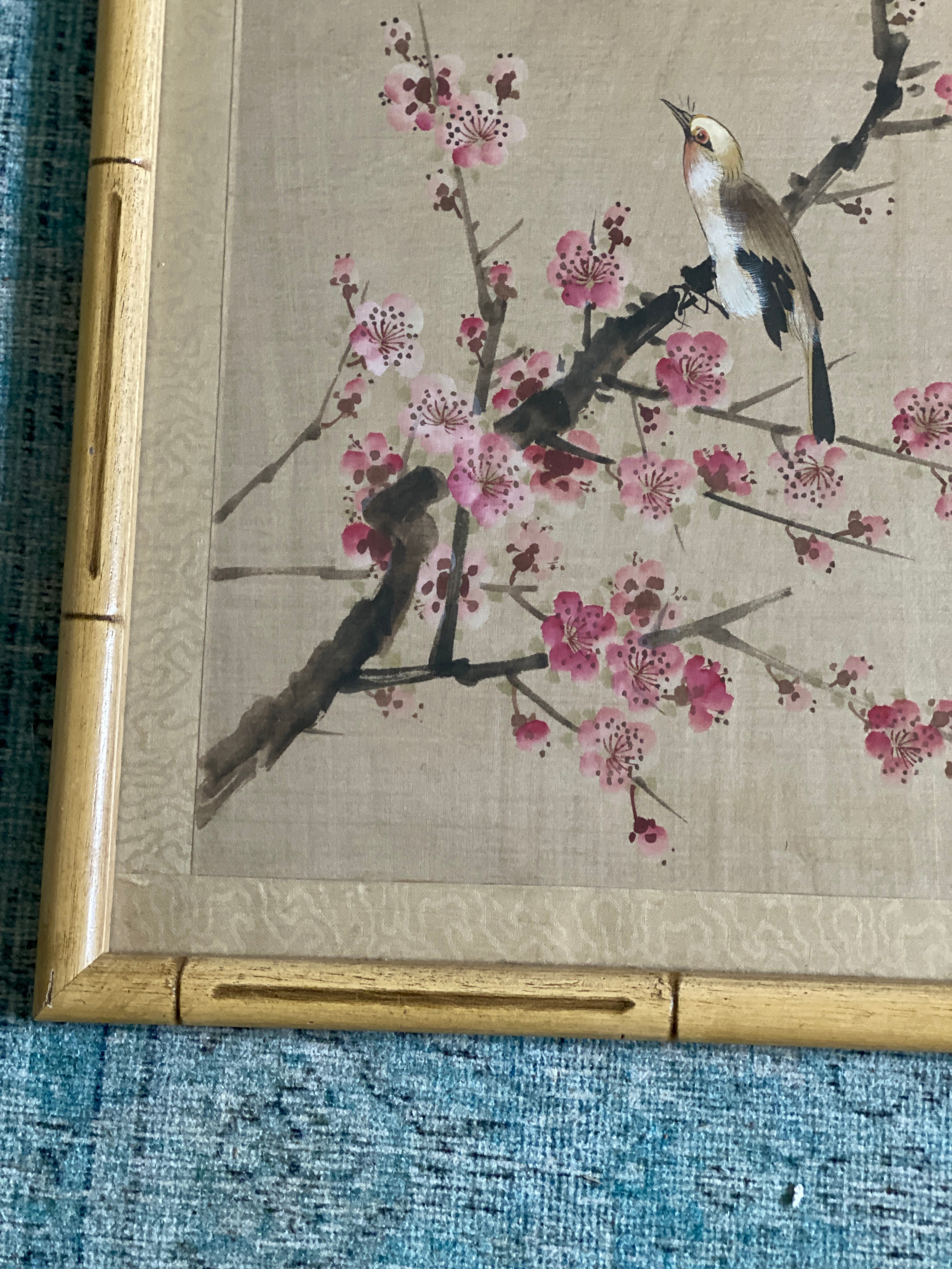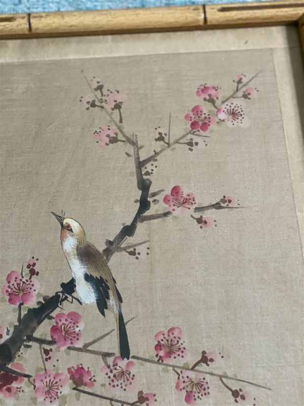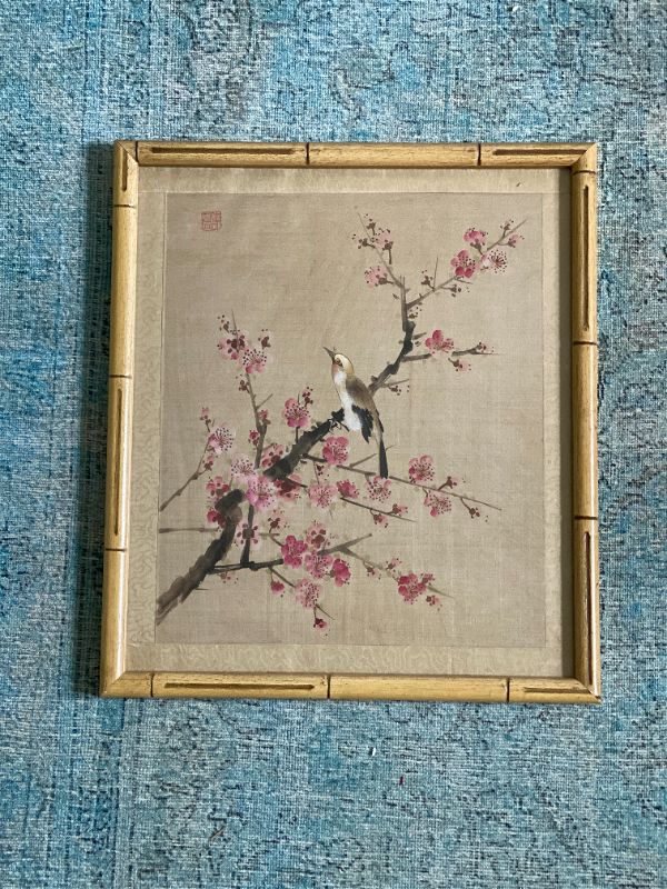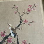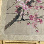 Extremely detailed hand painted bird and cherry blossom flowers on silk. Beautifully framed in a wooden bamboo frame behind glass. Piece is signed by the artist shown in red in the upper righthand corner. Lovely and delicate pink and white blossoms on delicate brown branches. A small brown and white bird sits on the branch.