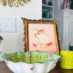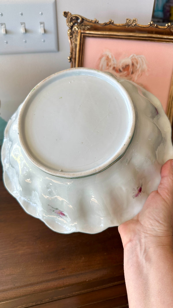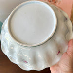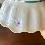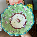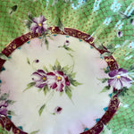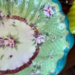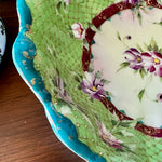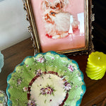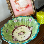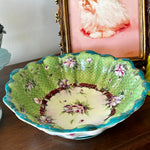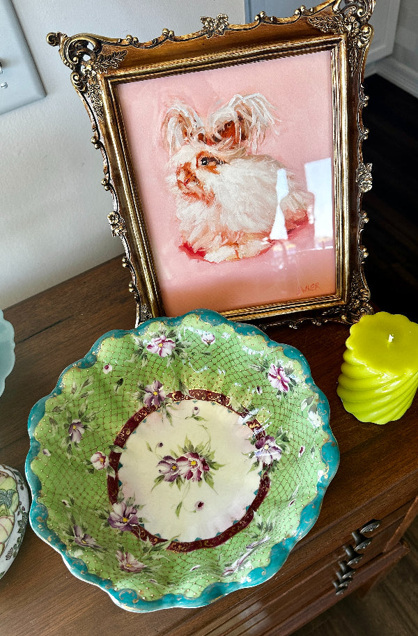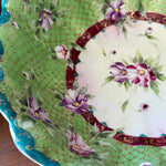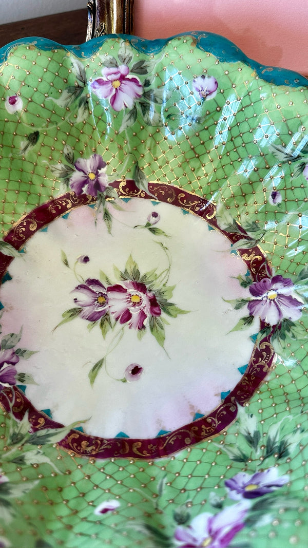 Feast your eyes on our exquisite Nippon Antique Bowl, dating back to circa 1880. This magnificent piece features intricate hand-painted details and is adorned with Jeweled Lattice gilt. Immerse yourself in the delicate beauty of its floral design in hues of green, turquoise, and pink, each stroke telling a story of elegance and tradition. This Antique Bowl is sure to captivate your heart and elevate any space with its charm.
