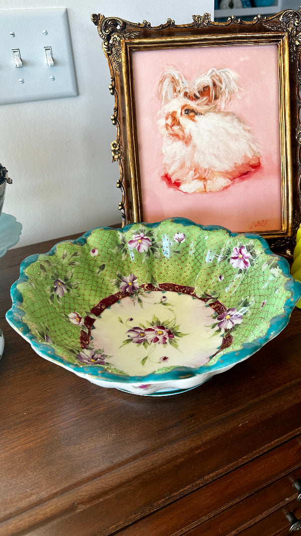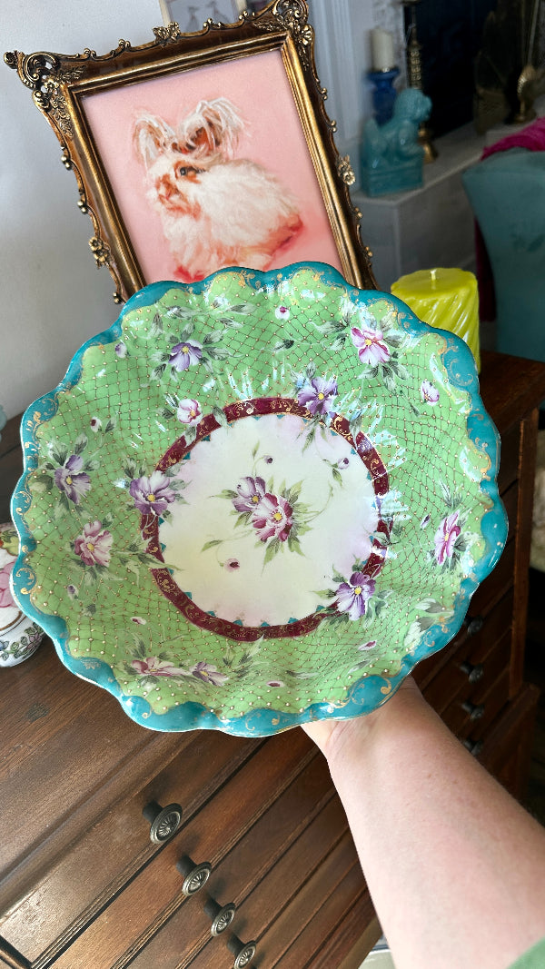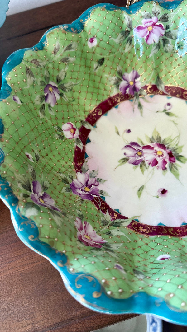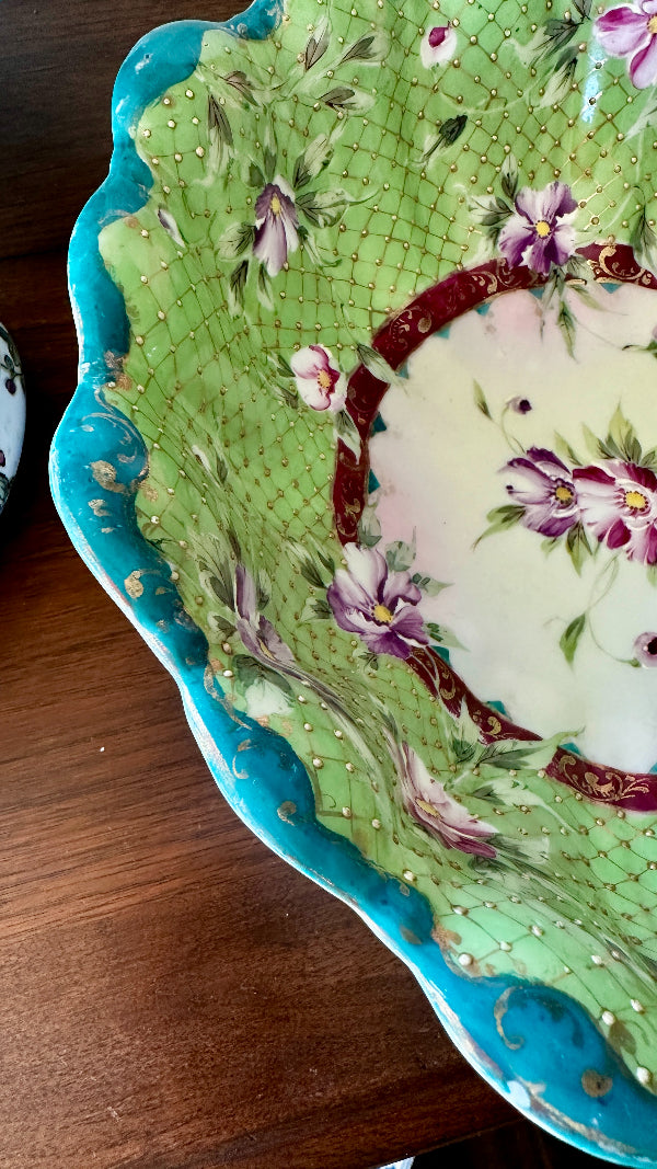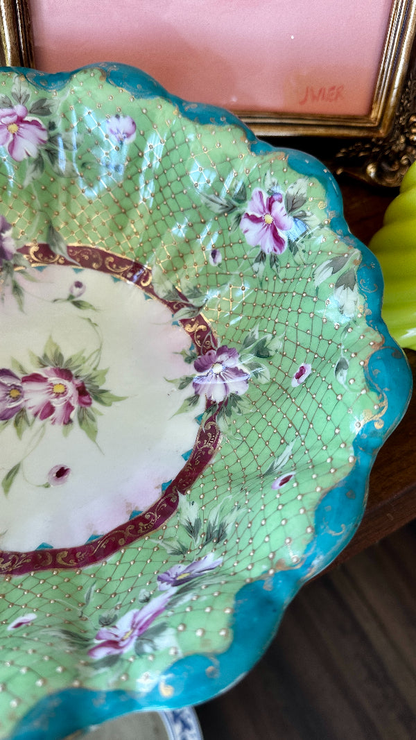 Antique Bowl, Nippon, C. 1880, Hand Painted, Jeweled Lattice gilt, Floral design Green, Turquoise, Pink