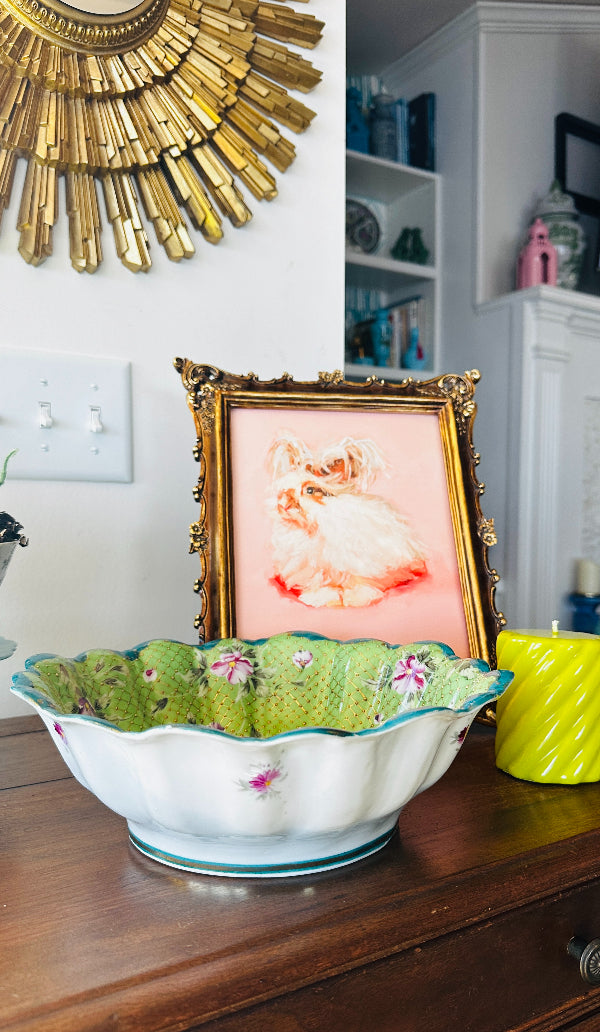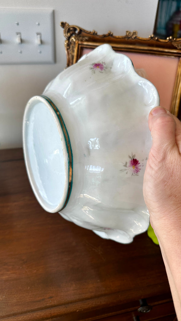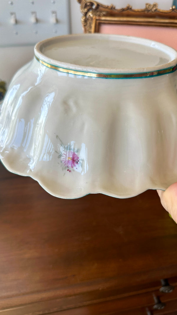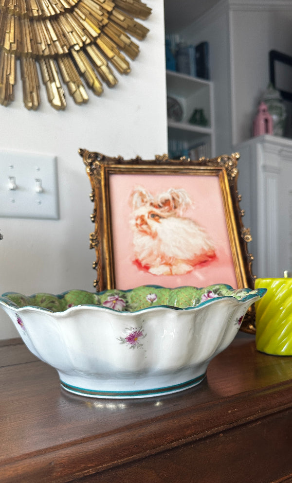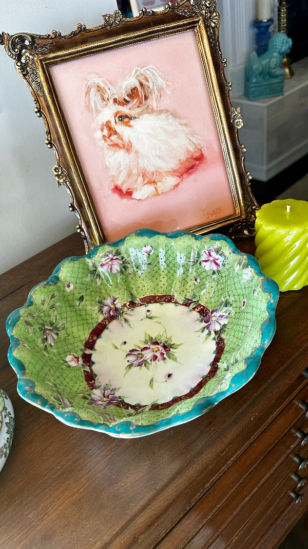 Antique Bowl, Nippon, C. 1880, Hand Painted, Jeweled Lattice gilt, Floral design Green, Turquoise, Pink