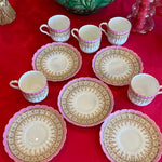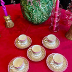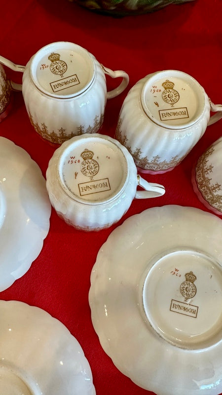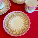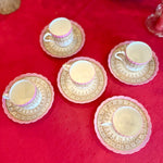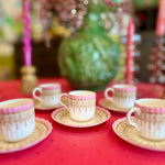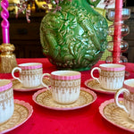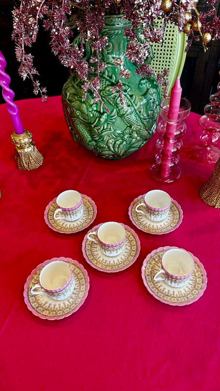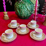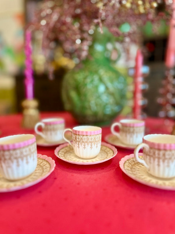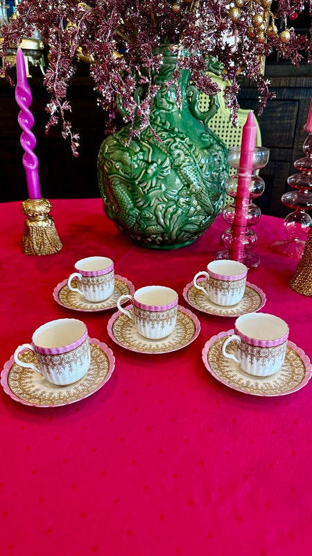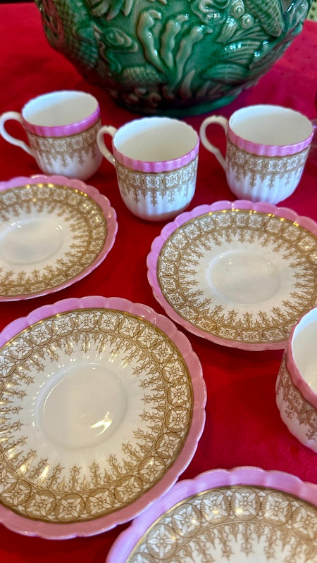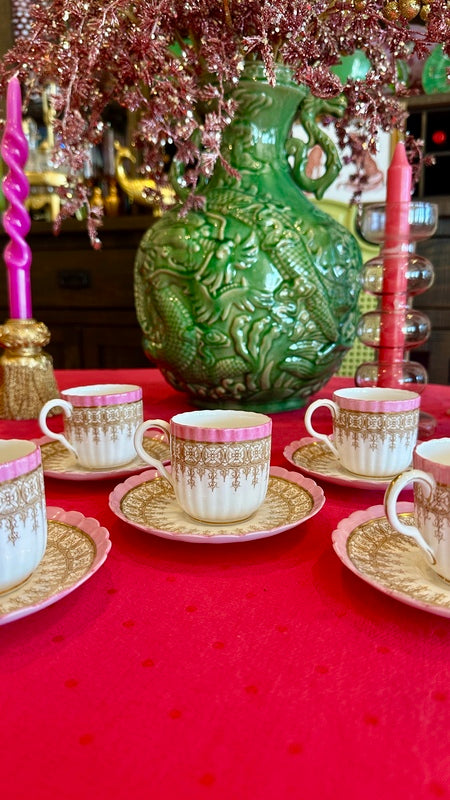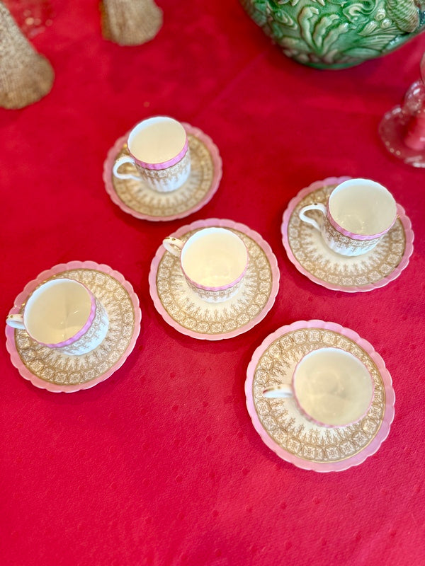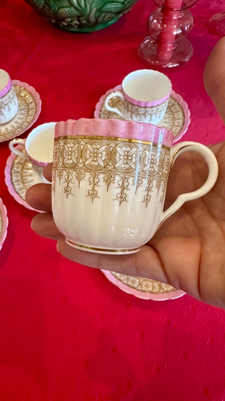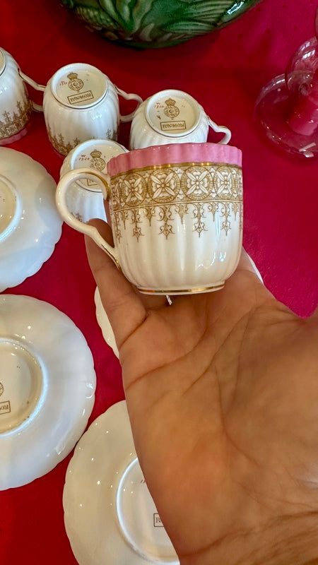Antique Demitasse Cup and Saucer Set from Royal Worcester, dating back to the 1800s. Crafted from fine bone china porcelain, this elegant pink and white set offers timeless beauty and craftsmanship. Available as a set of five or sold individually, these delicate cups and saucers are perfect for collectors or those seeking a touch of antique luxury in their tableware.