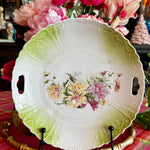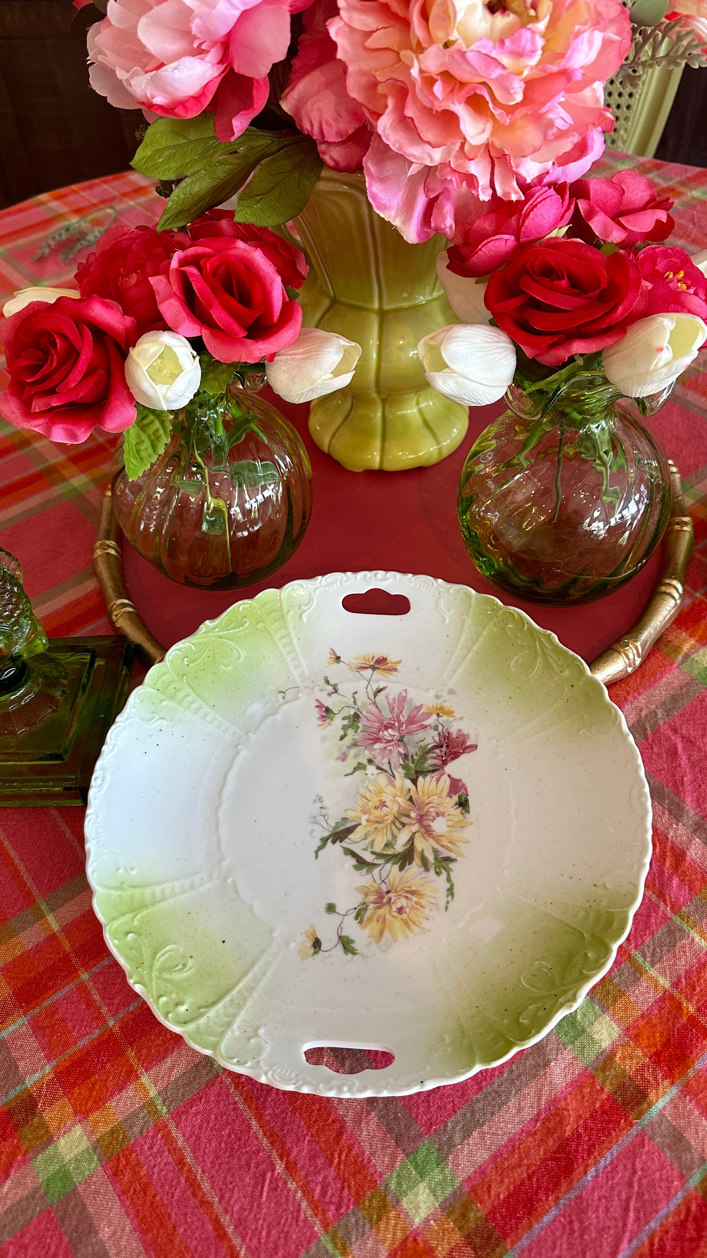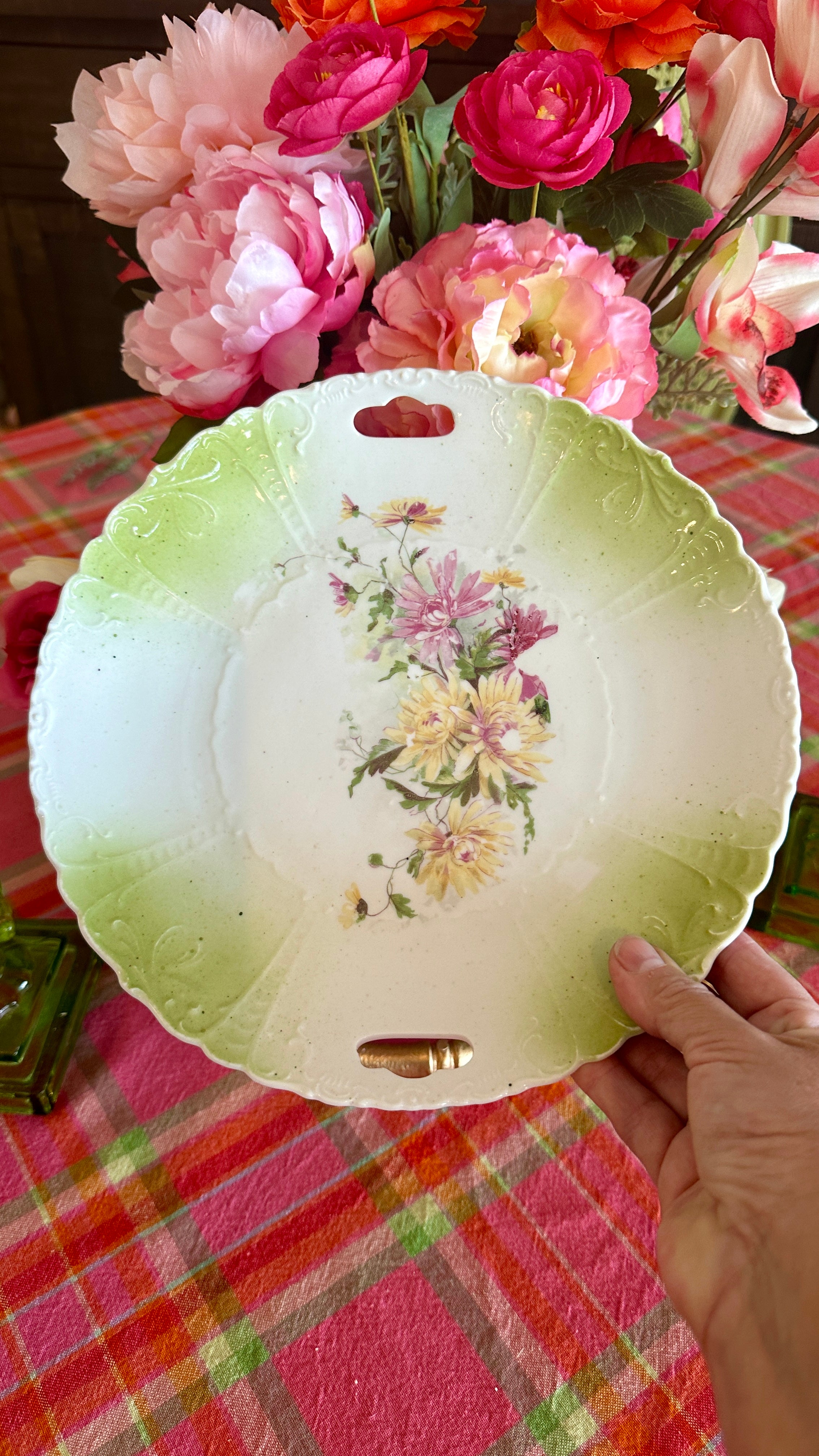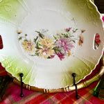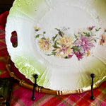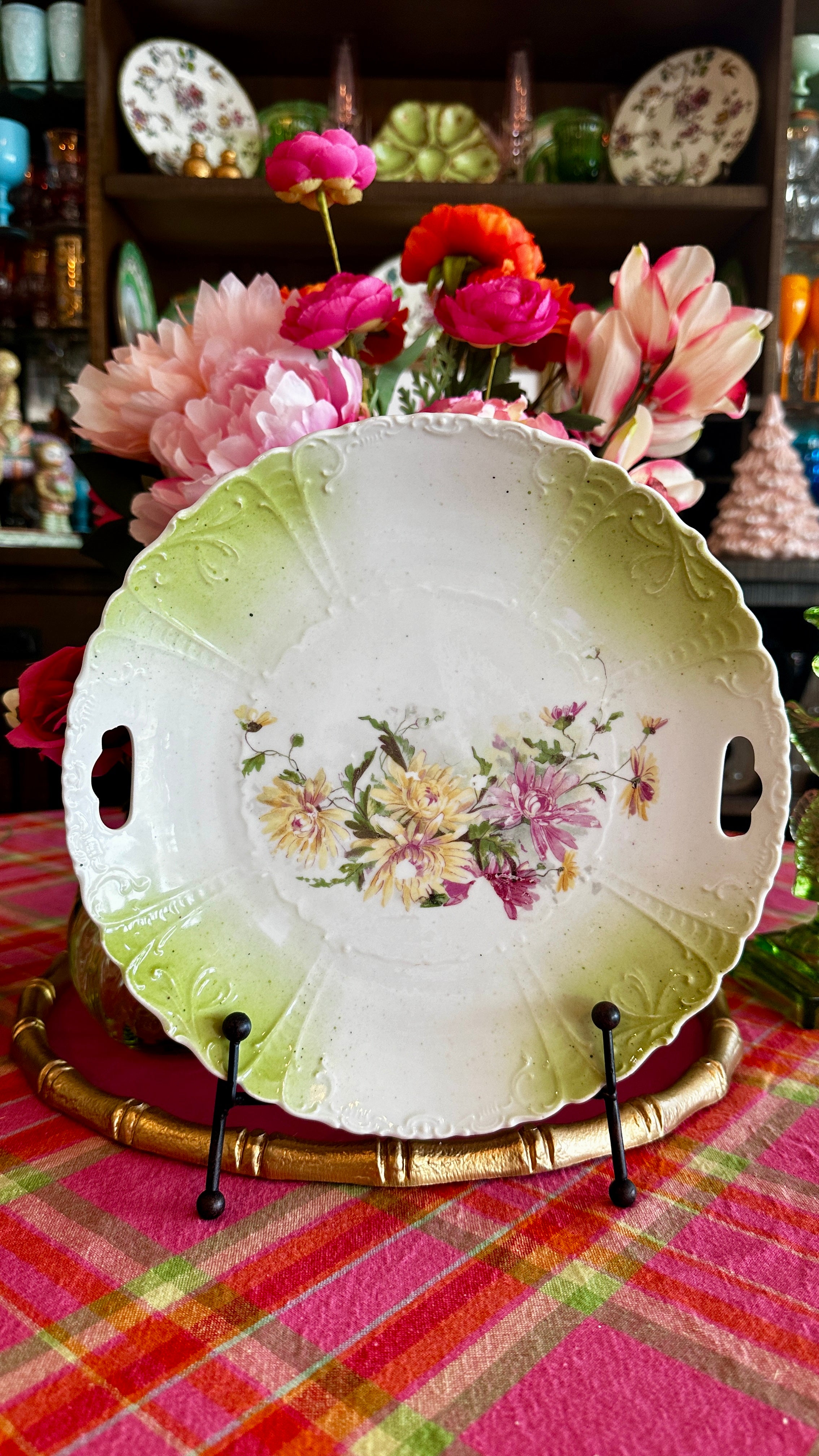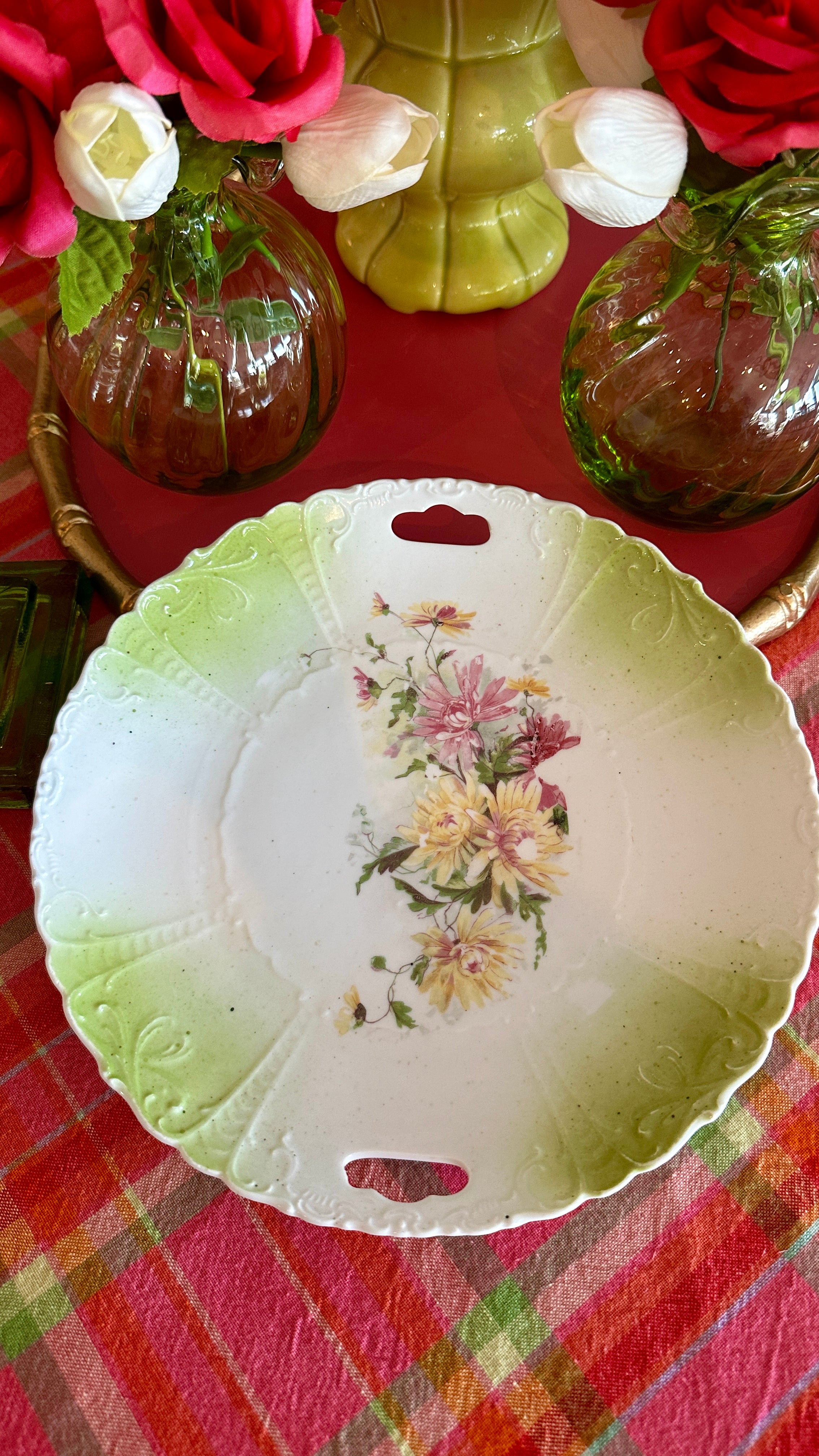 Antique Floral Plate White, Lime Green Floral, Handles, Decorative