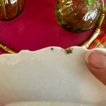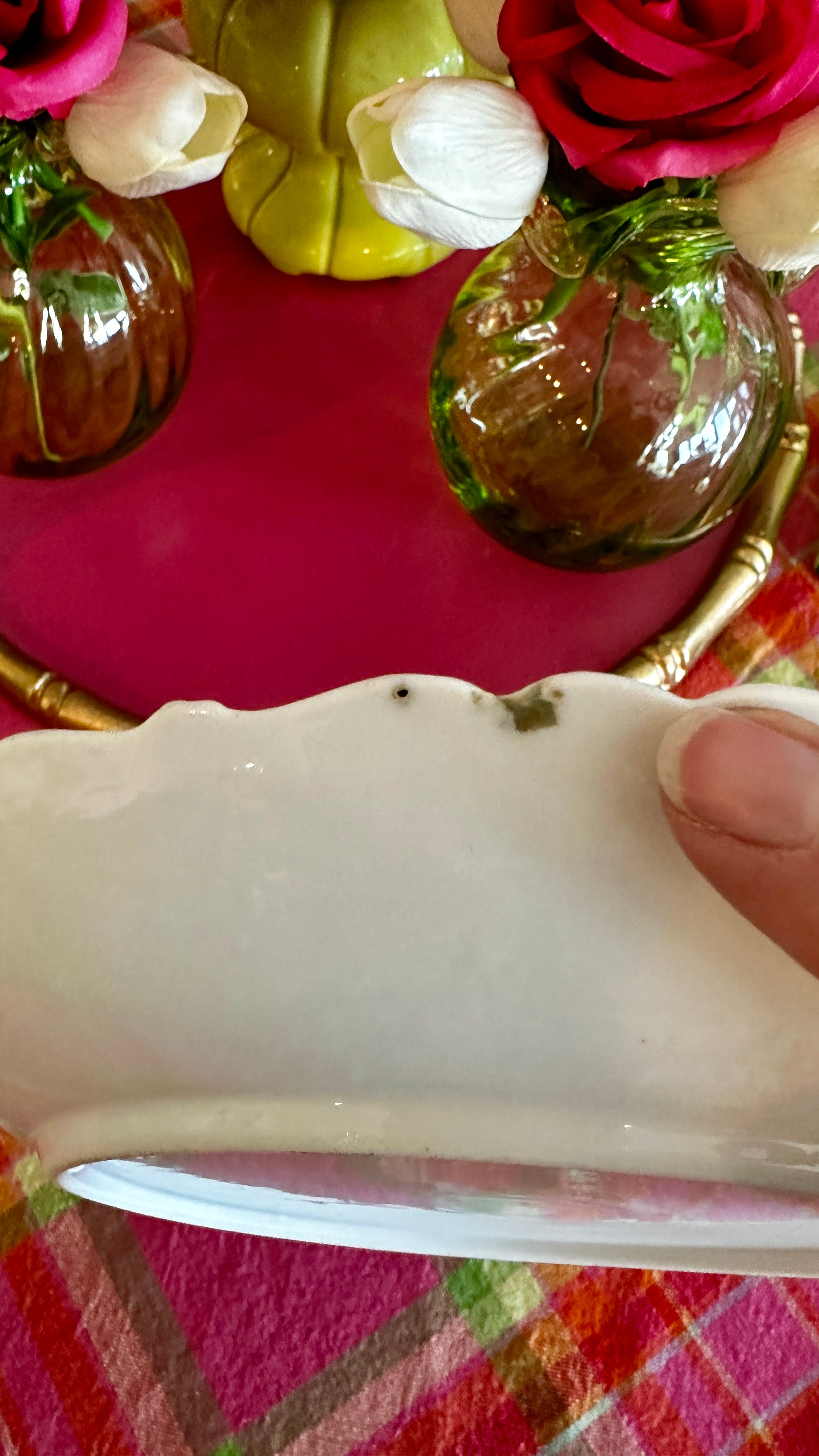 This elegant antique floral plate features a delicate white background adorned with a charming lime green floral pattern. The plate is beautifully accented with handles, making it not only a functional dish but also a stunning decorative piece. Great for a platewall or shelf display.