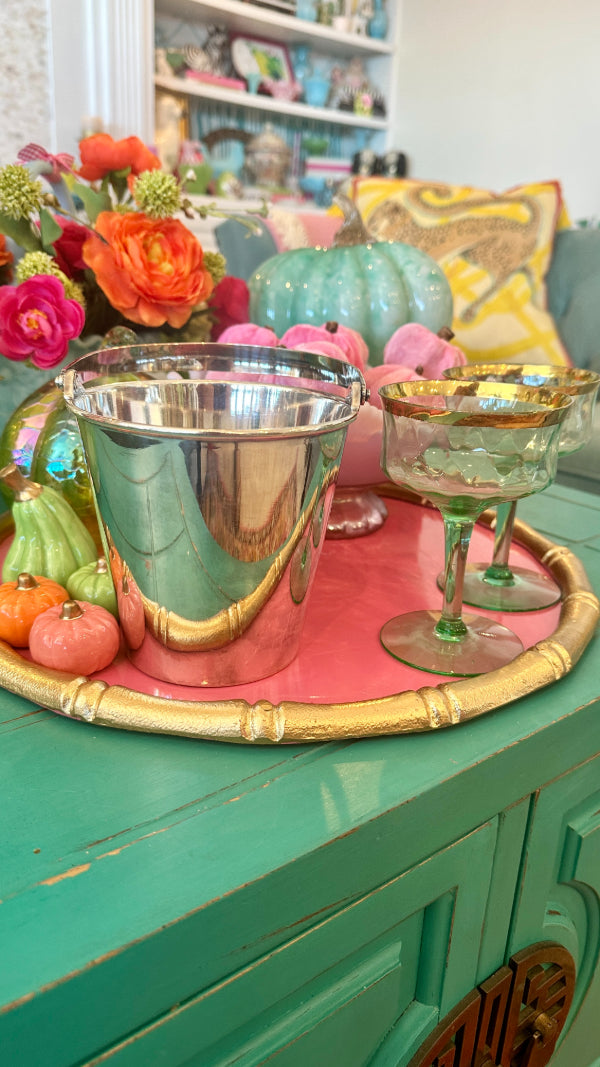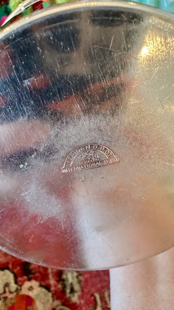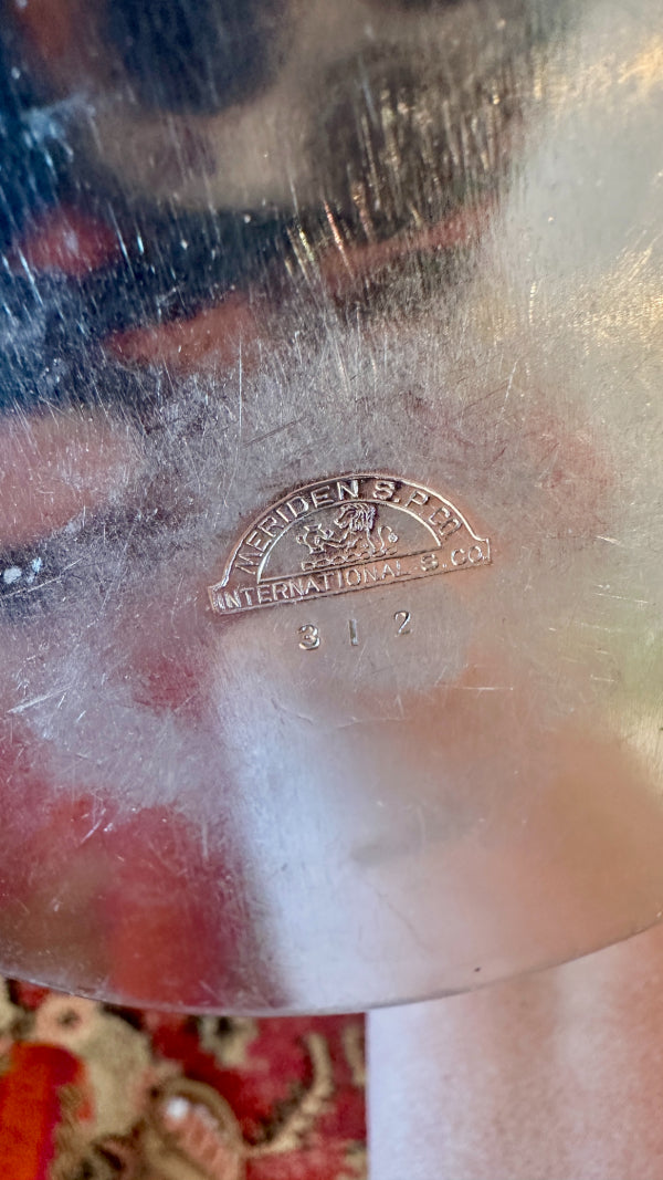 Antique Silverplate Ice Bucket by Meriden International Silver Company, stamped #312 and produced between 1898–1938. Beautifully crafted with classic Art Deco-era styling, this piece showcases Meriden’s signature quality and attention to detail. The silverplate finish adds a perfect shine to any decor. Perfect for display, entertaining, or as a collector’s piece, this antique ice bucket embodies the enduring elegance of early 20th-century American silver craftsmanship.