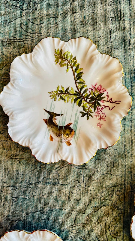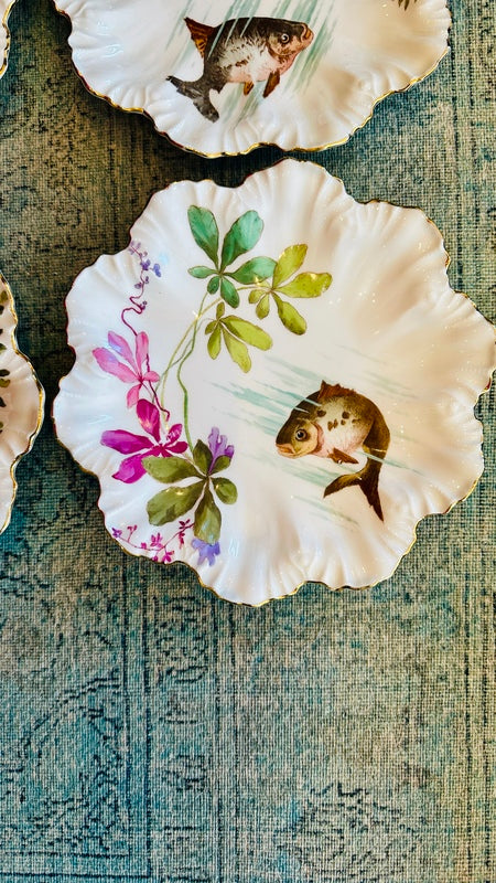 Antique Limoges Fish Plate – Hand-painted with exquisite detail, each plate showcases a unique aquatic scene, making it a stunning addition to any collection or table setting. Crafted with the timeless artistry of Limoges porcelain, these elegant plates are perfect for displaying or using for special occasions. Four plates available, sold separately. Add a touch of classic French charm to your home decor with these beautiful vintage pieces.
