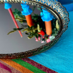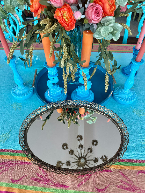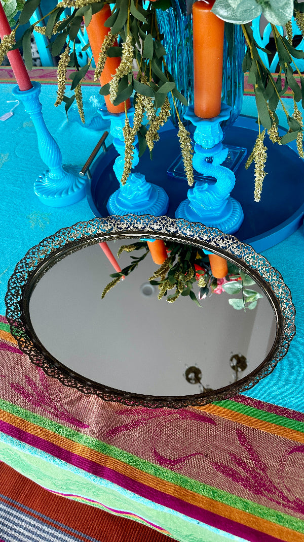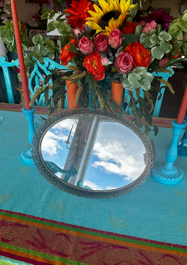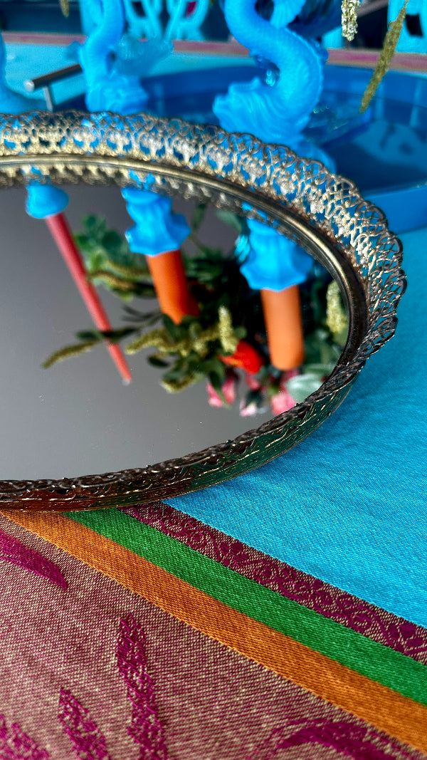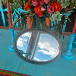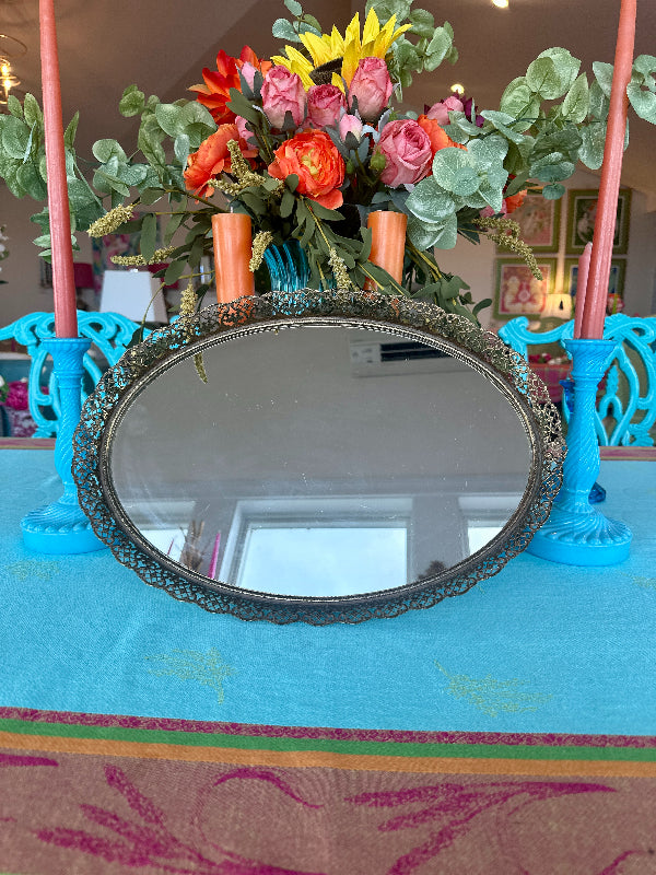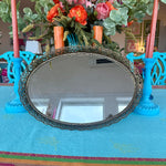 Antique Mirrored Dresser Tray, Oval, Gold Metal Ornate Edging