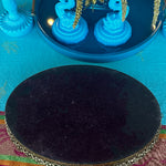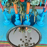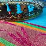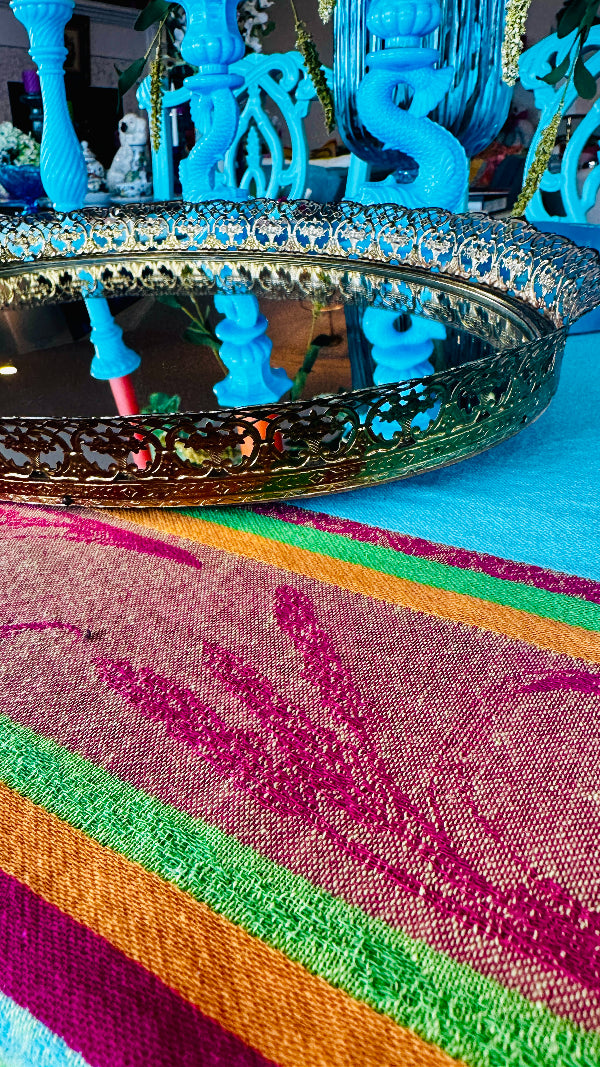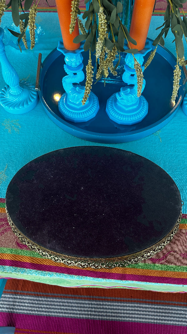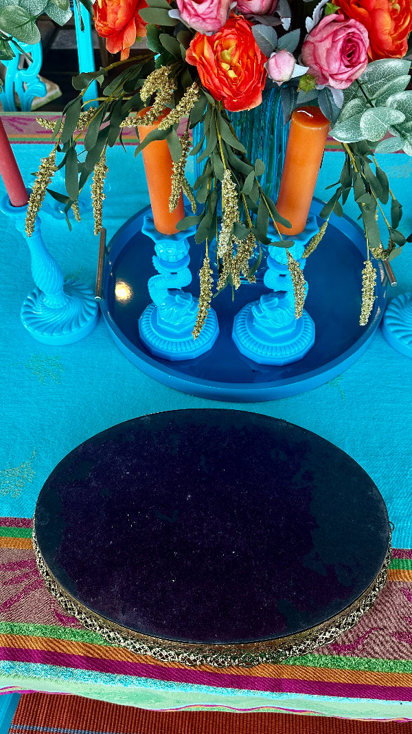 This exquisite antique mirrored dresser tray features an oval shape with intricate gold metal ornate edging. The reflective surface adds a touch of sophistication, making it an ideal piece for displaying jewelry, perfumes, or other decorative items. Perfect for adding vintage charm to your vanity or dresser, this tray is both functional and elegant.