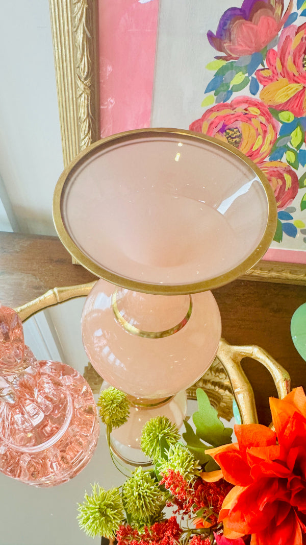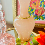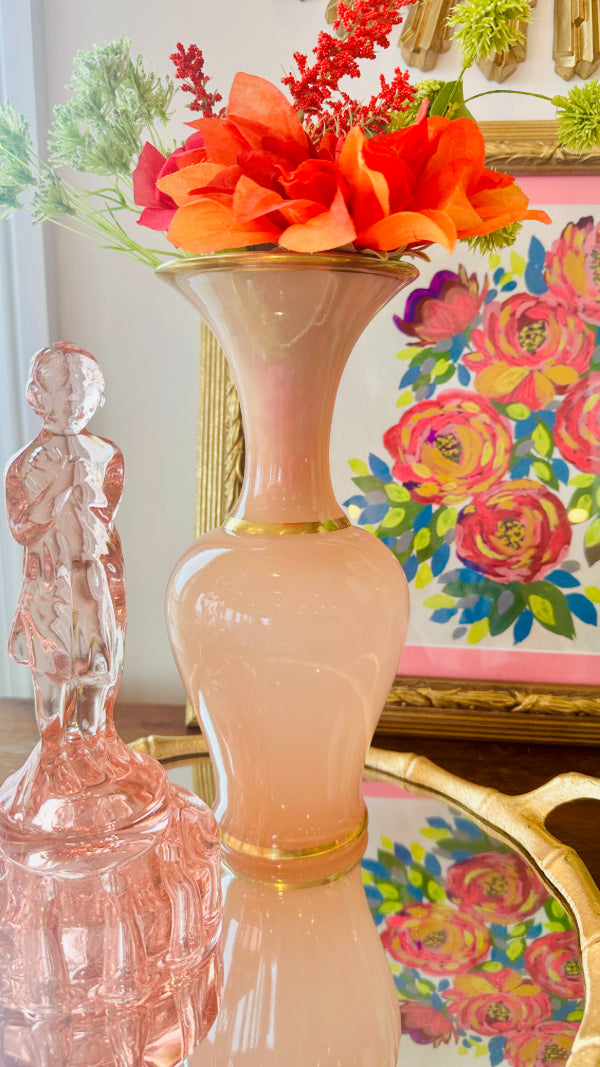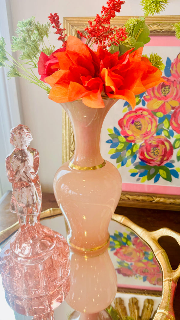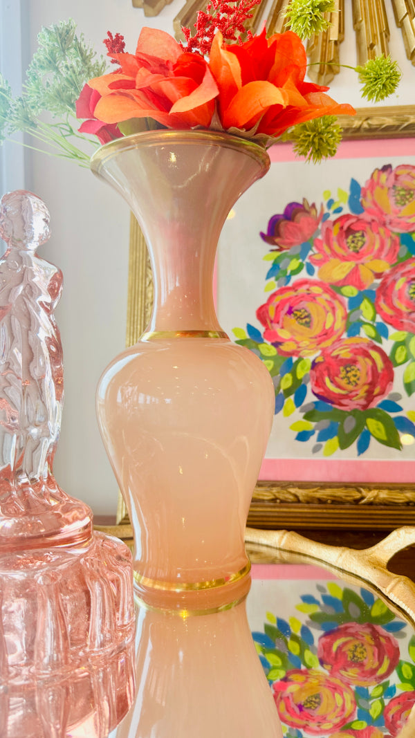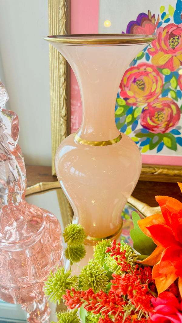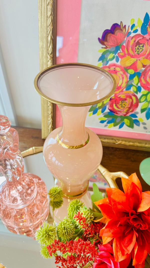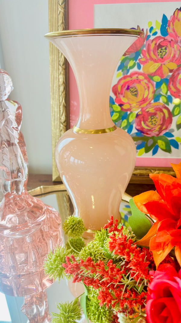 Add a touch of timeless elegance to your home with this exquisite Antique Pink Opaline Vase accented with hand-applied gold trim. Delicately crafted from luminous pink opaline glass, this vase showcases the soft, milky translucence and refined artistry characteristic of 19th-century French glassmaking.