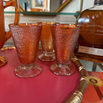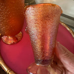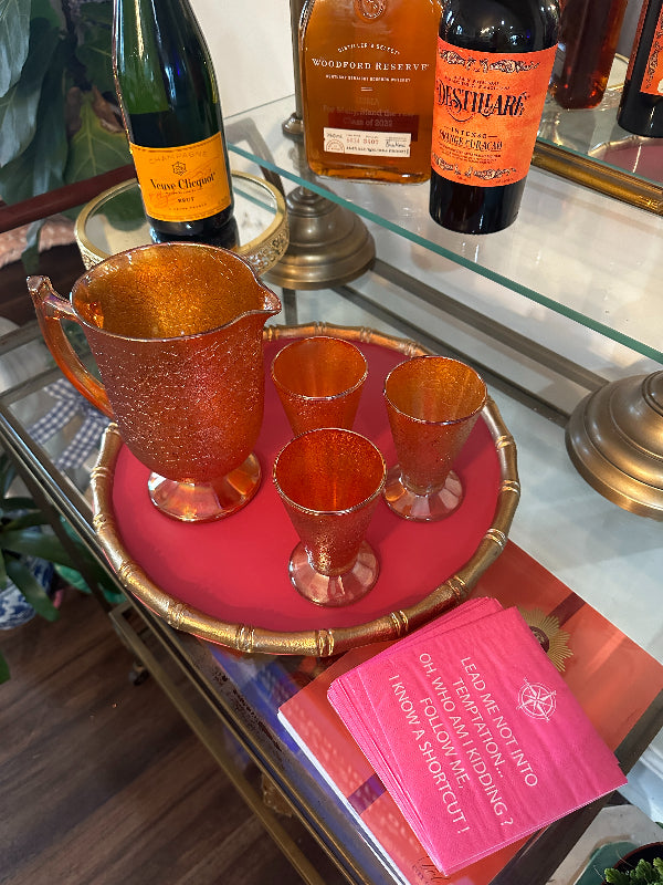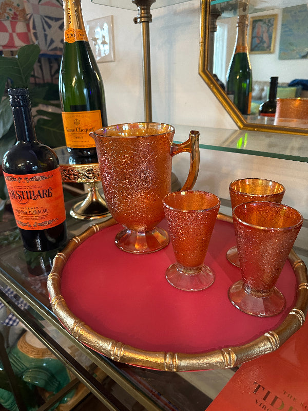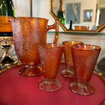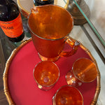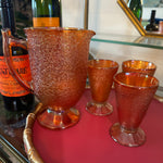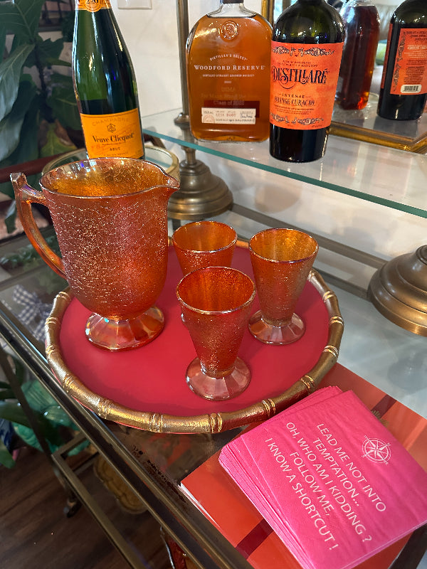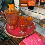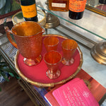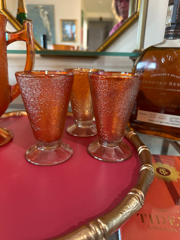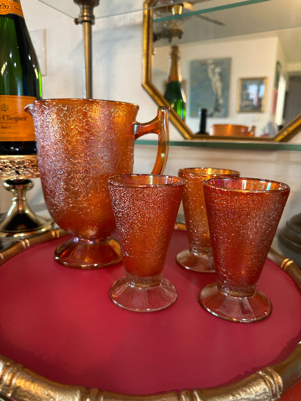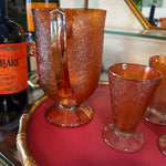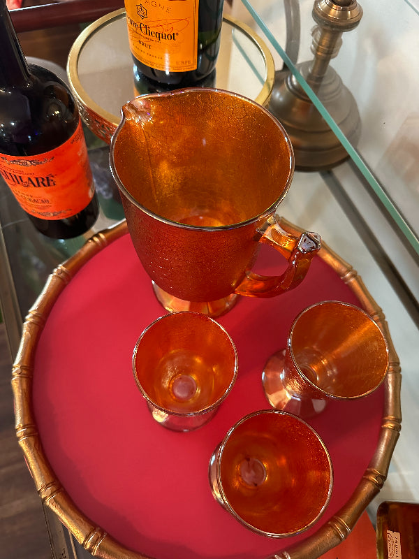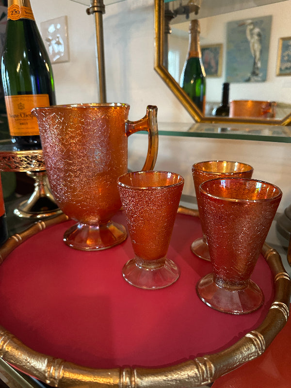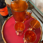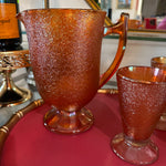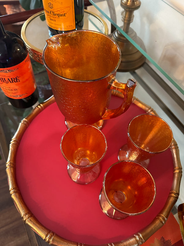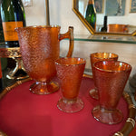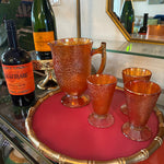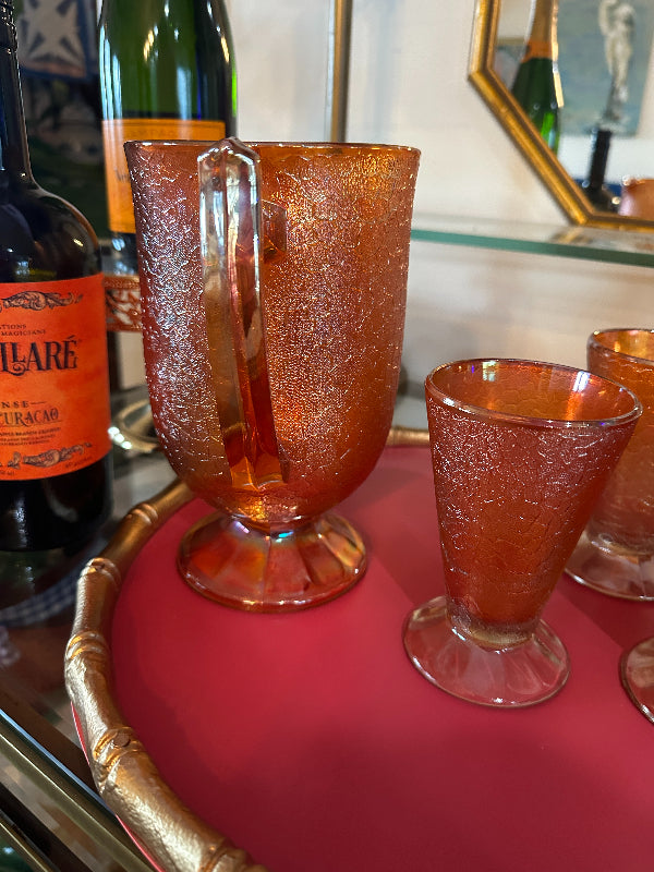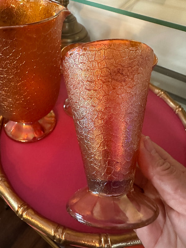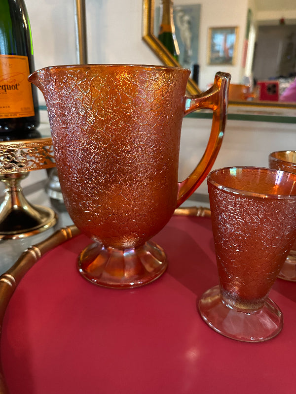 Antique Pitcher and Glass Set, crafted from Jeanette Carnival Glass in a mesmerizing Marigold hue. The set features a stunning Crackle Pattern that brings a touch of vintage elegance to your table. Each piece is adorned with an iridescent finish, creating a captivating visual display. This set includes three glasses and one pitcher, making it a perfect addition to your collection or a unique statement piece for special occasions.