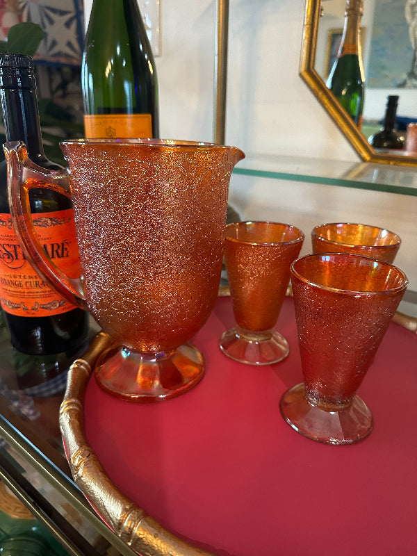 Antique Pitcher and Glass Set, Jeanette Carnival Glass, Marigold, Crackle Pattern, Irridescent set of 4, 3 Glasses, 1 pitcher
