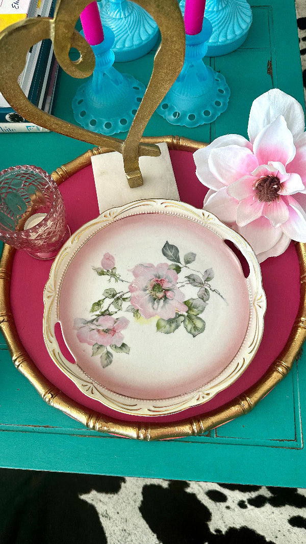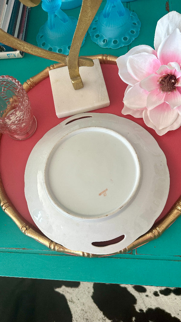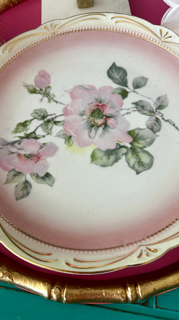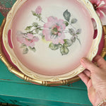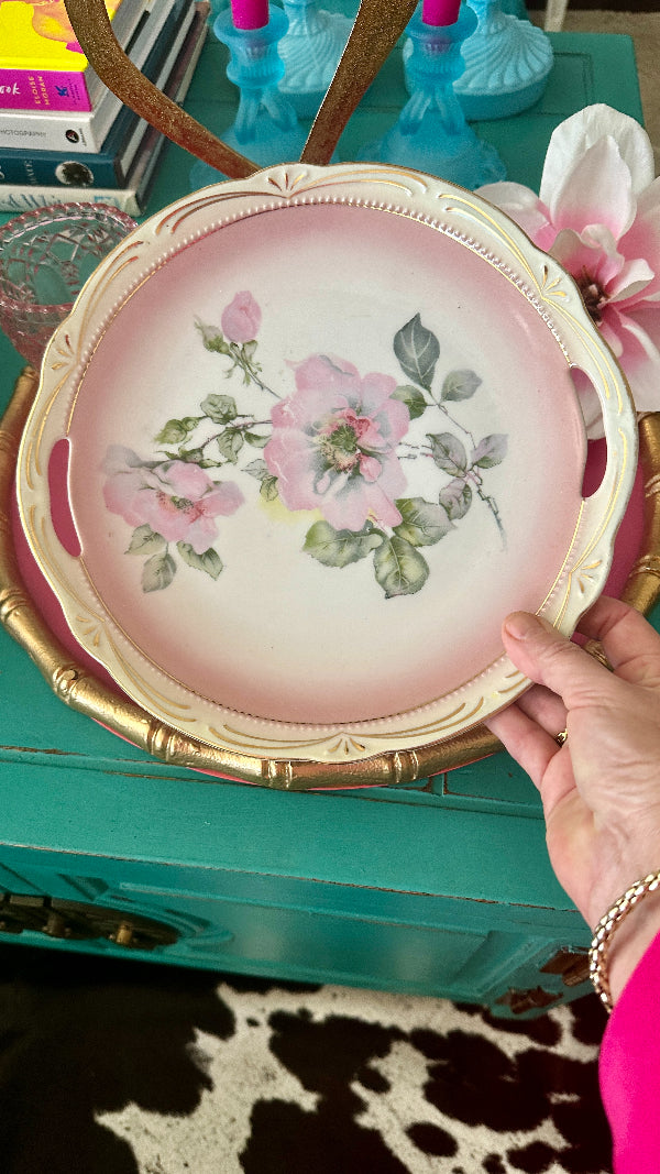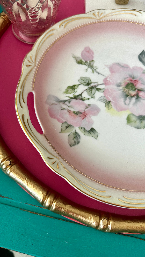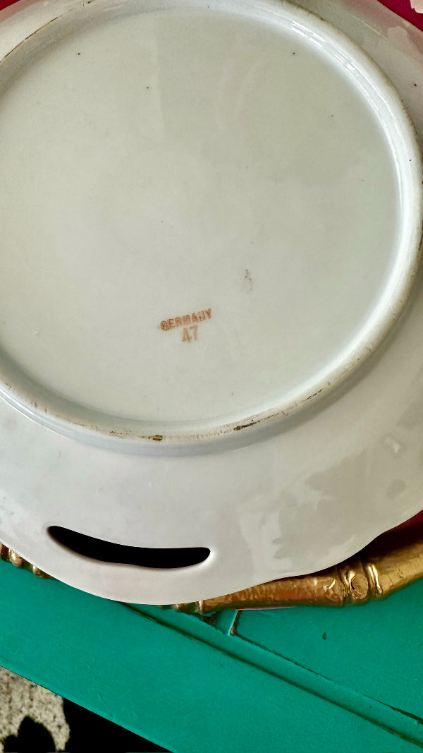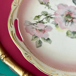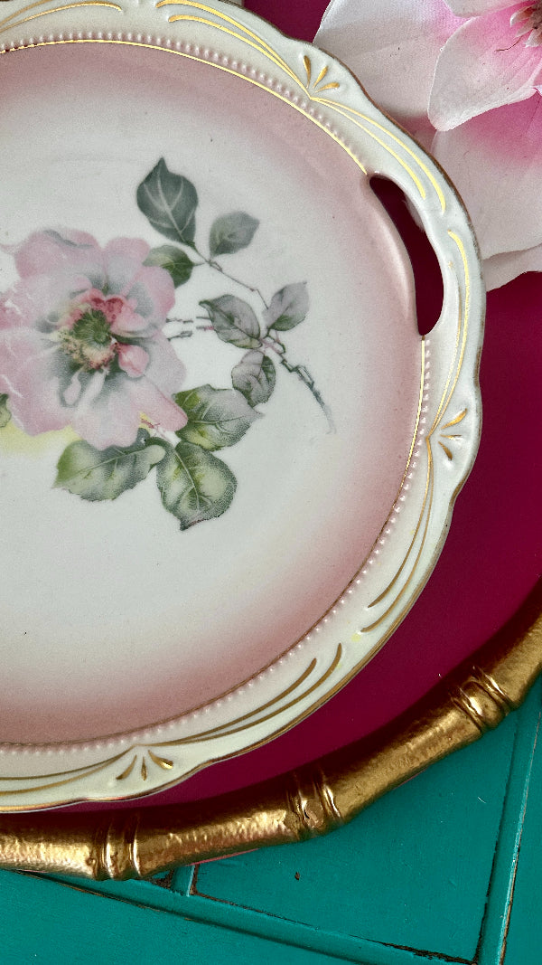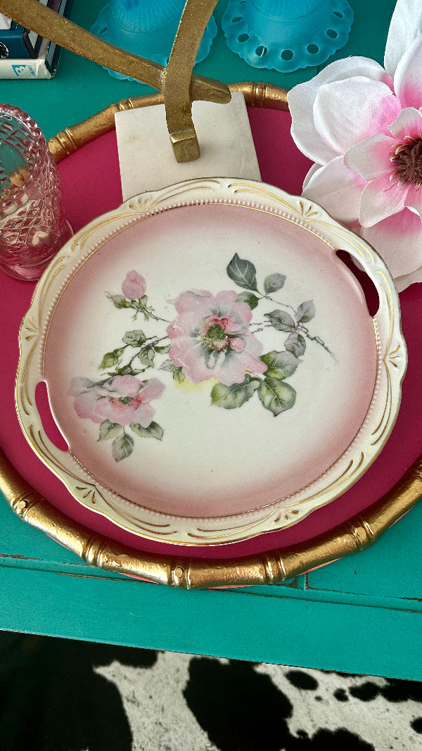 Antique Plate, Germany 47, Hand Painted, Pink and Green Floral, Gold Detail, Handled