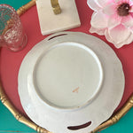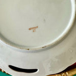 Antique Plate from Germany, circa 1947, boasting delicate hand-painted pink and green floral motifs adorned with intricate gold detailing. This elegant piece features graceful handles, adding to its timeless charm and historical allure.