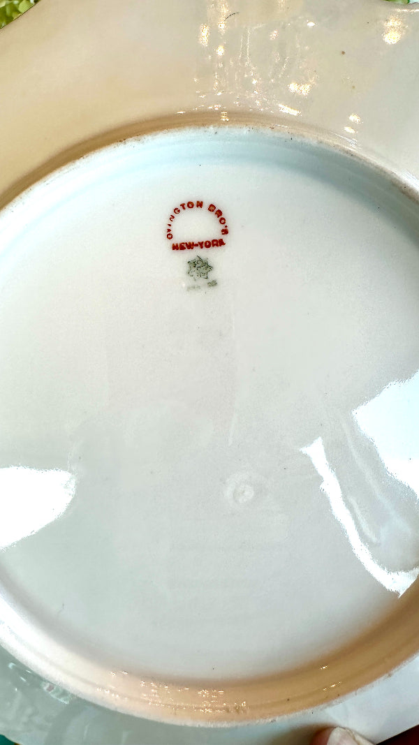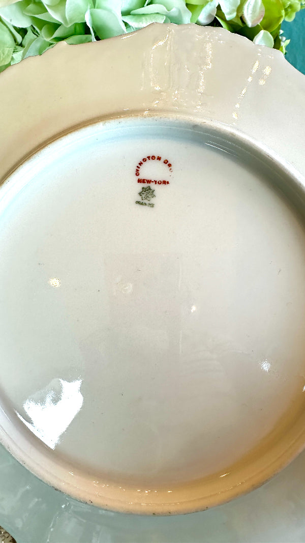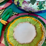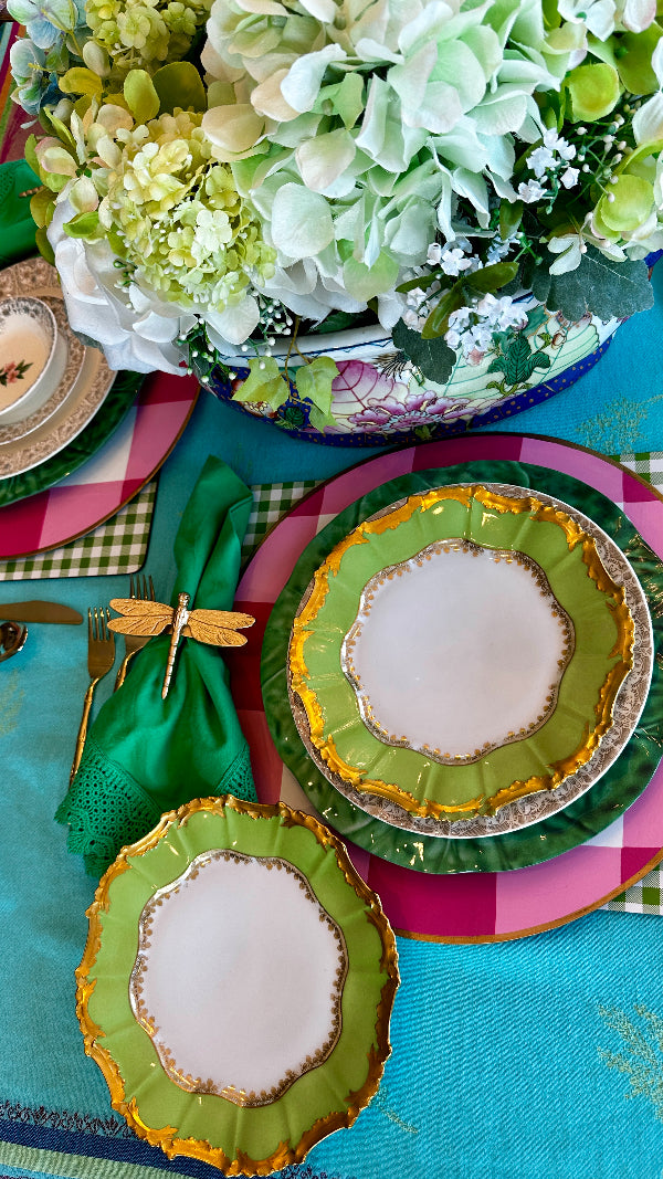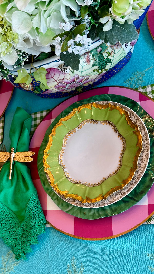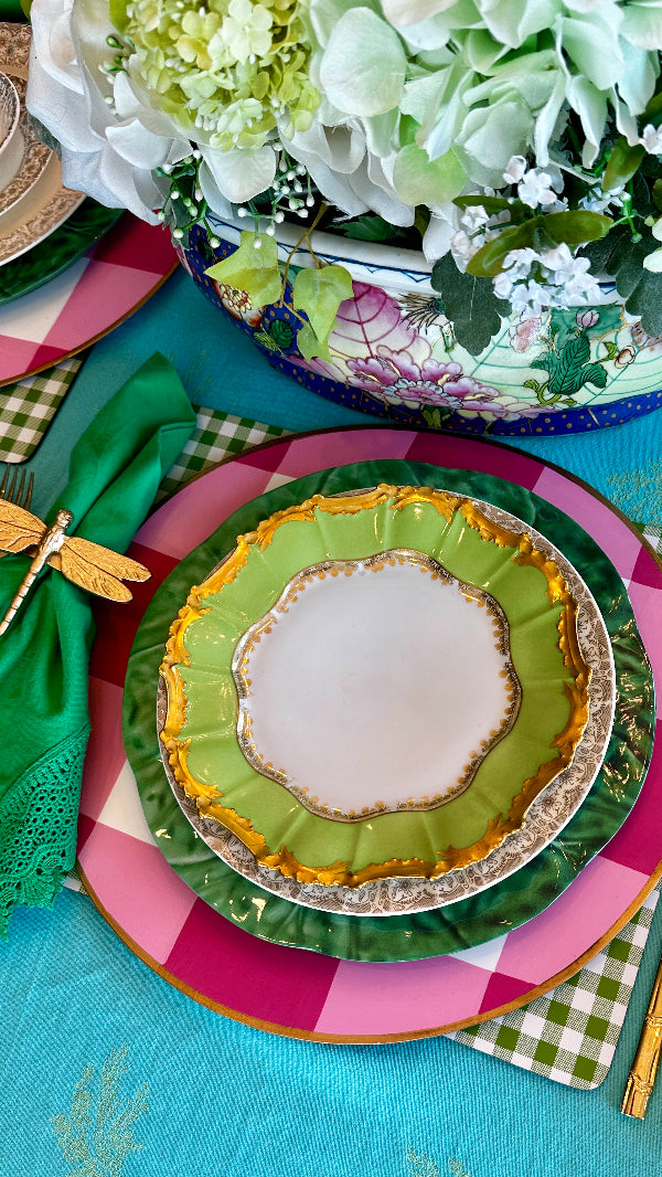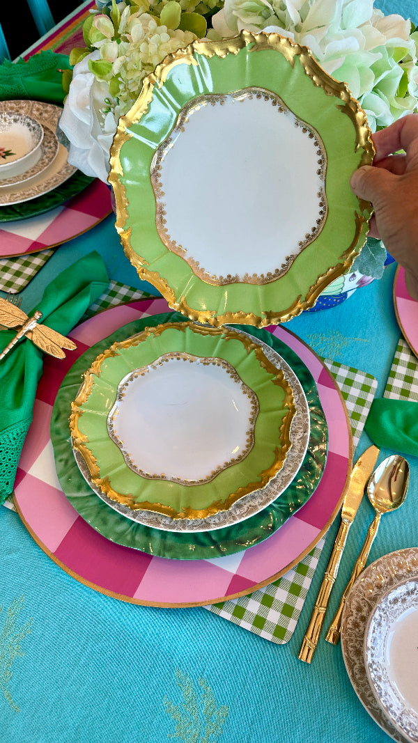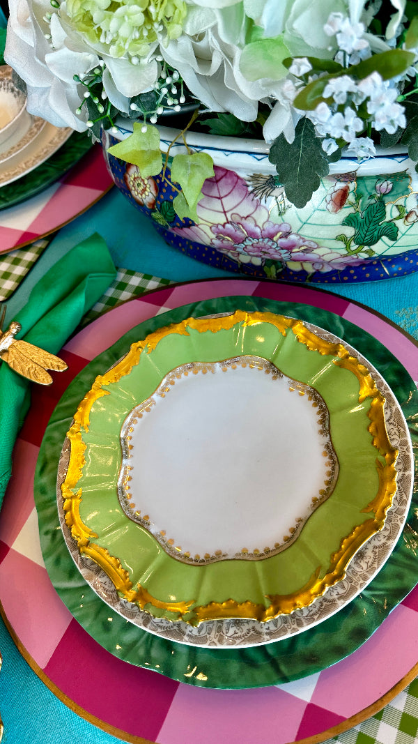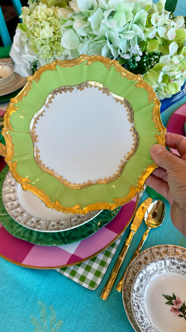 Enhance your dining experience with this stunning set of 2 antique plates from GDD New York. Featuring a harmonious blend of green, gold, and white, these plates showcase exquisite craftsmanship and timeless elegance. Perfect for collectors and those who appreciate fine dining, these plates are a beautiful addition to any table setting, reflecting the rich history and sophisticated design of GDD New York. Mix and match with your antique china or add them to a plate wall.
