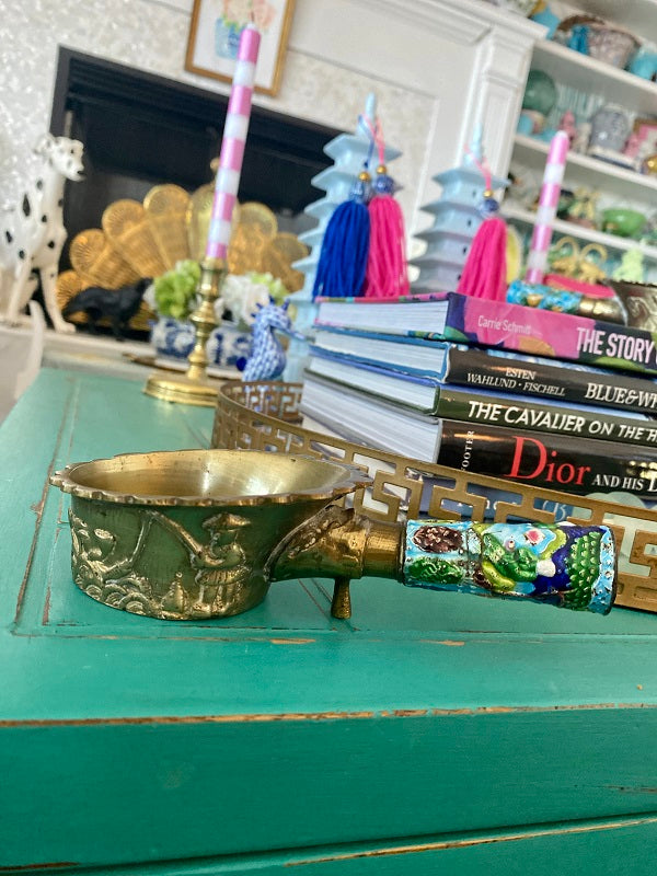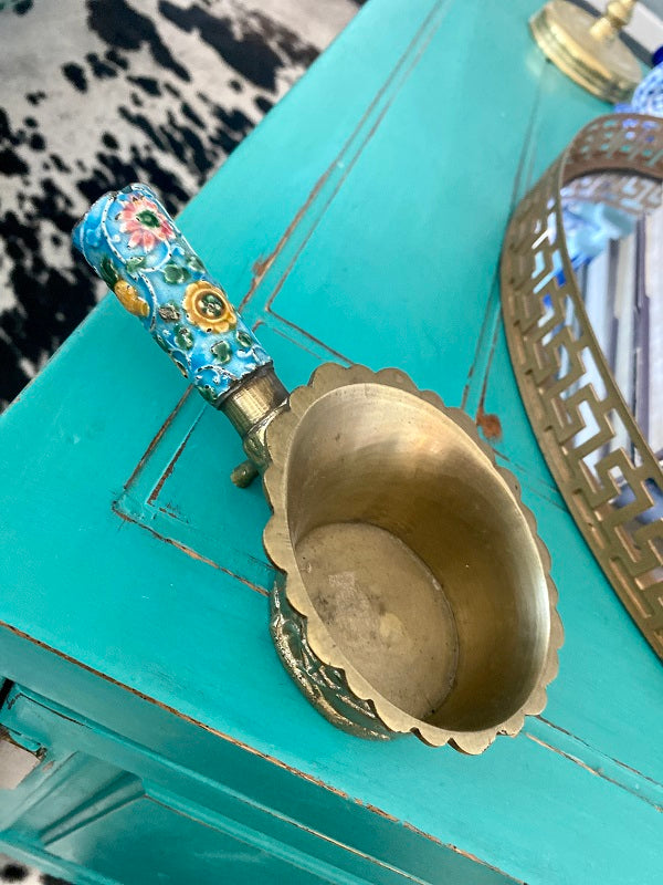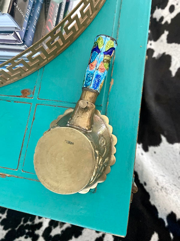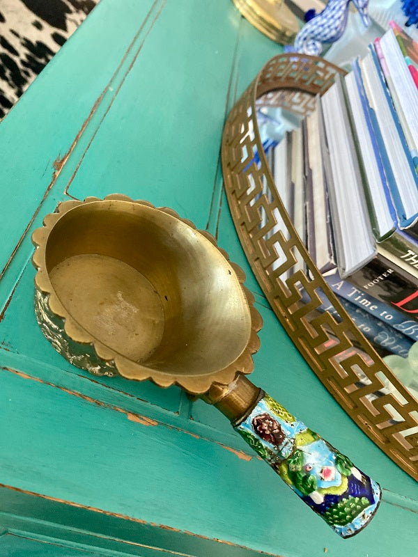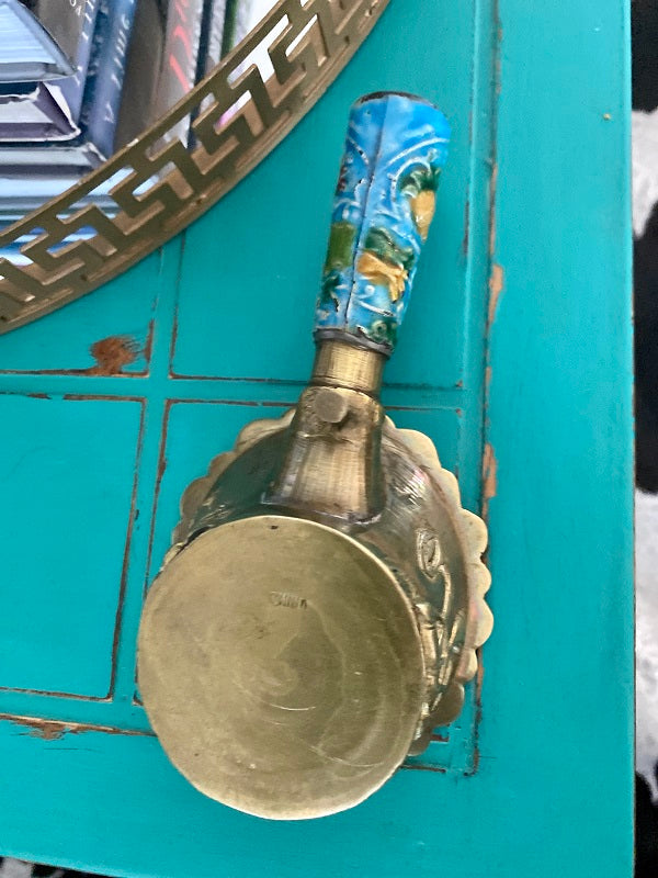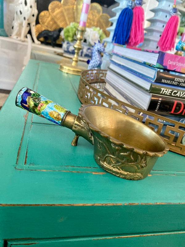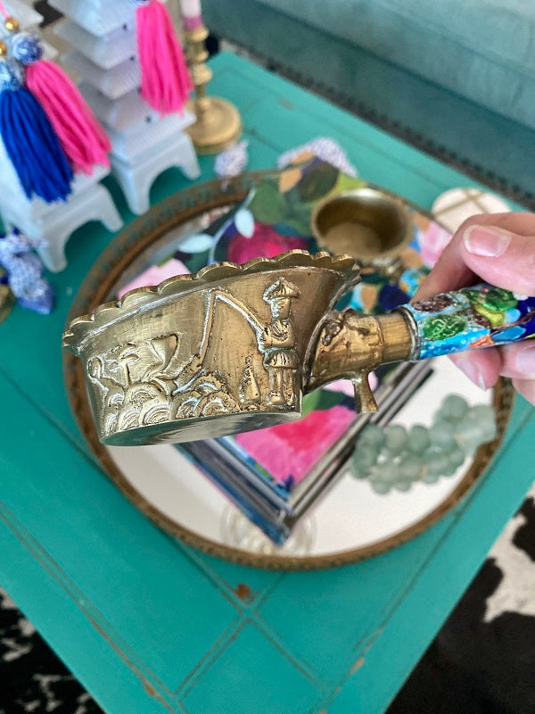 These decorative beauties are actually irons. Chinese ladies would add hot coals to the brass cup and then use the cloisonne' handle to keep from burning themselves while they ironed their silks. They each have raised scenes on the brass, scalloped edge, and colorful handles. They are stamped China on the bottom. These are a rare find. Add this great conversation piece to a shelf, tabletop or bar cart for nuts, candies, toothpicks or bar fruit.
