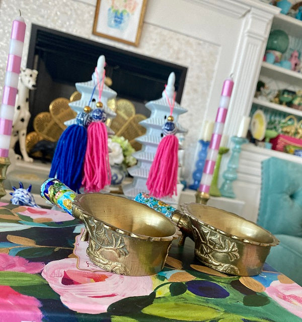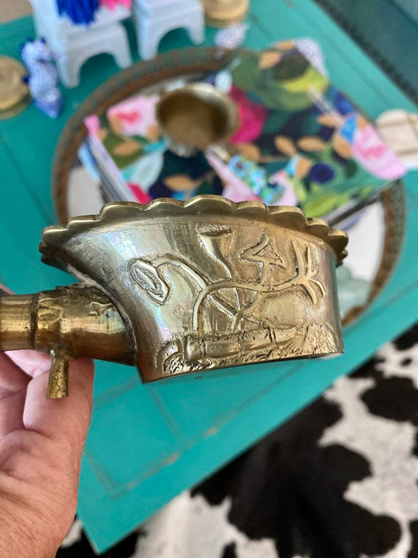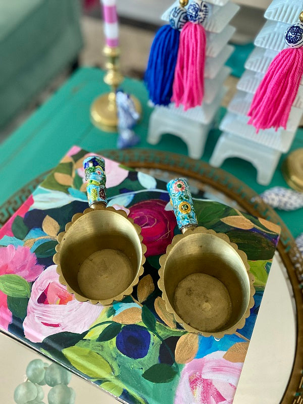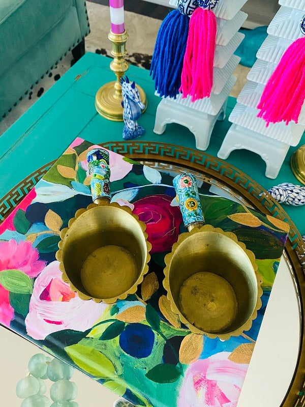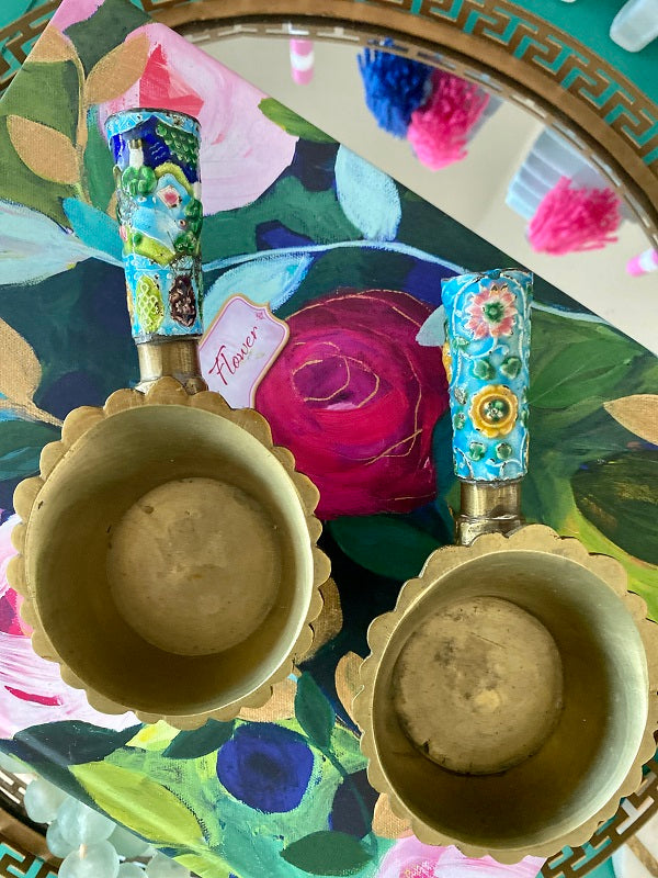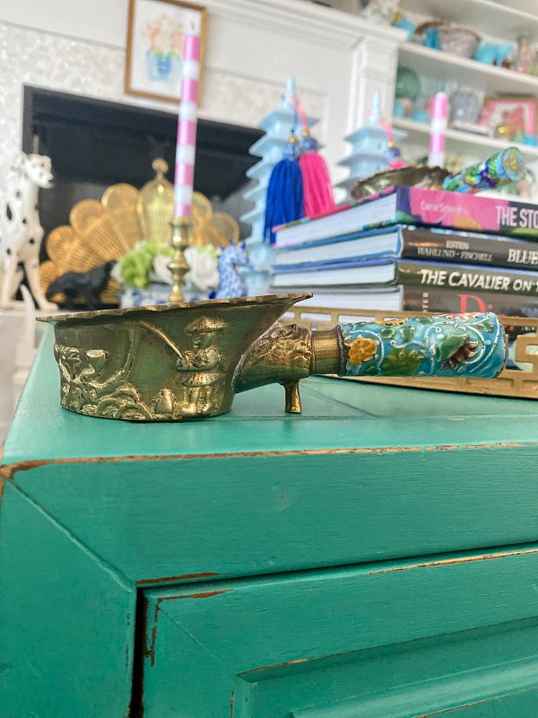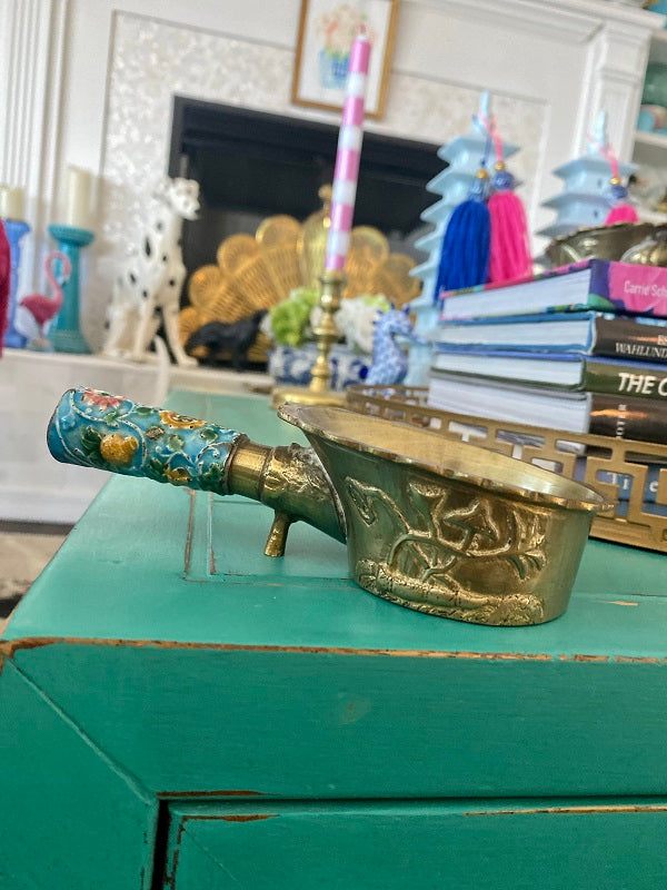 These decorative beauties are actually irons. Chinese ladies would add hot coals to the brass cup and then use the cloisonne' handle to keep from burning themselves while they ironed their silks. They each have raised scenes on the brass, scalloped edge, and colorful handles. They are stamped China on the bottom. These are a rare find. Add this great conversation piece to a shelf, tabletop or bar cart for nuts, candies, toothpicks or bar fruit.