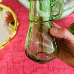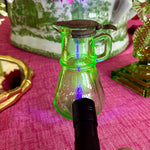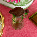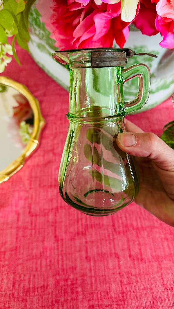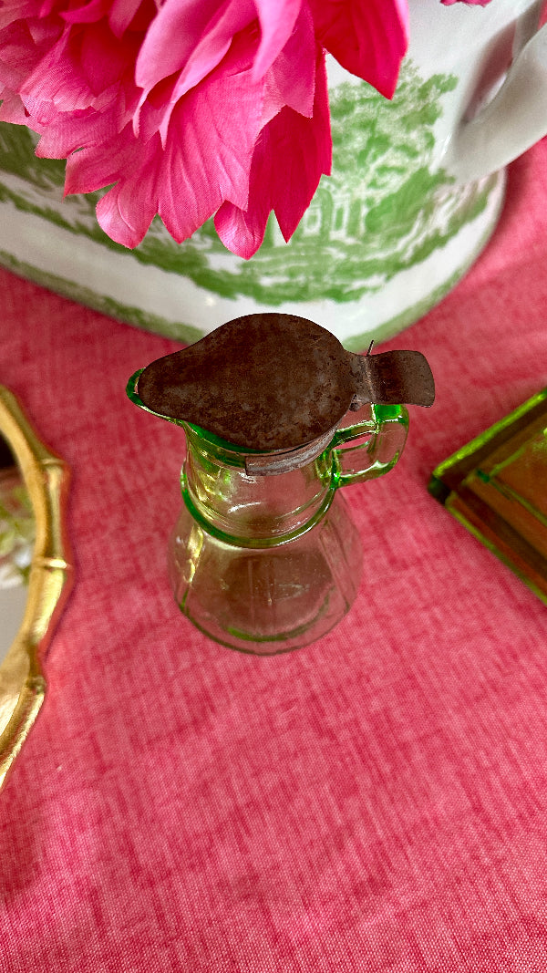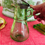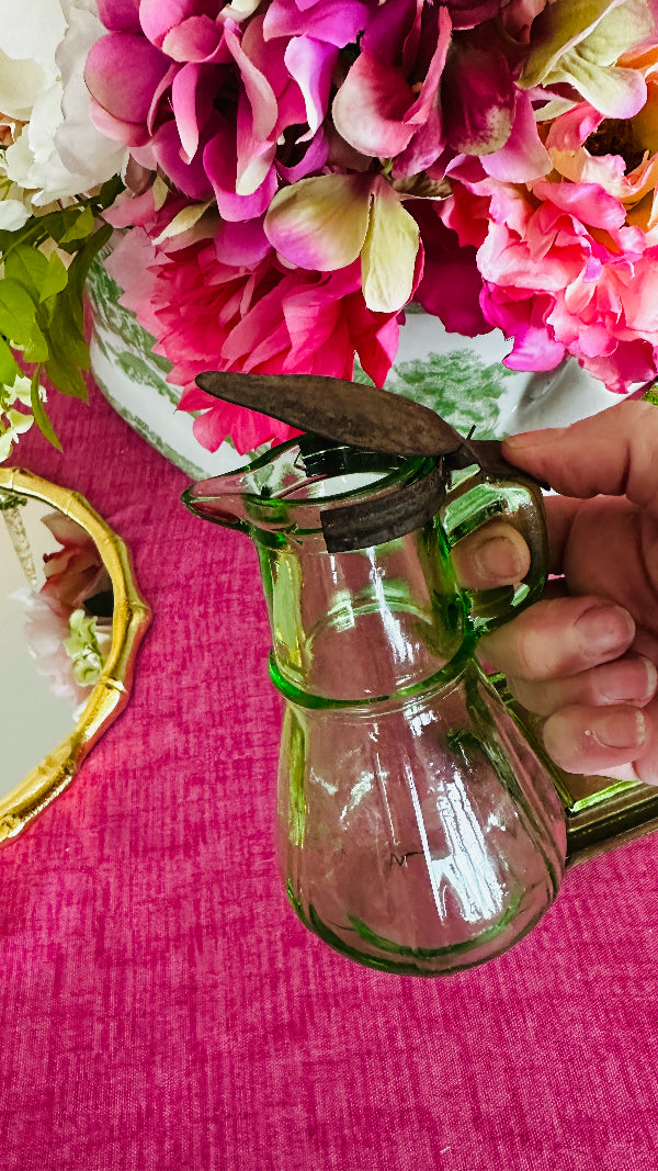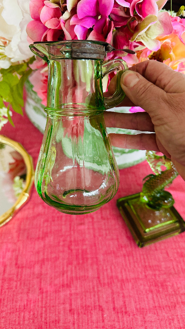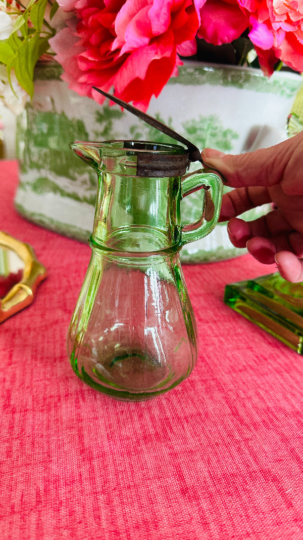 Antique Syrup Pitcher, Hazel Atlas Green Vaseline Uranium Glass, Metal Hinged Lid