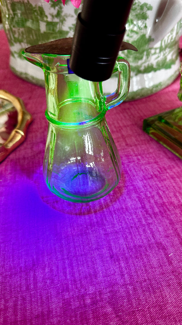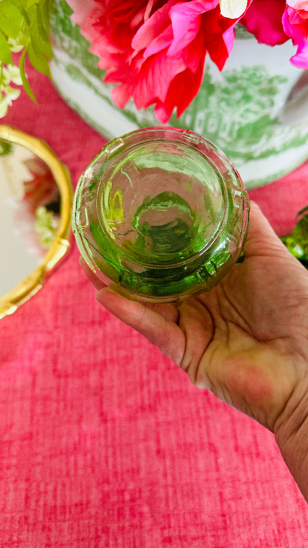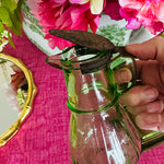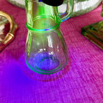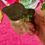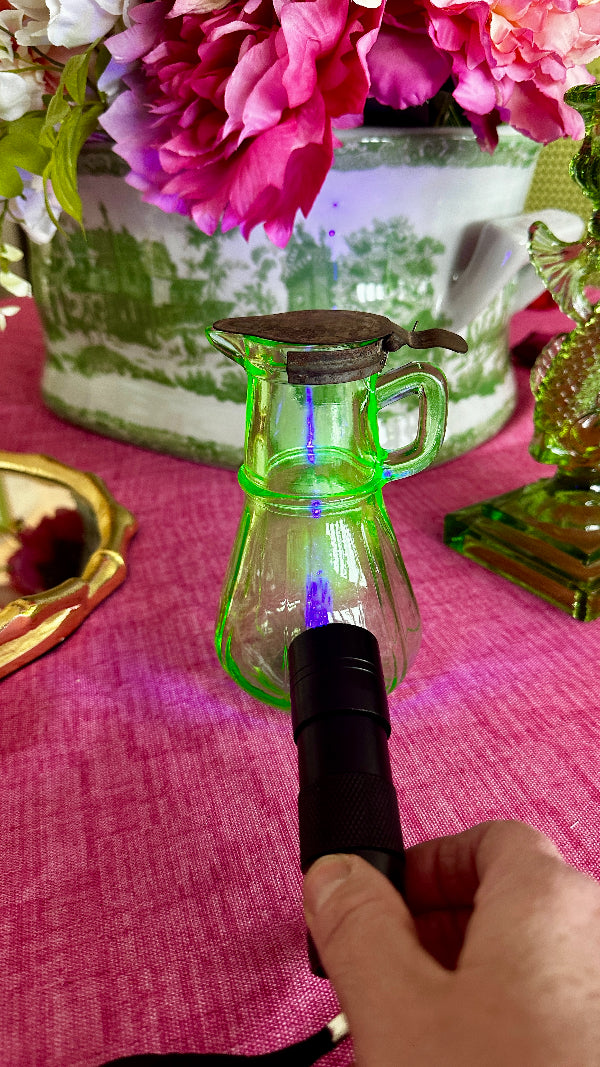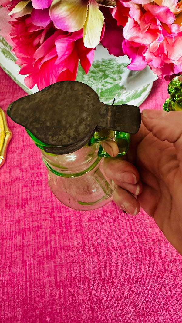 This Antique Syrup Pitcher is a stunning piece made of Hazel Atlas Green Vaseline Uranium Glass. The unique color of the glass, combined with the metal hinged lid, adds a touch of bygone days to any table setting. The top is rusted but working with the hinge, these are very hard to find with the lid in tact. Perfect for serving your favorite syrups with a vintage flair.