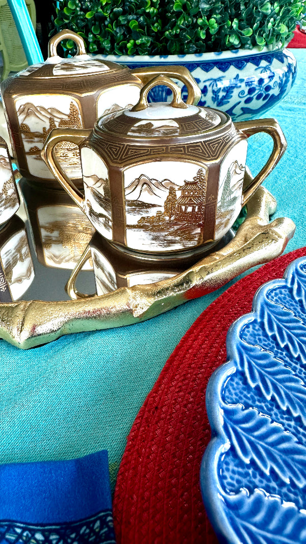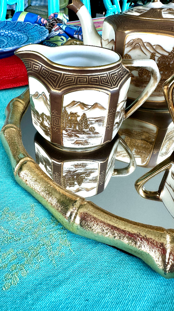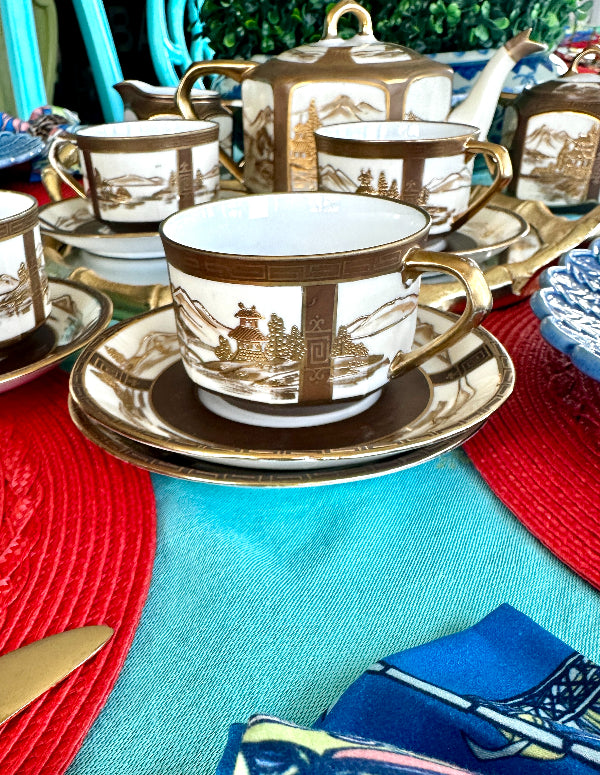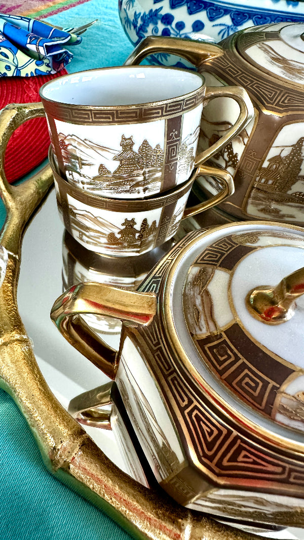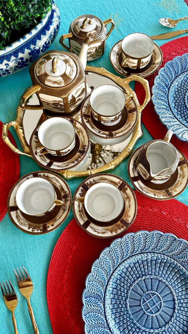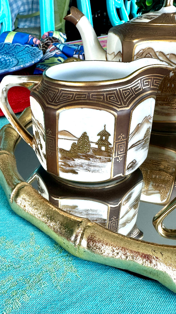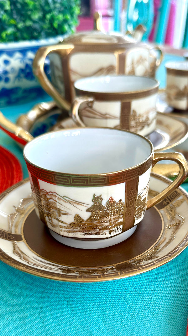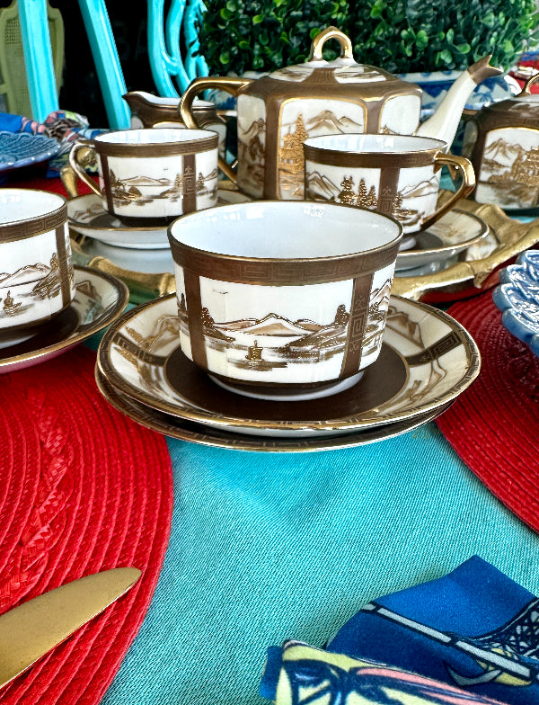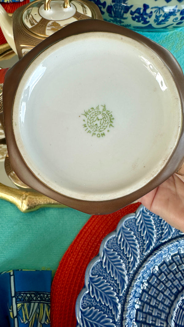 Experience timeless elegance with this exquisite 14-piece antique tea set by Noritake Morimura Bros. This hand-painted Gold, brown and cream Japanese set includes a lidded teapot, lidded sugar bowl, creamer, five teacups, and six saucers, each piece reflecting the exceptional craftsmanship and intricate artistry of Noritake. Perfect for adding a touch of vintage charm to your tea gatherings, this set beautifully combines functionality and aesthetic appeal.
