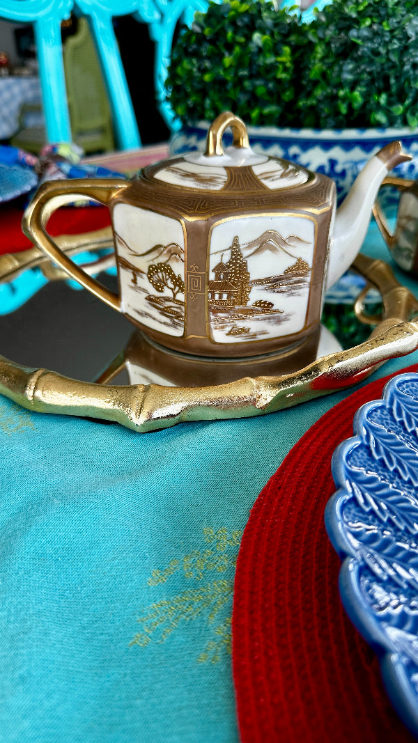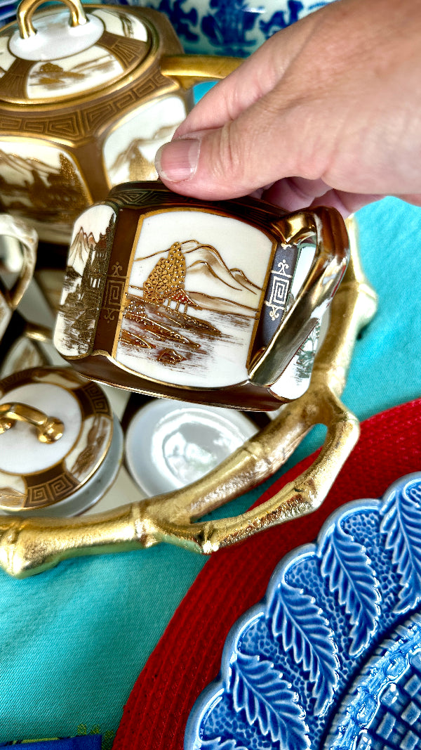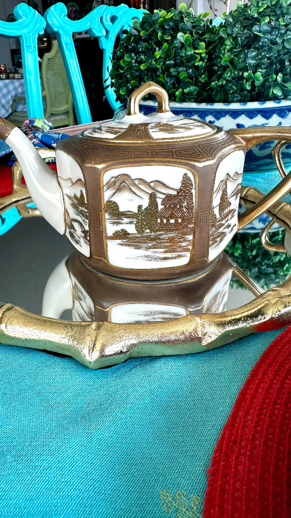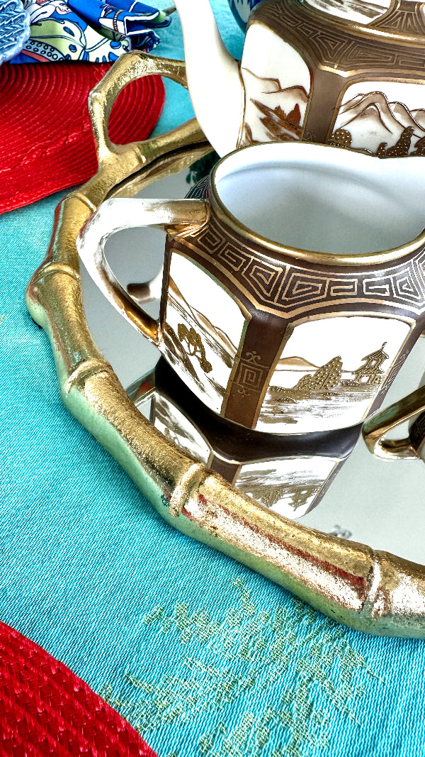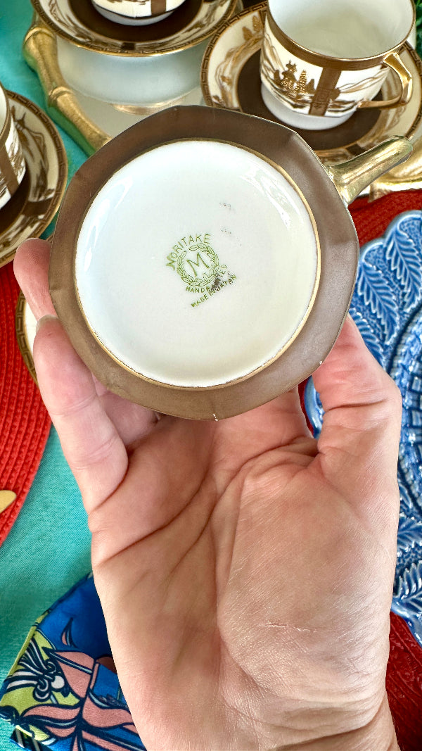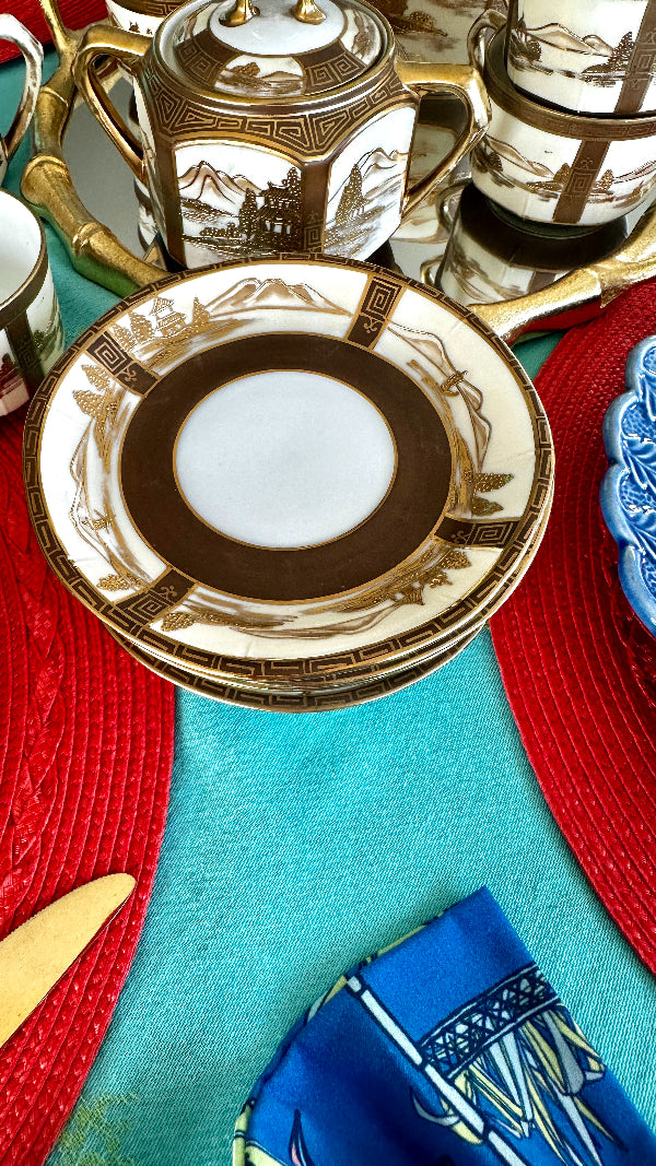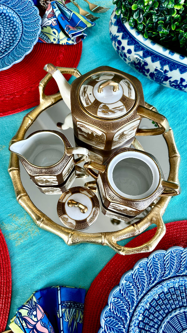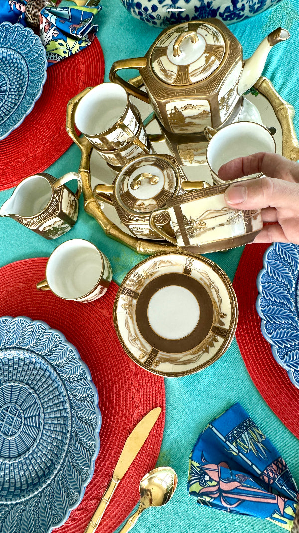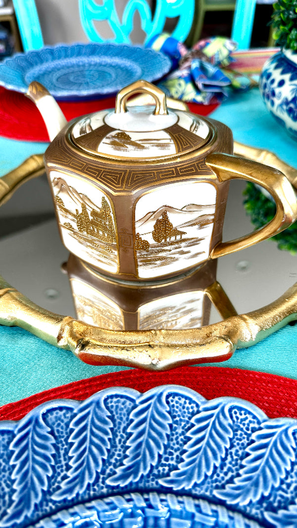 Experience timeless elegance with this exquisite 14-piece antique tea set by Noritake Morimura Bros. This hand-painted Gold, brown and cream Japanese set includes a lidded teapot, lidded sugar bowl, creamer, five teacups, and six saucers, each piece reflecting the exceptional craftsmanship and intricate artistry of Noritake. Perfect for adding a touch of vintage charm to your tea gatherings, this set beautifully combines functionality and aesthetic appeal.