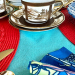 teapot 9 x 5 x 3 1/2", Sugar 6 x 3 1/2 x 3 1/2", creamer 5 x 3 1/2 x 3", teacup 4 x 3 x 2", saucer 5 1/4" diam