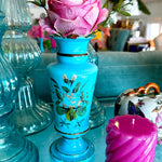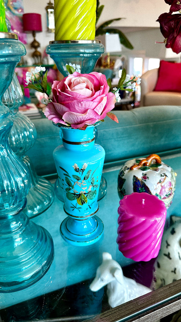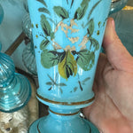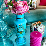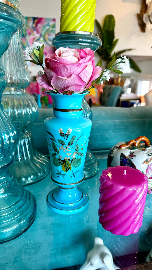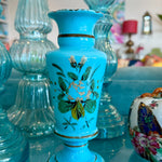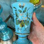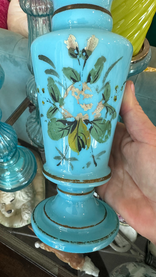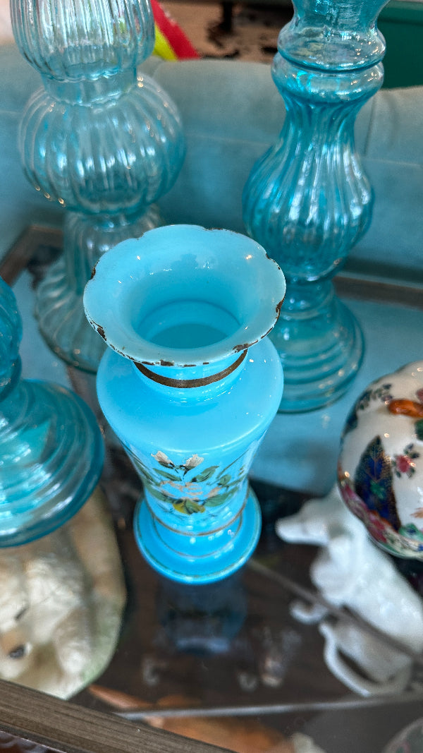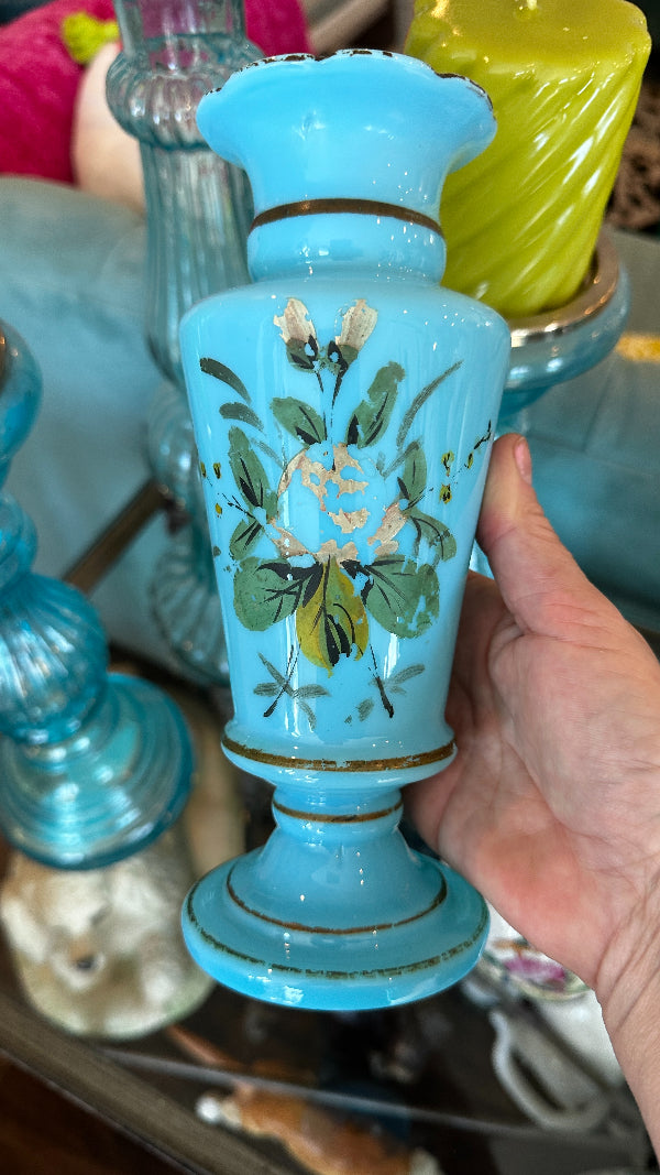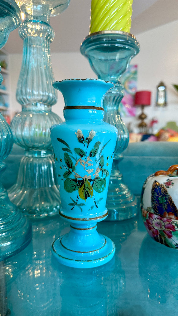 Antique Vase, French Blue Opaline Glass, Hand Painted, 1900s
