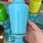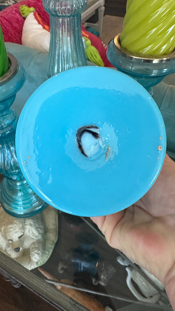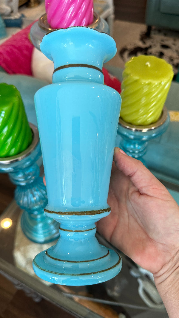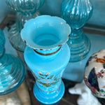 Antique French Blue Opaline Glass Vase from the 1900s. This vase is a testament to the timeless artistry of the era, featuring delicate hand-painted details that enhance the beauty of the opalescent blue glass. This antique vase offers a glimpse into the elegance and sophistication of 20th-century French artistry. Some paint wear typical with age. Otherwise great antique condition, no chips or cracks.