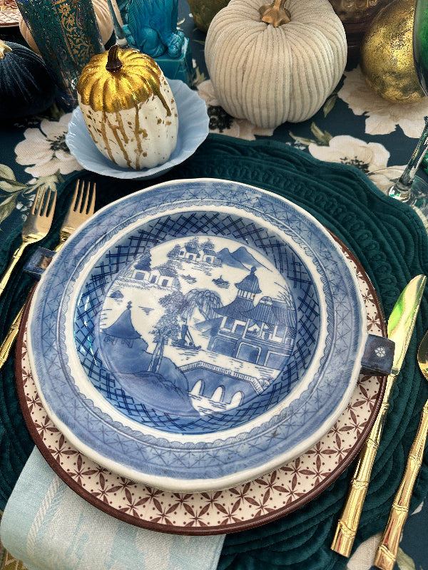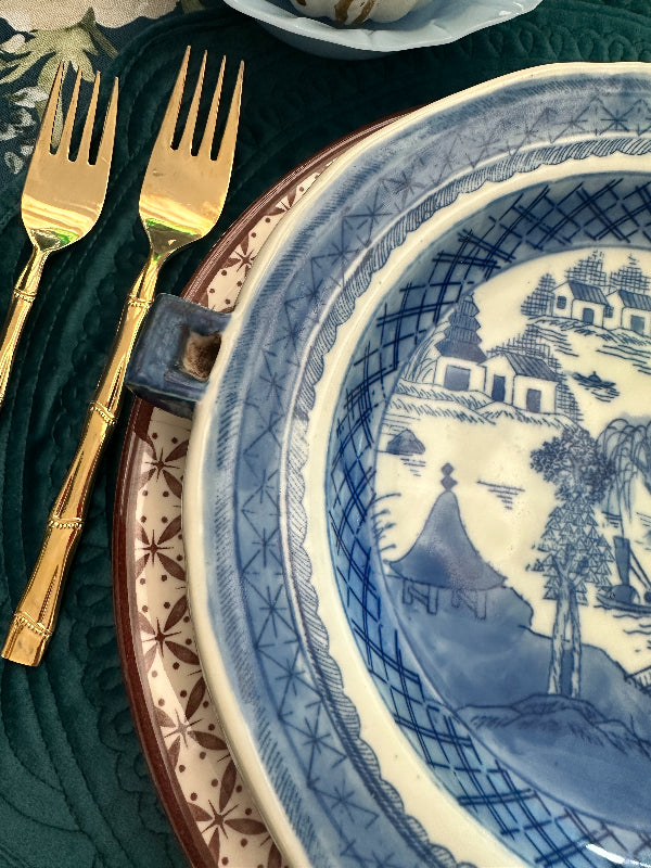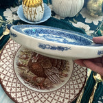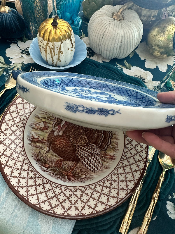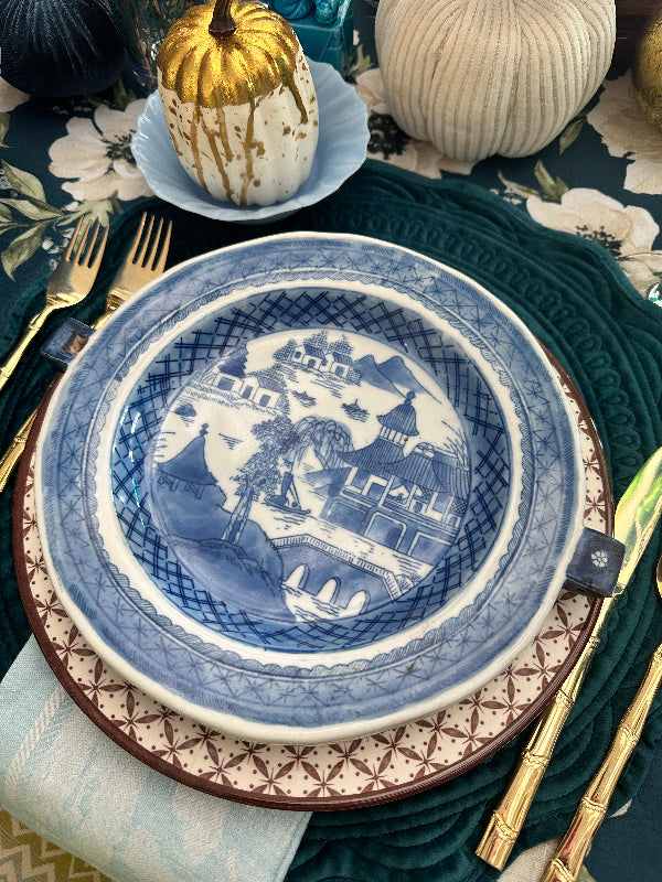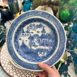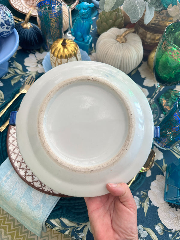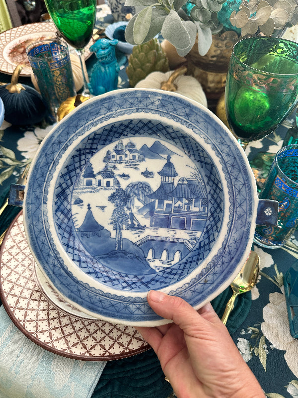 This Canton piece is just stunning. Look carefully at the sides of the plate and you will see 2 small squares where water hot water was added to keep your food warm. I was shocked to see these priced over $400 online. This one is in amazing antique condition with no chips or cracks. Waht a conversation piece!! Perfect to add to a blue and white collection. See picture details as they are part of the description.