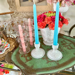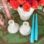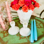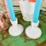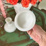 Milkglass is always a great choice because it goes with any style decor. This set of short candle holders have a pretty vine design. Mix and match with other milk glass candlesticks with varying heights and styles. These are in perfect vintage condition and will add a touch of romantic candle light to your bar or table.