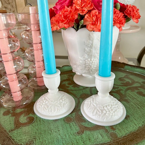 Milk Glass Candle Holders, Grapevine Pattern, Pair