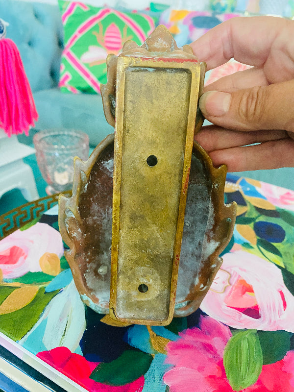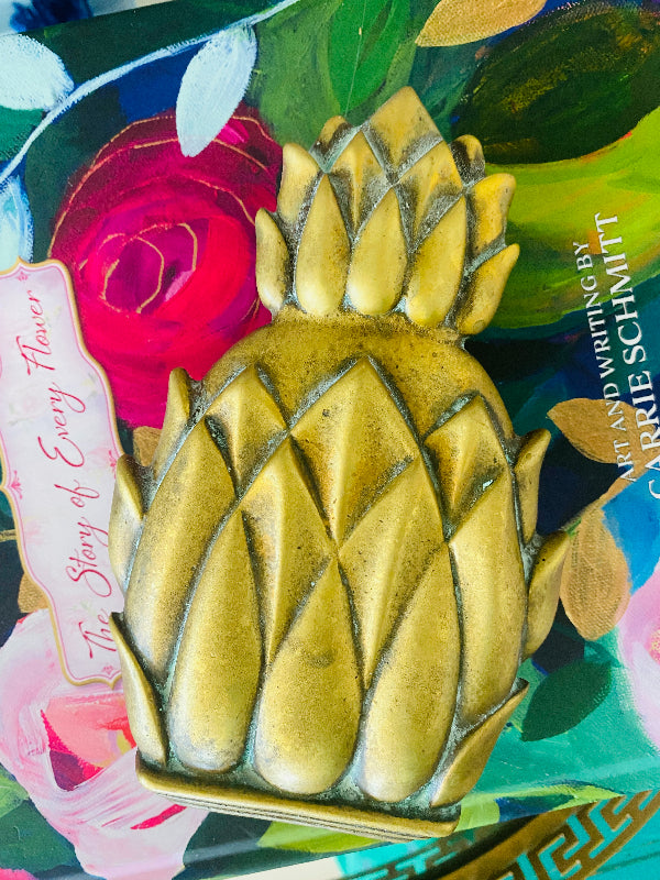 Add that welcoming feel to your front door with this gorgeous brass pineapple door knocker. Pineapples represent welcoming and hospitality.. a very traditional look but blends with any decor. This is great for a smaller space, even a bathroom door. Perfect for indoors or outside. Three dimensional leaves and easy to install.