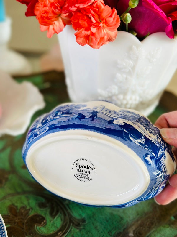 Copeland Spode china began in the 1700s in Staffordshire, England. It became tone of the most famous names in china during the Industrial Revolution. Spode’s greatest achievement was perfecting – and perhaps inventing – bone china, which was white, very translucent and stable when fired. Spode also mastered underglaze blue printing, a technique unknown in China. Vast quantities of inexpensive blue-printed earthenware were made in designs often derived from Chinese originals, such as the Willow Pattern, introduced by Spode in 1790 and which became the best-known pattern in the world.