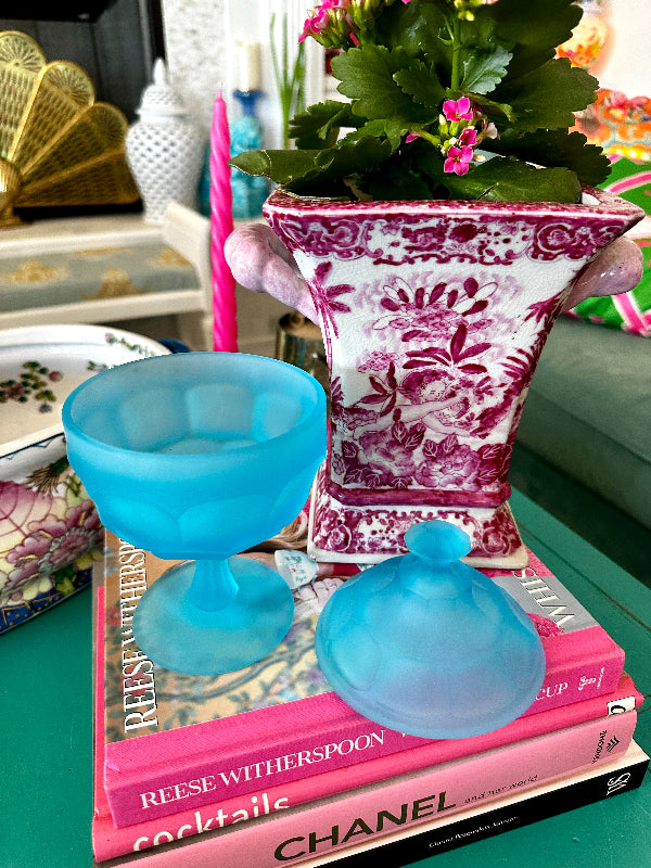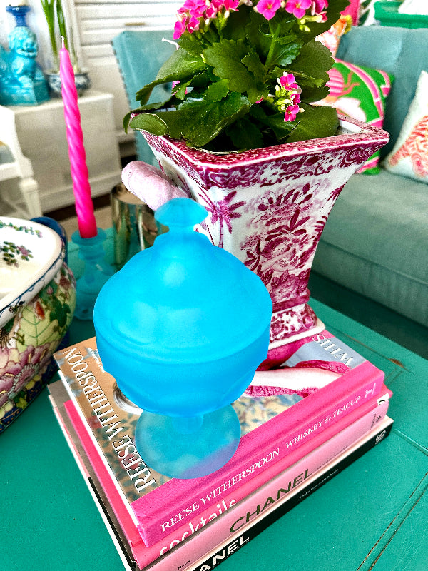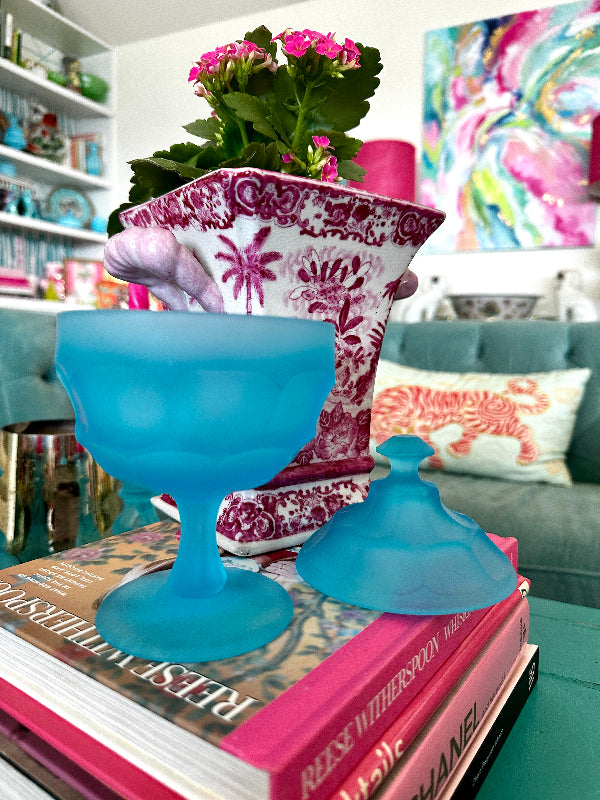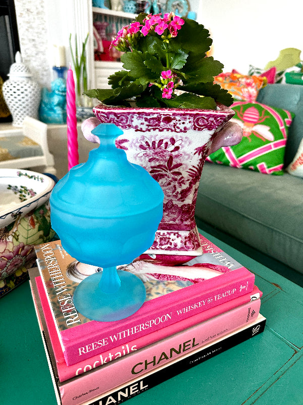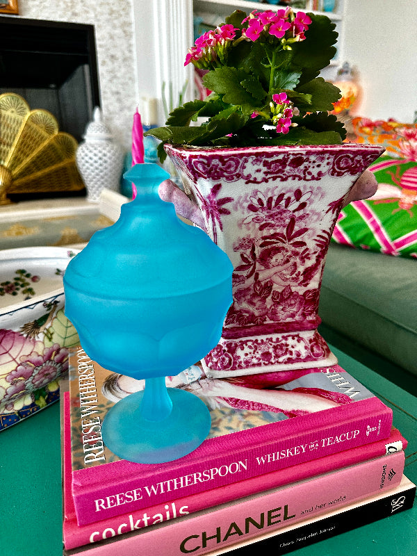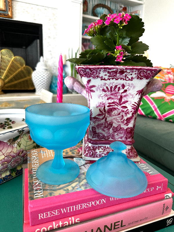 The charming Vintage Candy Dish, crafted by the renowned Westmoreland Glass, features a lidded design atop a graceful pedestal, creating an elegant showcase for your sweet treats. The frosted blue glass, finished in satin, adds a touch of sophistication to any tabletop.
