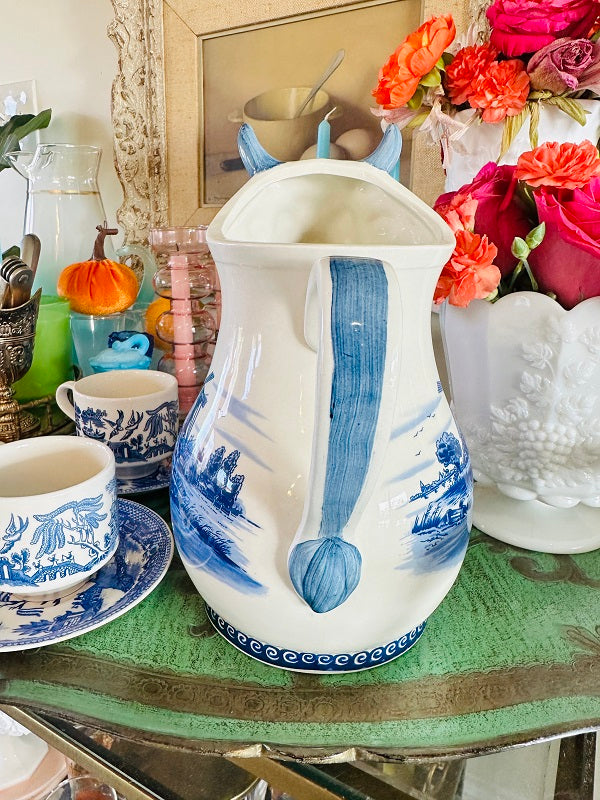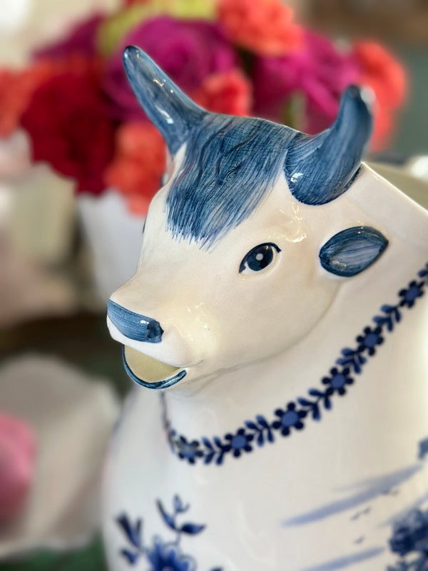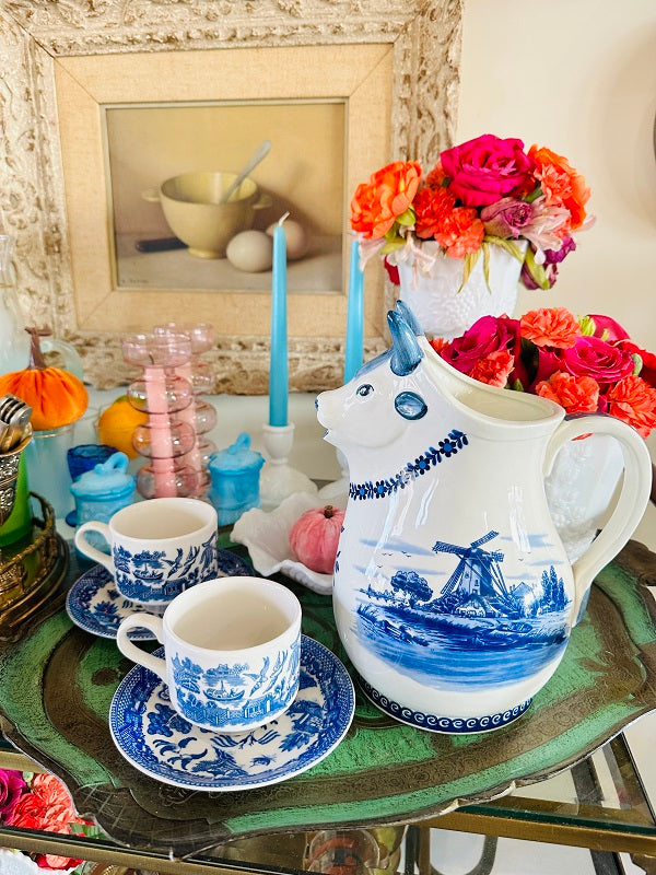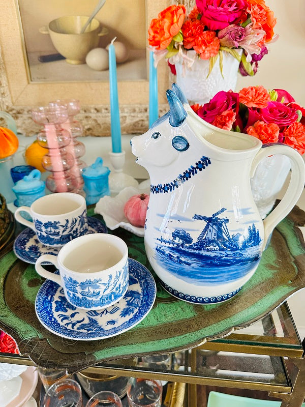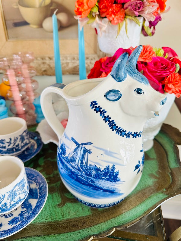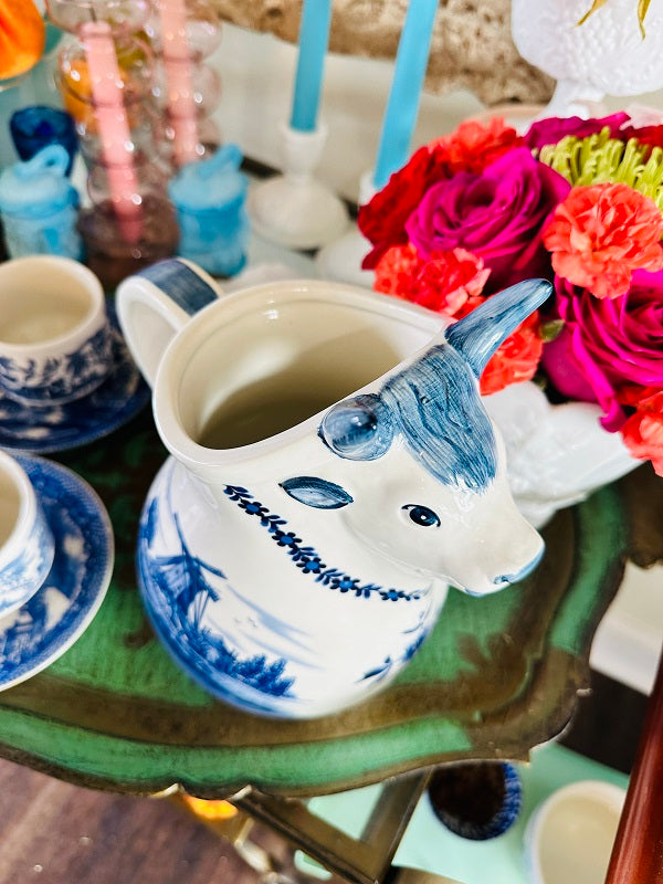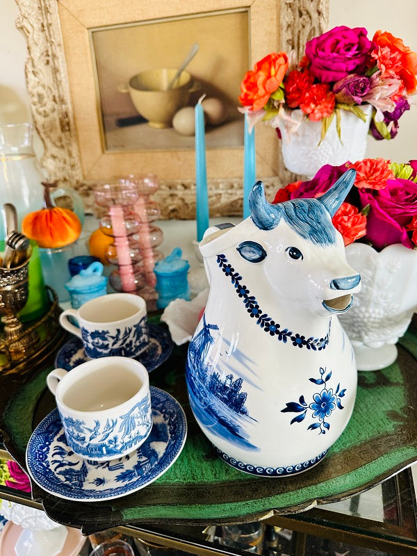 This fun chinoiserie cow pitcher is perfect for milk, of course, but also great for iced tea, lemonade, water or margaritas!! It's a generous size and will add a touch of whimsy to your table or bar. Stamped on the bottom. Pristine condition and perfect for any decor..from farmhouse to eclectic..you can't go wrong with this vintage pitcher.