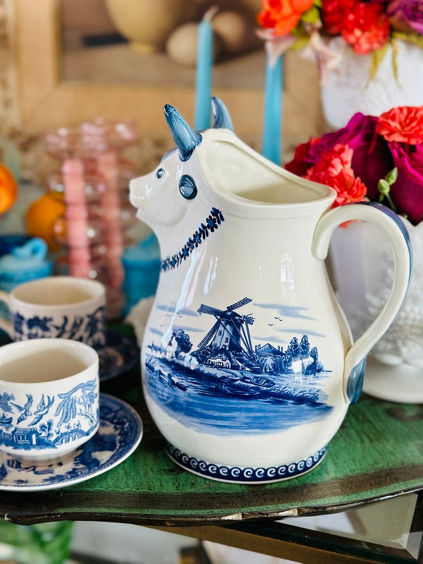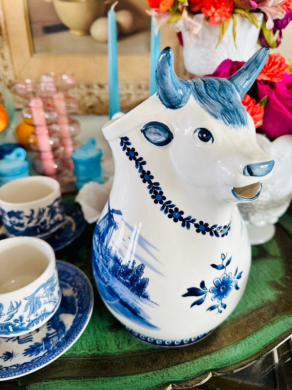 Vintage Delft Cow Pitcher, Chinoiserie, Blue and White